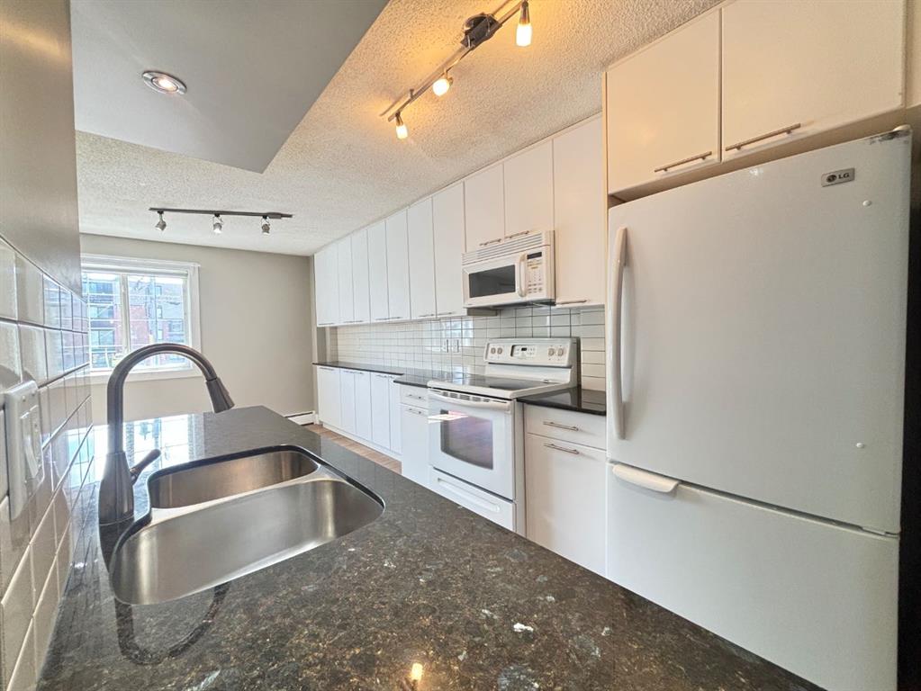 The kitchen shines with granite countertops, stylish cabinetry, and a chic tile backsplash. Both bedrooms are spacious, with easy access to a sleek 4-piece bath. You'll also enjoy in-suite laundry with storage and an assigned covered parking stall.