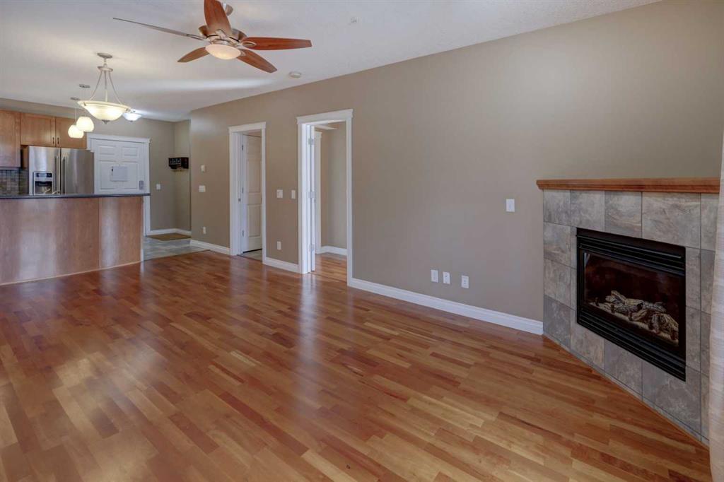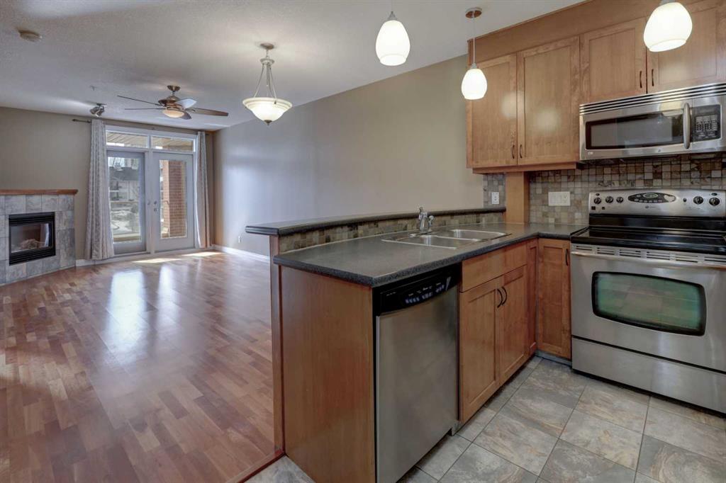 Welcome to this bright & spacious 1-bedroom plus den area condo in the highly desirable community of Spruce Cliff, complete with one oversized titled underground parking stall. This well-designed unit features a very open floor plan with 9-foot ceilings throughout, creating an airy & inviting living space. The living room is highlighted by a cozy corner gas fireplace, while the kitchen offers stainless steel appliances & a convenient breakfast bar, perfect for everyday living or entertaining. A built-in desk in the den area provides an ideal workspace, & the large laundry room adds extra functionality & storage with built-in shelves. The king-sized primary bedroom features a massive walk-in closet with built-in organizers, offering plenty of storage. Fresh paint & knockdown ceilings throughout give the home a clean, modern feel. Step outside to enjoy the large south-facing balcony with glass railing & gas BBQ hookup, perfect for relaxing or entertaining while soaking up the sunshine. Residents enjoy excellent building amenities including a fitness centre, party room, bike storage, & car wash. Ideally located within walking distance to Edworthy Park, the LRT station, Westbrook Mall, restaurants, the Douglas Fir Trail & Shaganappi Golf Course, this home offers outstanding convenience & access to outdoor recreation. You’ll love living here!!!
