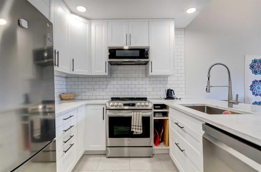 The main level features a spacious second bedroom, a four-piece bathroom, and a recently renovated kitchen complete with updated stainless steel appliances, modern finishes, and a large granite countertop, perfect for cooking and entertaining. Large windows flood the space with natural light, while two private balconies offer sunny exposure and stunning views of the iconic Three Sisters mountain range.