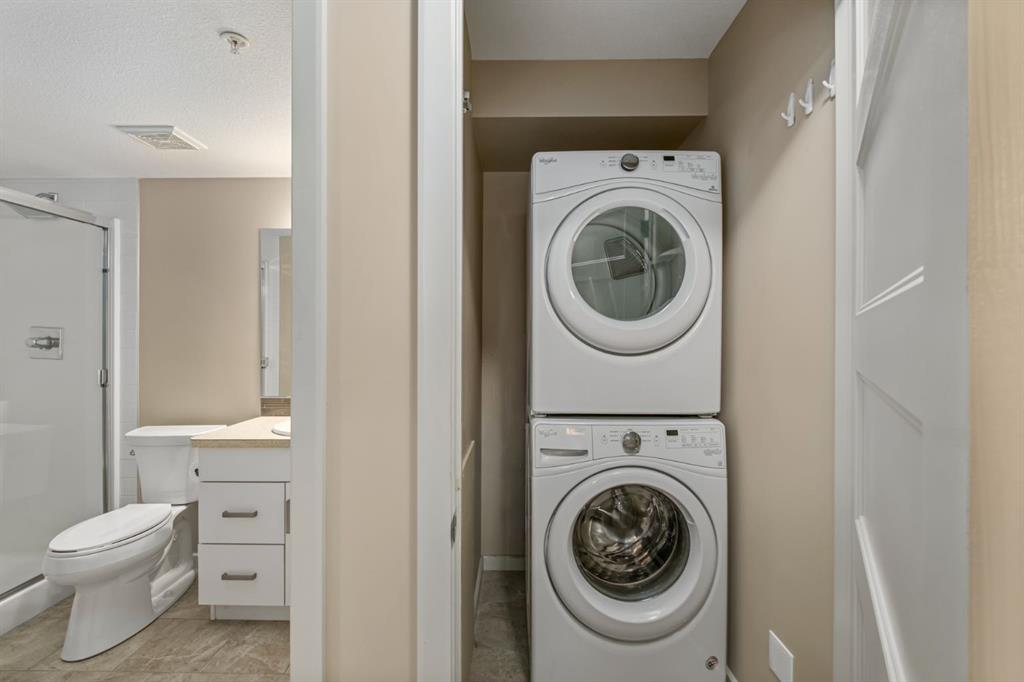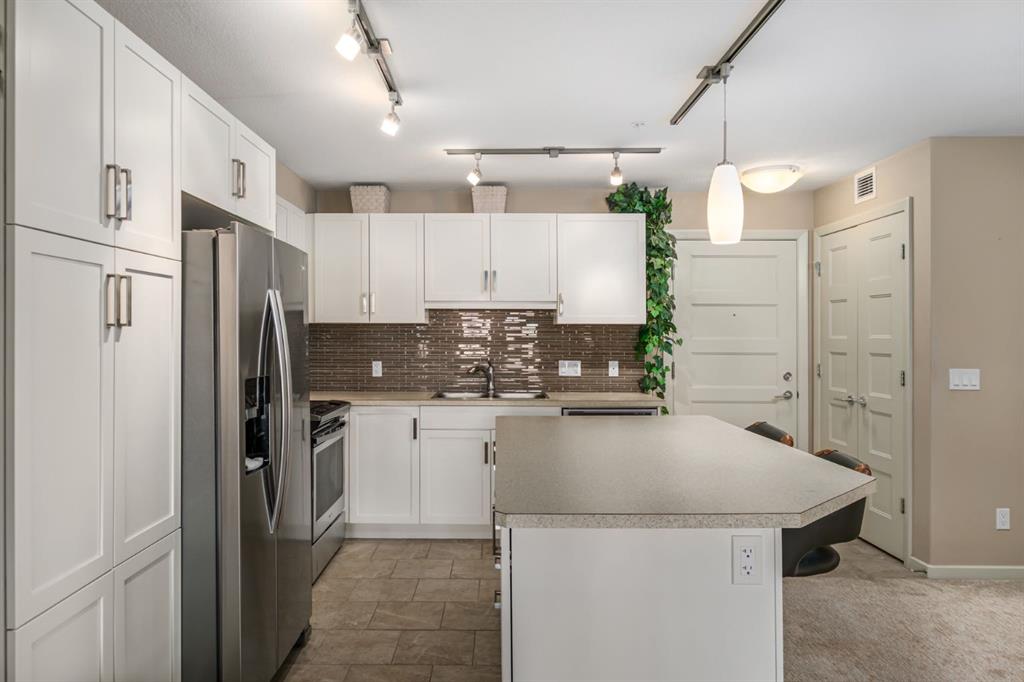 Modern open-concept layout, Stylish - quiet +40 condo community - Main floor unit - Easy access! - Ceramic in-floor heating - In-suite air conditioning - One-owner home, well maintained - Updated kitchen with upgraded backsplash & under-cabinet lighting - Large kitchen island, ideal for entertaining - Over-the-range microwave - Pantry with roll-out shelves Quiet, soft-closing cupboard doors and drawers - Spacious bedroom with dual closets - Blackout window coverings plus curtains for comfort & privacy - Bathroom with walk-in shower & built-in shelving - Cozy carpet in bedroom/living areas - Two titled parking stalls: One directly outside deck door — ideal for groceries & easy access. One secure underground stall with extra storage, located right across from stair access - Elevator access for convenience to underground parking, Perfect for couples with two vehicles or a single person with one vehicle and extra parking for family or guests parking beyond 24 hours - Small pets allowed - Barbecue gazebo for outdoor gatherings - Community turf grass area for pets - Card game days in the amenity room - Free amenities room & landscaped private courtyard - No-smoking - Steps to Kingsview Market (groceries, dining, pharmacy, medical) - Close to parks, ponds & amphitheatre - Easy access to Genesis Place recreation complex - Quick commute to Calgary via Highway 2 & Yankee Valley Blvd. Better check this amazing unit out today!