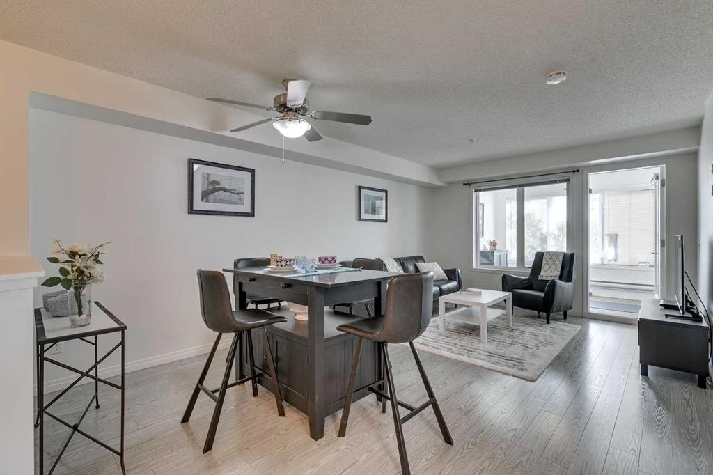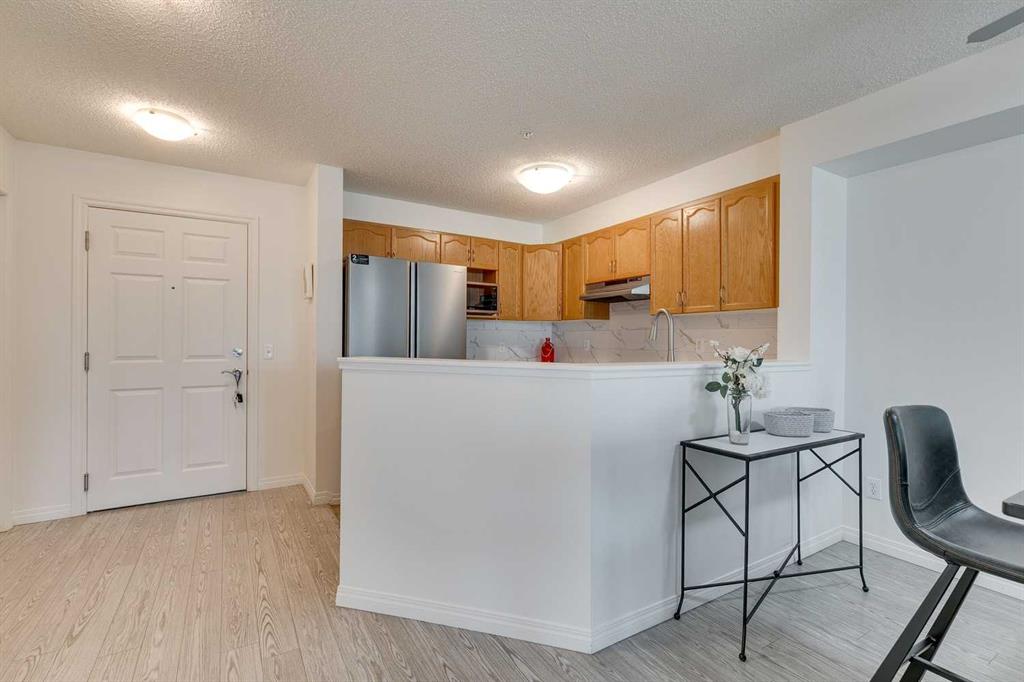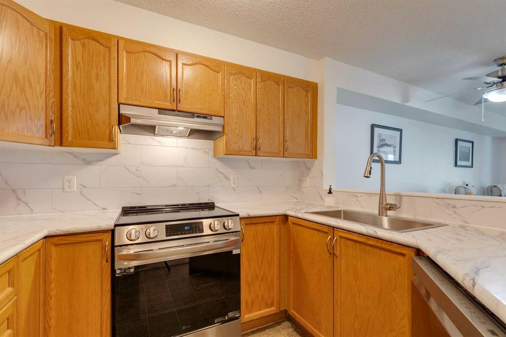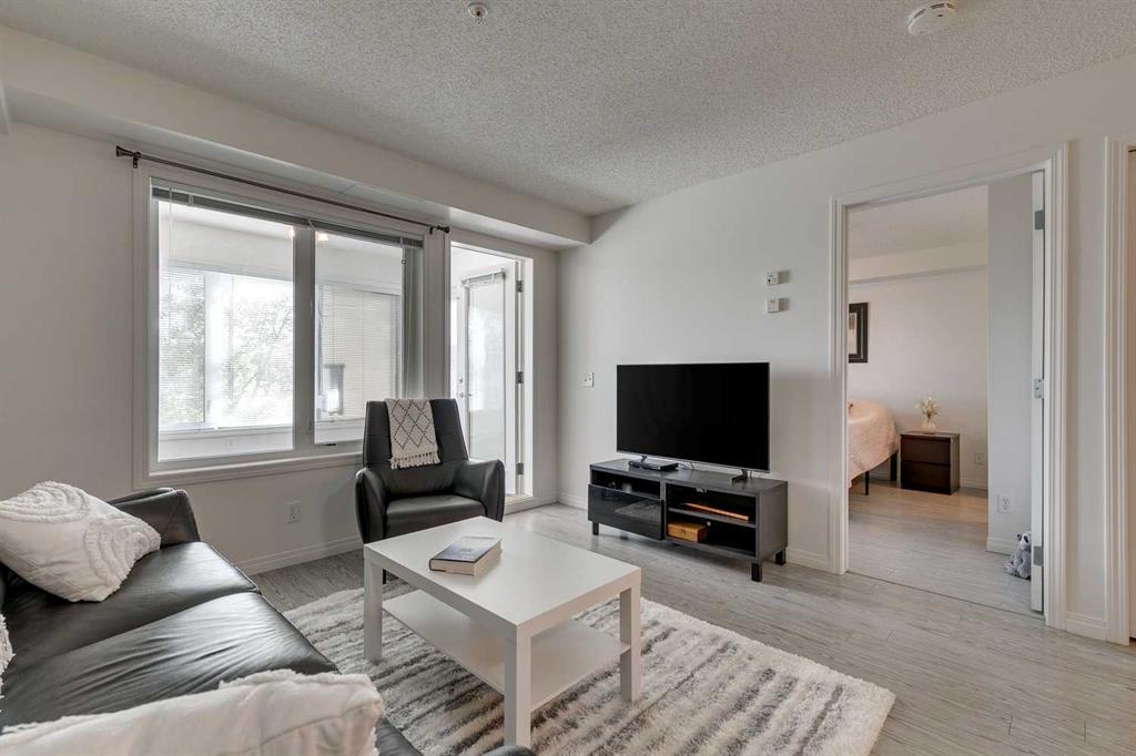 ABSOLUTELY IMMACULATE 814 SQFT ONE BEDROOM PLUS DEN WITH A HEATED SUNROOM! Very open floor plan with vinyl plank flooring & bright sunny east exposure. Freshly painted throughout, upgraded features include new countertops, kitchen sink & tap plus all new top of the line stainless kitchen appliances. Good sized kitchen with excellent counter & cabinet space plus a raised breakfast bar overlooking a good sized dining area & large living room. The den has a sprinkler & could be used as a spare bedroom or an office. The king sized master bedroom easily accommodates a full bedroom suite & includes a spacious walk-in closet. The 4 pc bath has lots of storage plus counter space & the in suite laundry is very conveniently located. The headed sunroom is a huge bonus & is perfect for soaking up the sun or just relaxing with a cup of coffee. The excellent light makes it a perfect sewing or crafting space & your plants will love it. This main floor suite includes assigned heated underground parking & a dedicated storage locker. This 50+ complex is well managed & maintained & features a very active social group with a well equipped activity room. Lots of visitor parking available for your guests & a convenient location close to transit, shopping & easy access to the new Ring Road System.