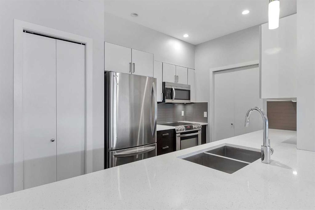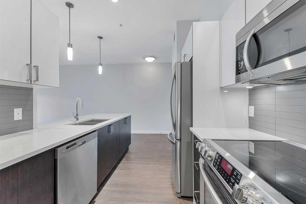 This luxurious one-bedroom, one-bathroom condo offers a spacious and open floor plan, perfect for entertaining or relaxing after a long day. Larger than many other one-bedroom units in the area, it features sleek modern finishes throughout, including quartz countertops, stainless steel appliances, 9-ft ceilings, in-suite laundry, laminate flooring, and carpet. The unit itself is 688 sq ft plus a 60 sq ft balcony, giving you a total of 748 sq ft of living space. It also comes with the convenience of underground parking and a storage locker.