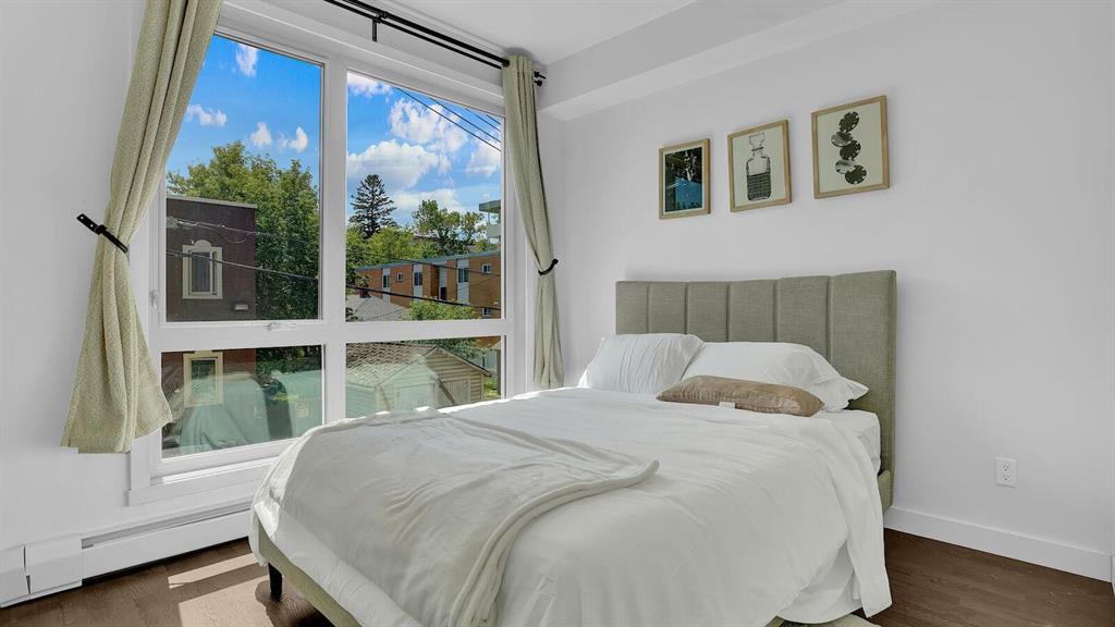 Introducing an exceptional real estate opportunity. Welcome to this stunning 2 bed/2 bath downtown view condo, complete with underground parking and storage. This unit offers an amazing layout and is equipped with all the builder upgrades, making it arguably the best in the building. As you enter, you'll be captivated by high ceilings and double stacked windows, creating a bright and spacious atmosphere. The open floor- plan is thoughtfully designed to maximize space and comfort, providing an executive feel. Large primary bedroom, unit has breathtaking downtown views and features a walk-through closet leading to a spa-inspired en-suite bathroom. The second bedroom and bathroom are conveniently separated by the open concept living area, ensuring privacy and functionality. This unit offers a range of impressive features, including engineered hardwood floors, quartz counters, a gas range, undermount lighting in the bathrooms, air-conditioning, and in-suite laundry. Enjoy the outdoors from the corner balcony with a gas line for your barbecue. Located in a well-managed and pet-friendly building, this condo is situated in one of the most vibrant areas of the city. With the river, numerous restaurants, nightlife, and shopping on 17 Ave just steps away, you'll experience the finest in inner-city living.