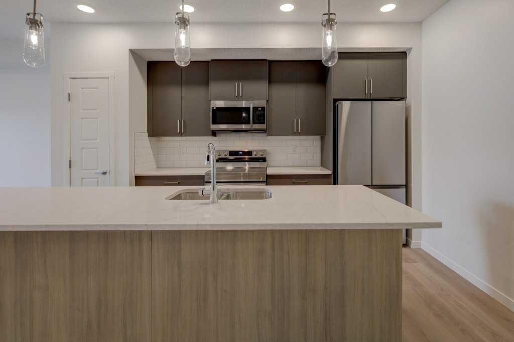 INTRODUCING GLACIER RIDGE, IN BEAUTIFUL NORTHWEST CALGARY. BUILT BY CEDARGLEN LIVING, WINNER OF THE Customer Insight BUILDER OF CHOICE AWARD, 6 YEARS RUNNING! BRAND NEW "GR04" unit with high-spec features. You will feel right at home in this well thought-out, 590.72 RMS sq.ft. 1 bed, 1 bath home with open plan, 9' ceilings, LVP flooring throughout (NO CARPET), Low E triple glazed windows, BBQ gas line on the patio, Fresh Air System (ERV), A/C rough-in, and so much more. The kitchen is spectacular with full height, two tone cabinets, quartz counters, upgraded bank of drawers for pots and pans, undermount sink, rough-in water line to the fridge and S/S appliances. The island is extensive with built in flush breakfast bar, which transitions into the spacious living area, perfect for entertaining. The spacious primary bedroom has a large bright window (triple pane windows) and sizeable walk-in closet. Right beside your bedroom is a 4pc bath with quartz counters, upgraded tiles to the ceiling, and undermount sink. Nearby is the spacious laundry/storage room, this is a must see (washer & dryer included). Highlights include: Hardie board siding, designer lighting package, sound reducing membrane to reduce sound transmission between floors, clear glass railing to balconies and 1 titled underground parking stall included. A once in a lifetime community in Northwest Calgary. Framed by views of the Rocky Mountains and distinguished by natural coulees that cross the land, Glacier Ridge offers a rare chance for families to live in a new community. PET FRIENDLY COMPLEX, IMMEDIATE POSSESSION AVAILABLE AND DON'T FORGET TO CHECK OUT THE VIRTUAL TOUR.
