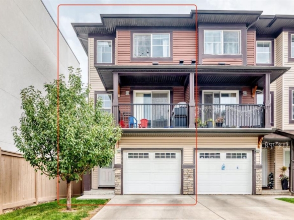 This charming 2-bedroom, 2.5-bath townhome in the family-friendly complex of Copperfield Village is perfect for first-time home buyers or investors looking for low-maintenance living. Conveniently located steps from the bus stop and within walking distance to parks, schools, and local amenities — this home is a must-see! Upon entering, you’ll find a bright, open entryway with tiled flooring and direct access to the single attached garage. The upper level features a spacious and cozy living room with soaring ceilings and access to the back patio that opens to street level. Continue up to the next level, where you’ll discover an open-concept kitchen and dining area featuring maple cabinetry, black appliances, a pantry for extra storage, and a second balcony just off the dining space. This level is completed by a 2-piece bath and a convenient laundry room with upper cabinets for added organization. The top floor offers two generous primary bedrooms, each with its own private ensuite bath and walk-in closet — ideal for roommates or guests.  The finished basement provides additional living space that can easily serve as a rec room, office, or home gym, along with plenty of storage.