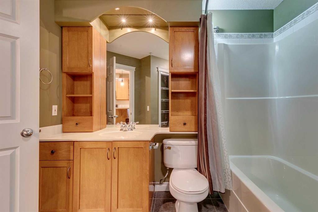 Welcome to Copperwood! This beautifully maintained second-floor suite in Building 2000 offers over 1,000 sqft. of comfortable living. Soaring 9-ft ceilings, hardwood floors, Corian countertops, tile accents, and sleek black appliances highlight the pride of ownership throughout.The open-concept layout features a spacious kitchen with plenty of prep space, a bright dining area, and a welcoming living room featuring by a cozy gas fireplace. Step out to your west-facing balcony, with a convenient BBQ gas line for year-round grilling. Two generous bedrooms provide excellent flexibility, including a primary suite with a full ensuite bath, plus a second 4-piece bathroom for guests. Additional highlights include an oversized heated underground parking stall (#80), a storage locker (#77), and access to Copperwood’s outstanding amenities—fitness centre, recreation room, and ample visitor parking. Just 10 minutes from downtown and steps to the LRT, library, shopping, and scenic walking paths, this home blends urban convenience with a tranquil setting.