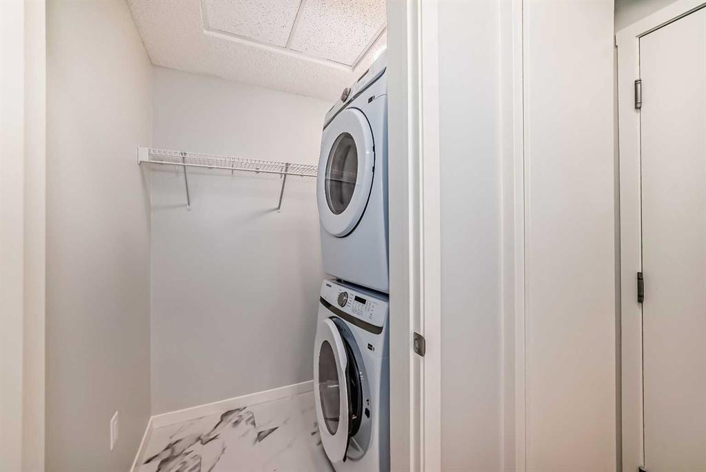 The spacious primary bedroom offers a 3-piece ensuite and a custom wire-shelved closet. The second bedroom, located on the opposite side of the unit for privacy, features a walk-in closet and easy access to another 4-piece bathroom. A convenient in-suite laundry and storage area completes the layout.