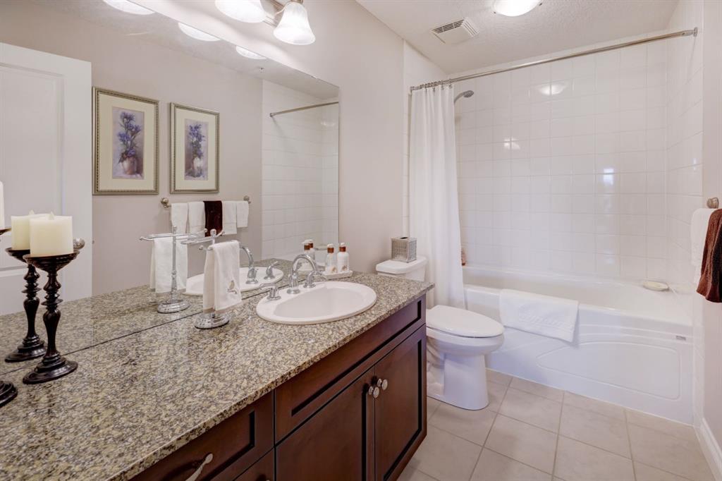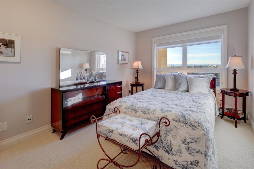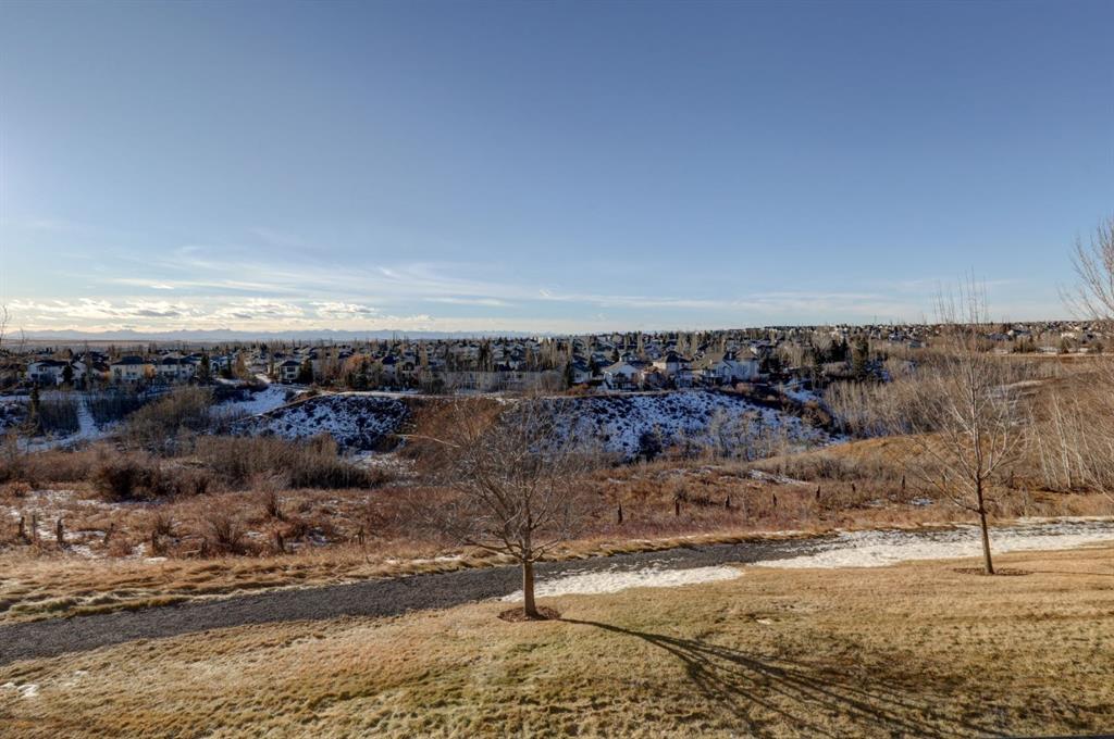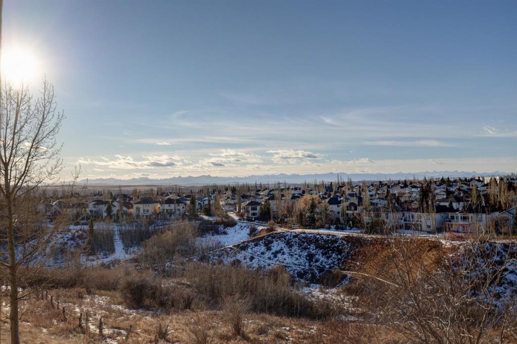 OPEN HOUSE - SATURDAY, JANUARY 17, 2:00-4:00PM. Perched in the heart of Tuscany's coveted Villa d'Este, this impeccable second-floor two-bedroom condo backs directly onto a serene coulee valley—your private gateway to nature right in the city. Step onto the expansive covered balcony to soak in stunning mountain vistas and unwind amid walking paths and trails that wind through the ravine just below, blending urban convenience with peaceful escapes. Meticulously maintained to feel like new, the home features fresh neutral paint throughout and smart upgrades, including convenient pull-out drawers in the cabinets for effortless organization. The bright, open-concept main living space is enhanced by air-conditioning, gleaming engineered hardwood floors, and wall-to-wall windows that frame those incredible views. The modern kitchen flows seamlessly with rich maple cabinetry, a spacious island, granite counters, undercabinet lighting, and stainless steel appliances. Two airy bedrooms offer quiet retreats, highlighted by the primary suite's dual closets and luxurious ensuite with soaker tub, double vanities, and oversized shower. Additional highlights include tiled bathroom floors, Hunter Douglas blinds, a reverse osmosis system, a practical laundry/storage room with built-ins, and the ultimate lock-and-leave lifestyle: two titled heated underground parking stalls plus a dedicated storage locker. Surrounded by friendly neighbours who create a true sense of community, and just minutes from the Tuscany Club, market, LRT, and shopping—this is effortless, view-inspired living at its best.