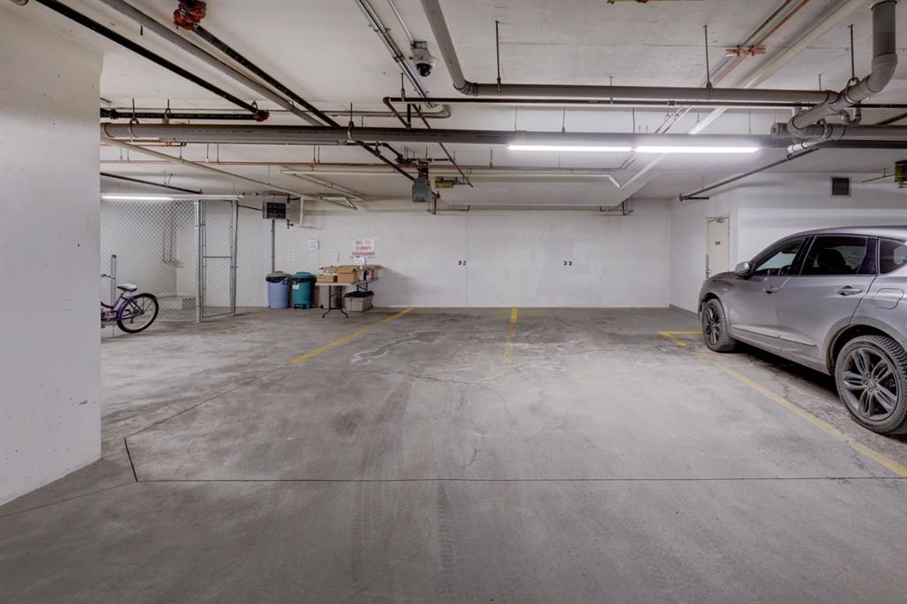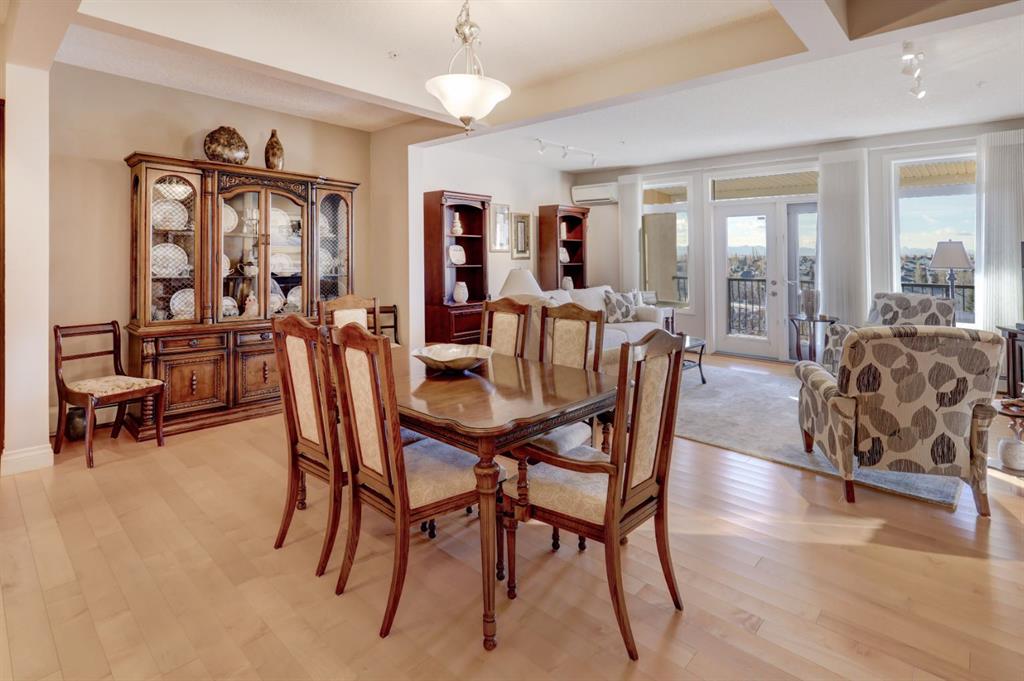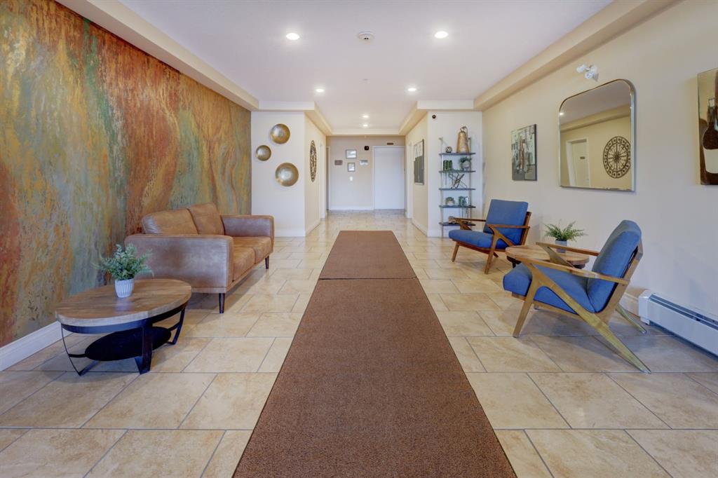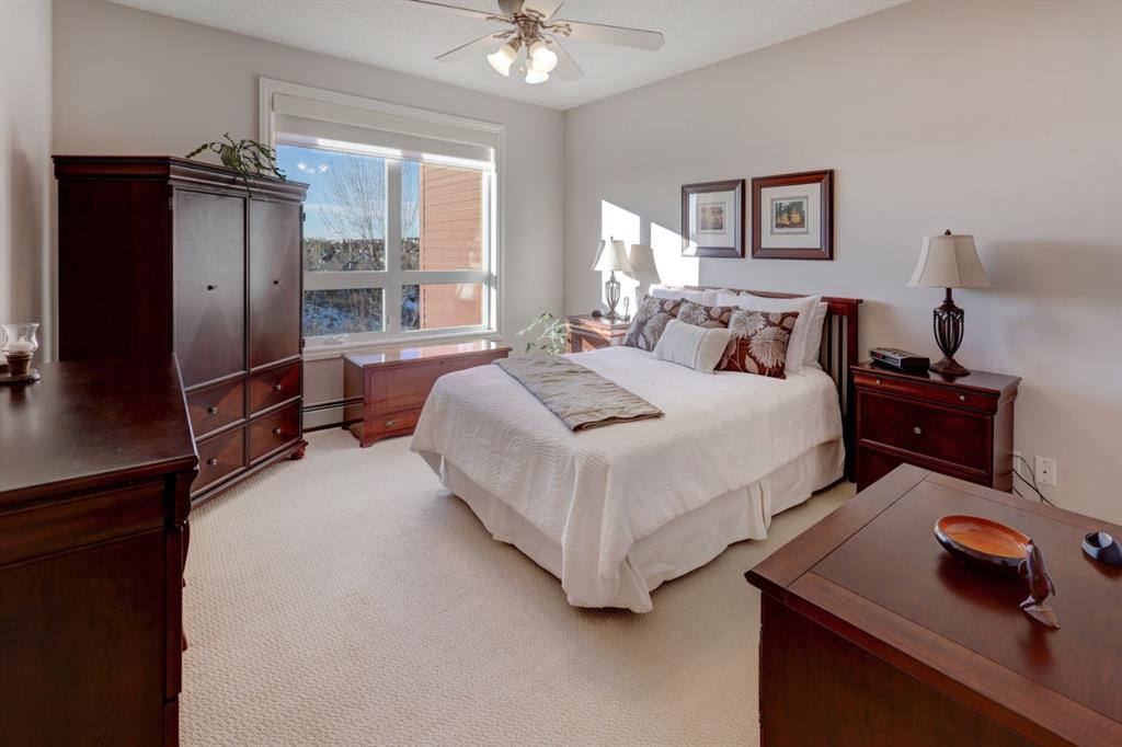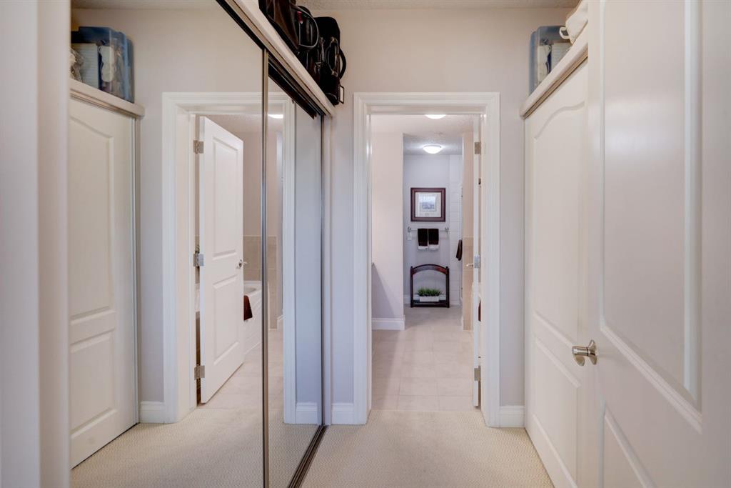 OPEN HOUSE - SATURDAY, JANUARY 17, 2:00-4:00PM. Perched in the heart of Tuscany's coveted Villa d'Este, this impeccable second-floor two-bedroom condo backs directly onto a serene coulee valley—your private gateway to nature right in the city. Step onto the expansive covered balcony to soak in stunning mountain vistas and unwind amid walking paths and trails that wind through the ravine just below, blending urban convenience with peaceful escapes. Meticulously maintained to feel like new, the home features fresh neutral paint throughout and smart upgrades, including convenient pull-out drawers in the cabinets for effortless organization. The bright, open-concept main living space is enhanced by air-conditioning, gleaming engineered hardwood floors, and wall-to-wall windows that frame those incredible views. The modern kitchen flows seamlessly with rich maple cabinetry, a spacious island, granite counters, undercabinet lighting, and stainless steel appliances. Two airy bedrooms offer quiet retreats, highlighted by the primary suite's dual closets and luxurious ensuite with soaker tub, double vanities, and oversized shower. Additional highlights include tiled bathroom floors, Hunter Douglas blinds, a reverse osmosis system, a practical laundry/storage room with built-ins, and the ultimate lock-and-leave lifestyle: two titled heated underground parking stalls plus a dedicated storage locker. Surrounded by friendly neighbours who create a true sense of community, and just minutes from the Tuscany Club, market, LRT, and shopping—this is effortless, view-inspired living at its best.