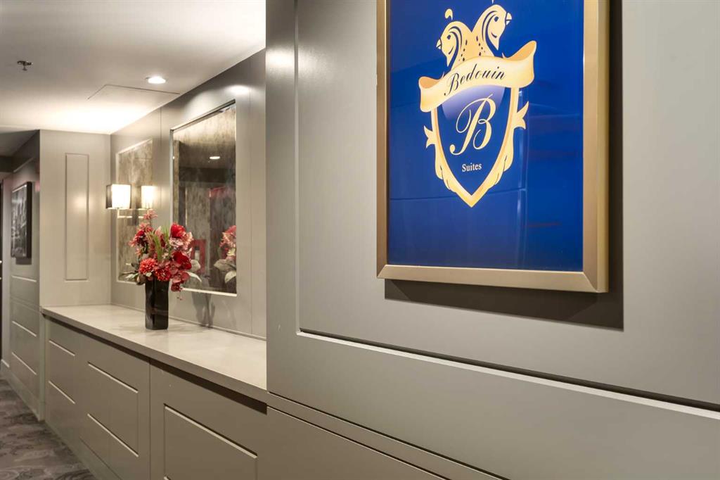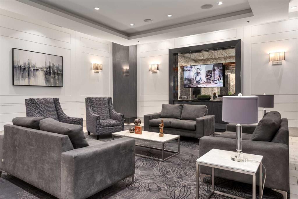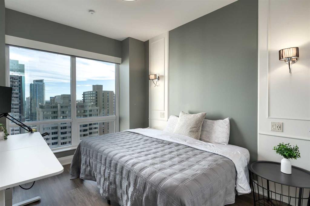 Experience elevated sophistication on the exclusive BEDOUIN Floor at Vogue! One of only four floors in the building with these premium upgrades, this gorgeous corner suite is soaked in natural light and showcasing panoramic views of the city skyline and Rocky Mountains. The BEDOUIN Collection offers refined details including designer lighting with dimmers, custom bedroom paneling with wall sconces, and premium finishes throughout.The open concept kitchen features two-tone cabinetry, quartz counters, under-cabinet lighting, a custom island with bar seating, tile backsplash, and upgraded stainless-steel appliances including a chimney-style hood fan. The chic living space is complete with a book matched built-in walnut entertainment unit. The sizeable corner balcony features a gas BBQ line, making BBQing a dream. The primary bedroom, wrapped in windows, features a spa-inspired ensuite with quartz countertops, tile floors, modern vanity with storage, and a full-height tiled tub/shower combo. The second bedroom offers flexibility as a guest room or home office and is steps from its own full bathroom with a floor-to-ceiling tiled shower and upgraded glass door. The bedrooms are ideally separated for ultimate privacy.Additional highlights include in-suite laundry with new dryer (2025), a titled secure heated underground parking stall with storage, and central A/C. Vogue offers an elegant, hotel-style lobby with full-time concierge plus exceptional amenities: a state-of-the-art fitness centre, yoga studio, billiards and party rooms, and the 36th-floor Sky Lounge with rooftop terraces and breathtaking 360° mountain and city views. Walk to Prince’s Island Park, Kensington Village, the LRT (free zone), boutique shops, fine dining, cafes, and Calgary’s +15 network—all just steps away. This is luxury urban living at its finest.