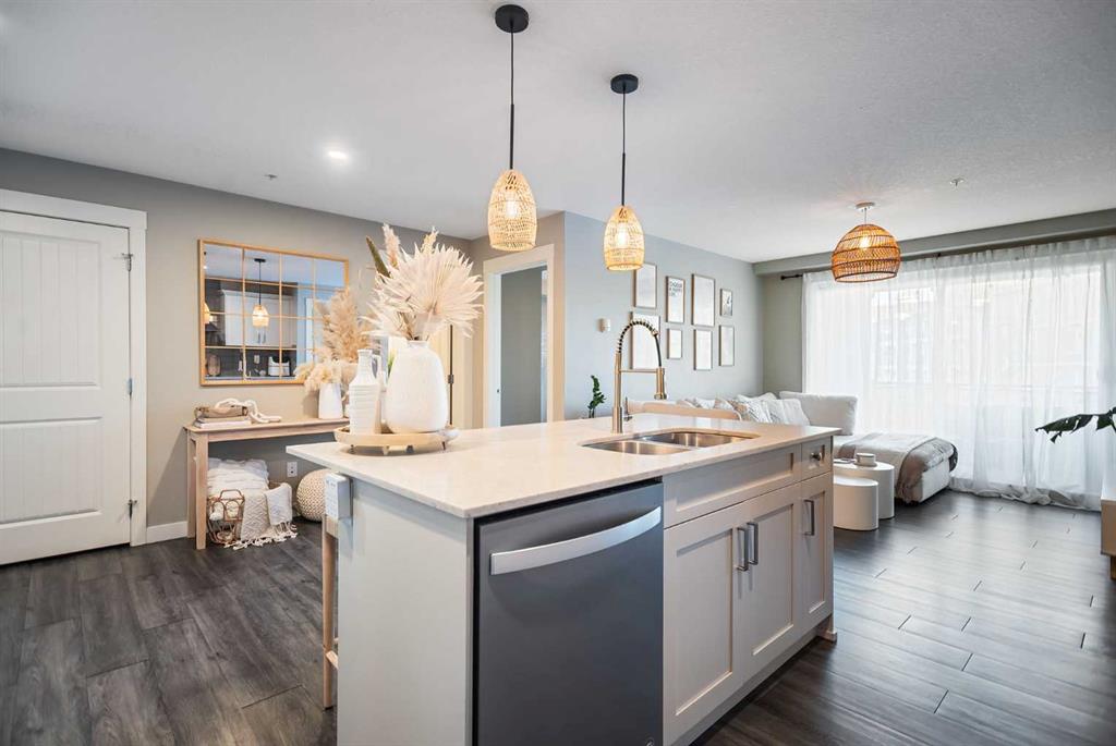 Welcome to Auburn Walk, a thoughtfully designed condo community in one of Calgary’s most loved lake neighbourhoods. This bright and beautifully maintained 2-bedroom, 2-bath home combines modern finishes with a warm, comfortable feel—perfect for those who value both style and everyday practicality. Step inside to a spacious open-concept layout that’s ideal for entertaining or simply enjoying a relaxed evening at home. The kitchen is impressive, featuring crisp white cabinetry, gleaming quartz countertops, stainless steel appliances, a built-in oven and microwave, upgraded range hood, and a generous walk-in pantry. The oversized island offers additional storage, a large double sink, and plenty of space for seating—making it the perfect spot for casual meals or morning coffee.
