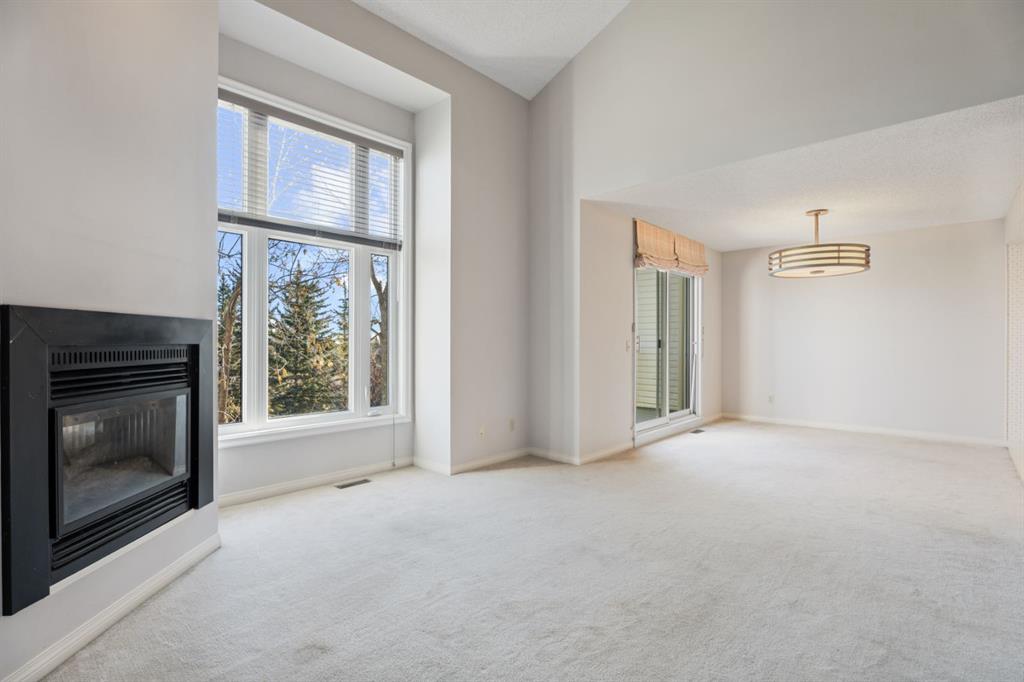 The main floor features a large kitchen with plenty of storage, opening to a spacious dining area and a large living room with a stunning vaulted ceiling that soars up to the second floor. A cozy gas fireplace and upgraded triple-paned windows on the main and upper levels fill the space with natural light while enhancing comfort and efficiency. Step onto your private balcony and enjoy the peaceful setting — this home backs directly onto a park and the community pathway system, providing privacy and a connection to the outdoors.
