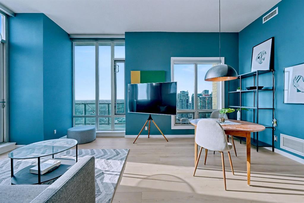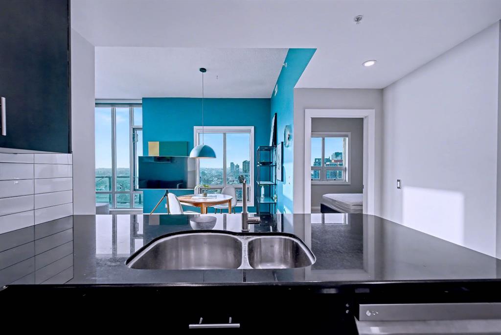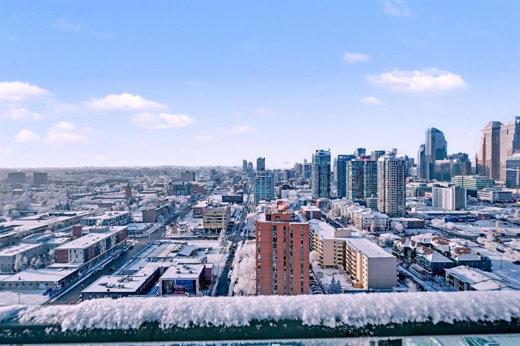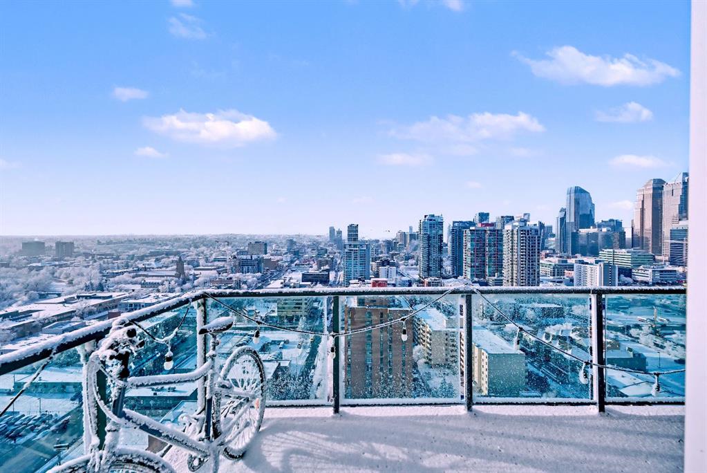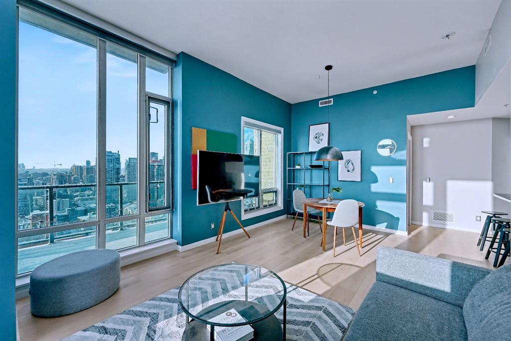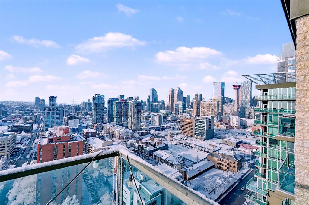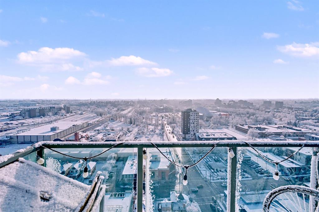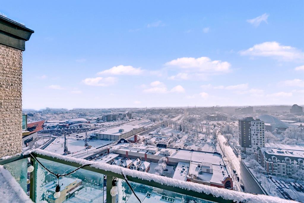 Upgraded 2 bedroom, 2 bathroom condo in the heart of Victoria Park, offering southwest corner 22nd-floor panoramic views of the Stampede Grounds, Elbow River, MOUNTAINS, and downtown. Bright, open-concept layout with OVER 10’ CEILINGS, FLOOR-TO-CEILING WINDOWS filling the space with natural light, updated paint and flooring, and a modern kitchen featuring granite counters, full-height cabinetry, white tile backsplash, and updated stainless steel appliances. Bedrooms on opposite sides include a primary with 4-piece ensuite, plus additional storage for convenience. Enjoy a private patio with GAS BBQ HOOKUP—perfect for outdoor entertaining. In-unit laundry, STORAGE, heated secured UNDERGROUND TITLED PARKING with bike rack, and access to a fitness facility, sauna, hot tub, and social room. Steps to C-Train, shopping, restaurants, and the Scotiabank Saddledome.