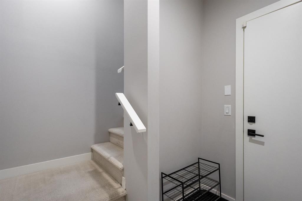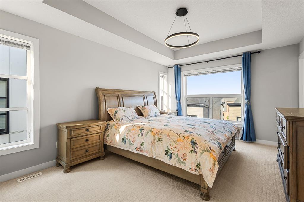 Upstairs, the primary retreat impresses with a recessed ceiling, oversized west-facing windows, a walk-in closet, and a private ensuite. From here, enjoy breathtaking views of the Rockies and Calgary’s glowing sunsets. Two additional bedrooms feature sloped ceilings and oversized windows, creating bright, welcoming spaces for family or guests. A full 3-piece bathroom and convenient upstairs laundry complete this level.