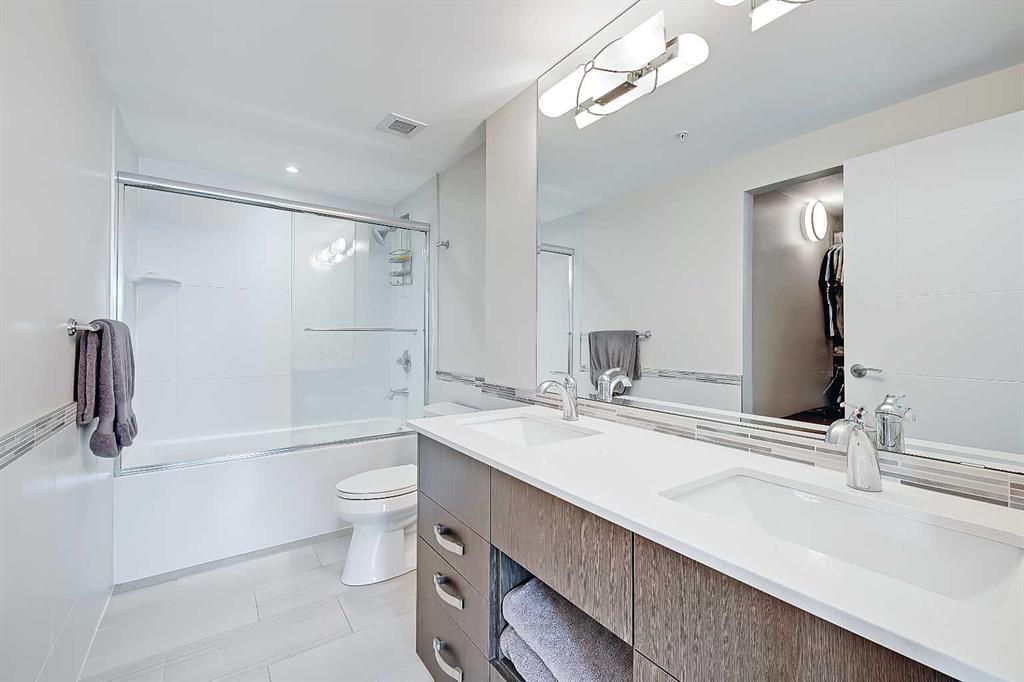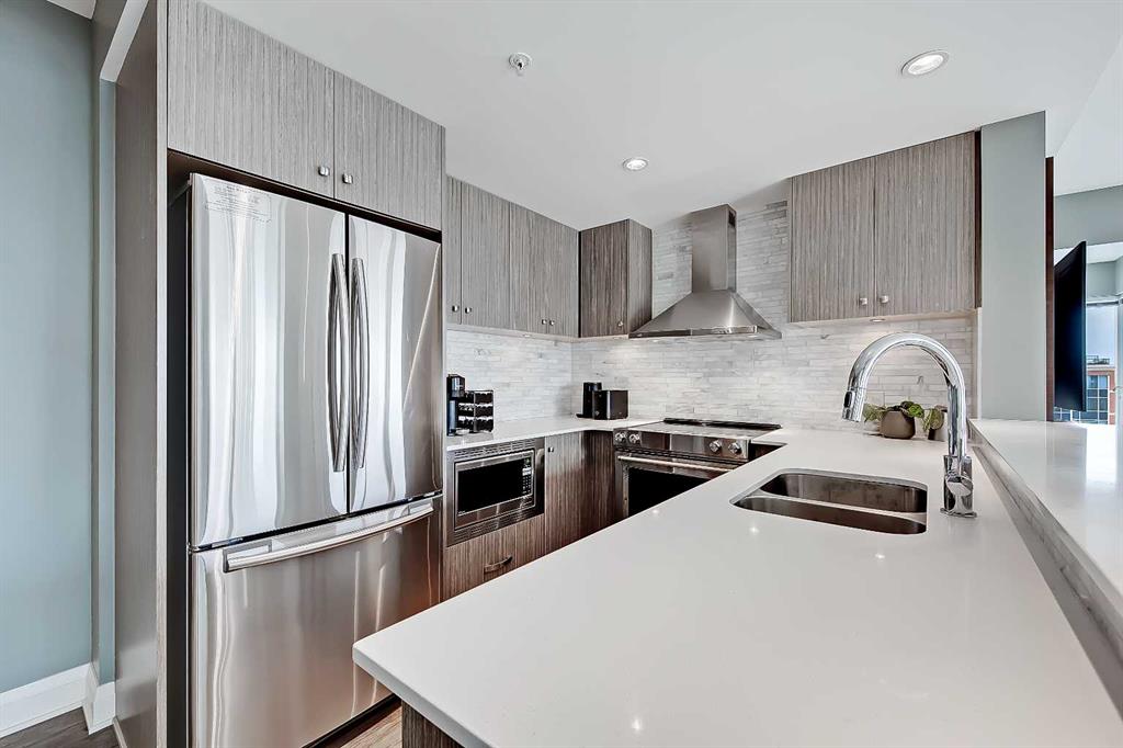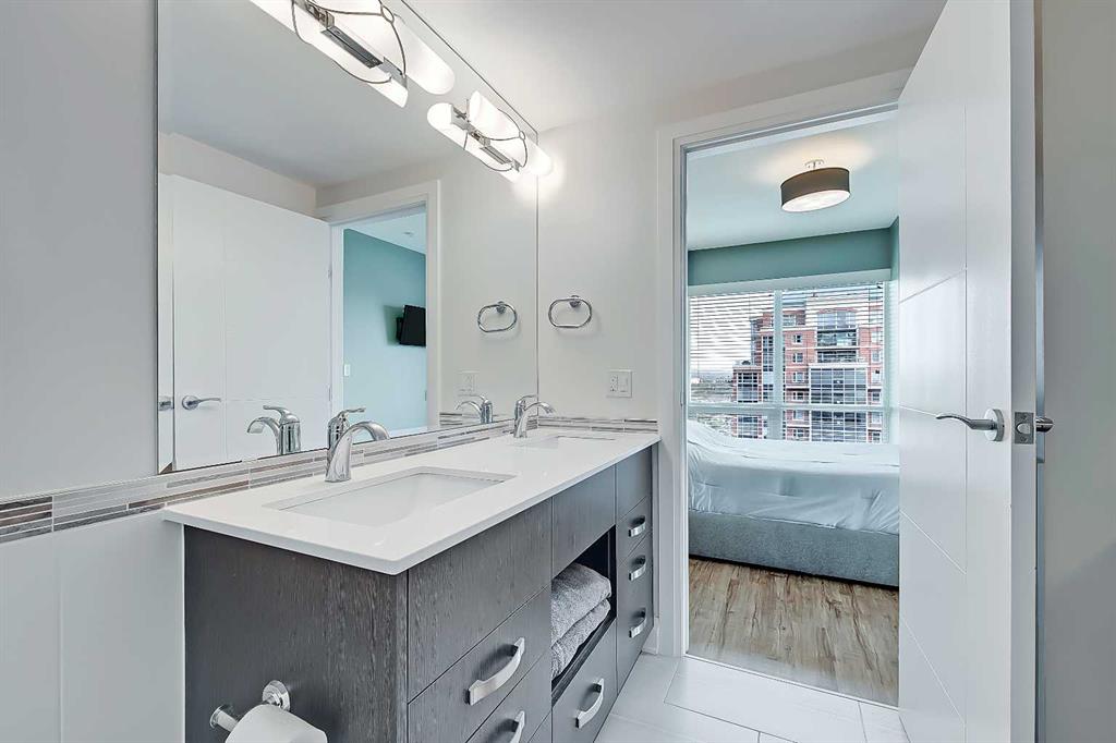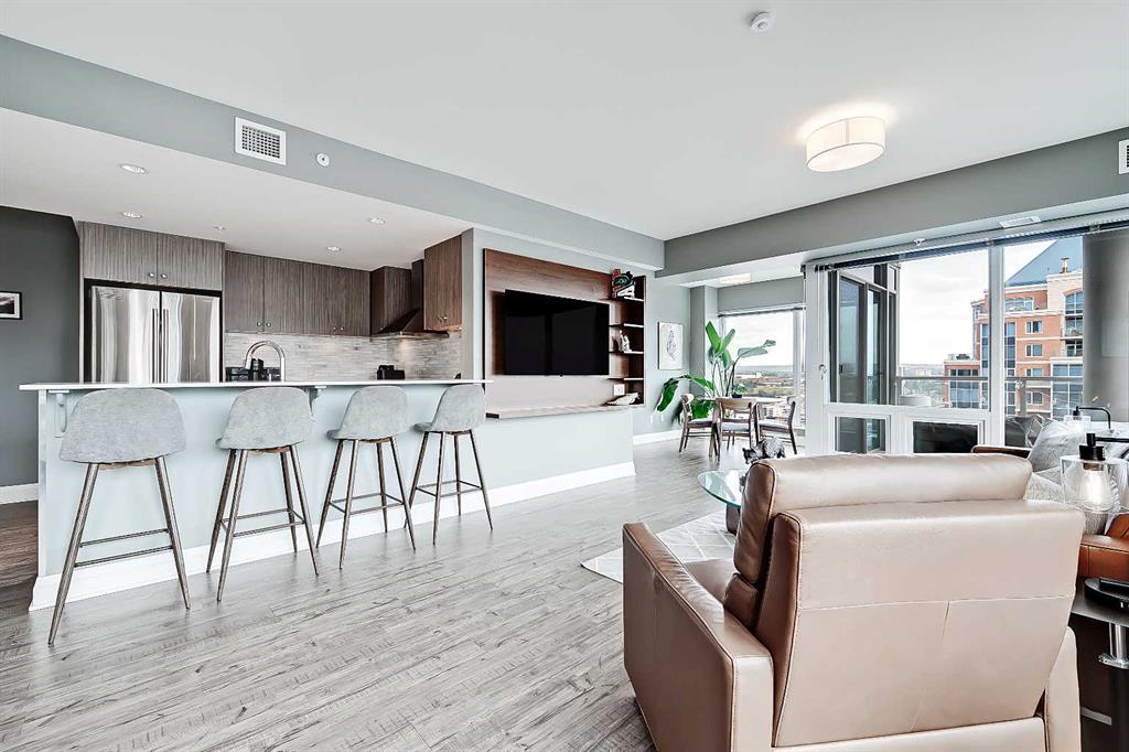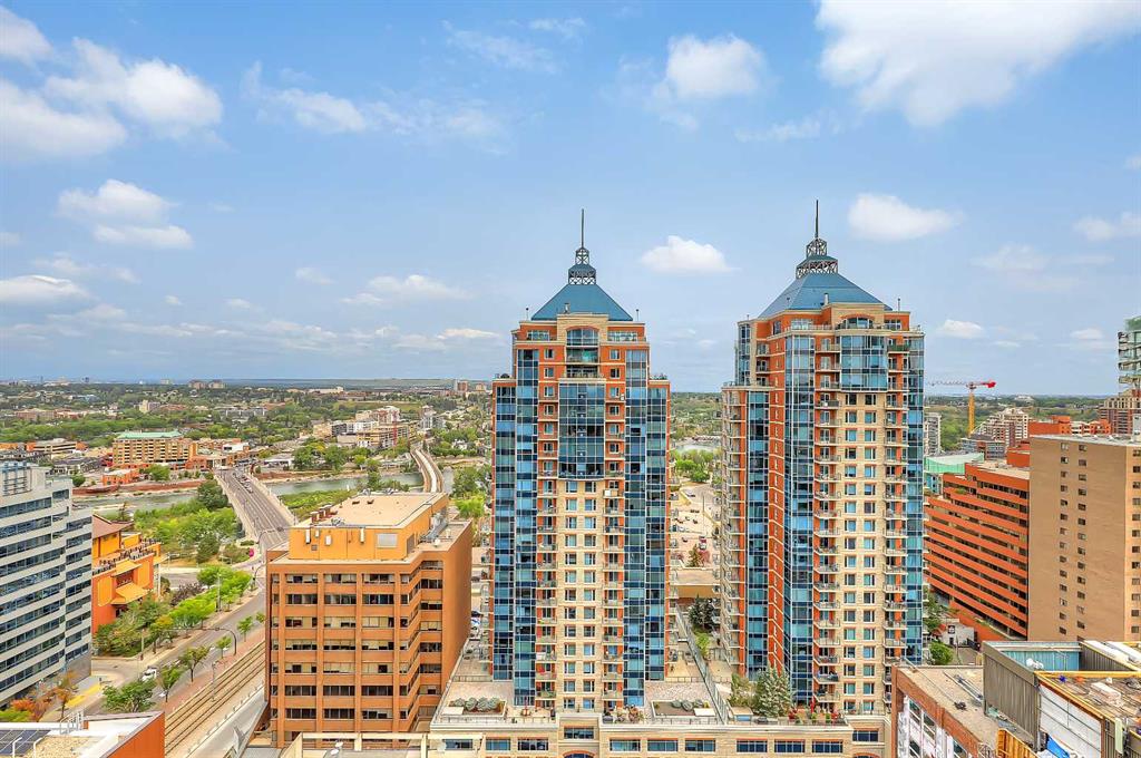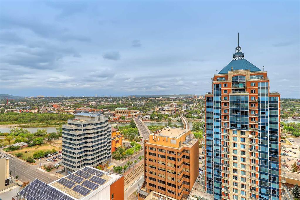 *VISIT MULTIMEDIA LINK FOR FULL DETAILS INCLUDING IMMERSIVE 360 VT & FLOORPLANS!** Wow, check out this 2 bed & den/2bath NE CORNER UNIT with PHENOMENAL RIVER & CITY VIEWS! There are only 4 floors in the upscale Vogue building that were specially customized for Bedouin Suites, and this is one of them! EXCLUSIVE ‘BEDOUIN’ FEATURES include upgraded hallways and common areas, as well as INCREDIBLE UNIT UPGRADES like upgraded appliances & lighting including dimmers throughout, custom bedroom panelling including convenience plugs and sconce lighting, upgraded bathrooms with tile wainscoting and glass shower doors, built-in closet organizers throughout, built-in walnut entertainment units, a Smart Sensor energy management system for the eco-minded buyer and MORE! Highly upgraded, this open-concept condo features floor-to-ceiling windows and upgraded luxury vinyl plank flooring throughout. Contemporary woodgrain cabinets line the kitchen w/ modern hardware & under cabinet lighting, quartz counters, a marble-style tile backsplash, dual basin undermount S/S sink, & upgraded stainless steel appliances, including a chimney-style hoodfan. Breakfast bar seating adds a casual dining option, or sit down for meals in the dining room with 2x walls of windows. The open main living area also features floor-to-ceiling windows and an extensive balcony w/ gas line for a BBQ & with the most stunning views of downtown Calgary and the Bow River. A split floorplan is great for privacy between the bedrooms. The large primary suite features large windows w/ panoramic views, custom paneling with sconce lighting and convenince plugs, a generous closet w/ built-in organizers, & a 5-pc ensuite w/ tile flooring, extended modern vanity with dual undermount sinks, modern faucets, quartz countertops, tile backsplash, & fully tiled tub/shower w/ upgraded glass door. The 2nd bedroom features a generous sized closet & large windows w/ panoramic views. It has quick access to the main 3-pc bath w/ tile floors & an oversized glass shower w/ full height tile. Complete w/ central AC, in-suite laundry, titled indoor parking & a private storage locker, and 3 mounted TVs included! VOGUE is a high-end building w/ executive amenities including a gorgeous lobby, full-time concierge, fitness room, games room, large party room w/ kitchen, owners lounge, meeting room, and more. Surrounded by parks, transit, the LRT, shopping & more, & within easy walking distance to the downtown core & all Kensington shops & services – this location offers the best urban lifestyle in the Downtown Commercial Core! ATTENTION INVESTORS - THIS UNIT IS TENANT OCCUPIED @ $2900/MONTH UNTIL MAY 31, 2026 AND THE TENANT WOULD BE WILLING TO STAY LONGER IF WANTED. *Multiple Units & Floorplans Available in this Building - Visit Multimedia Links for Full Details!*