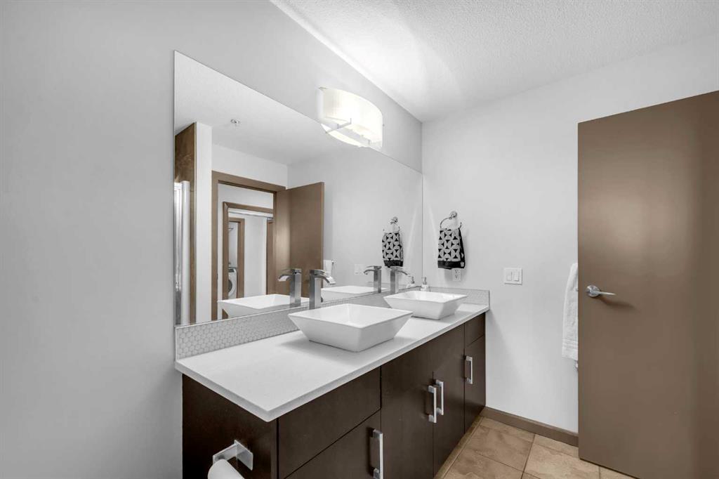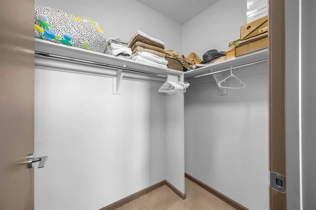 The primary bedroom is a true retreat, offering breathtaking south-facing vistas of the Rocky Mountains and spectacular sunsets. Natural sunlight streams in throughout the day, enhancing the sense of space and tranquility. The large walk-through closet is equipped with custom organizers, providing ample storage and easy access. The luxurious primary ensuite features a spacious 4-piece layout, making it an ideal sanctuary for relaxation and privacy.