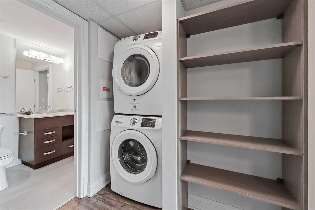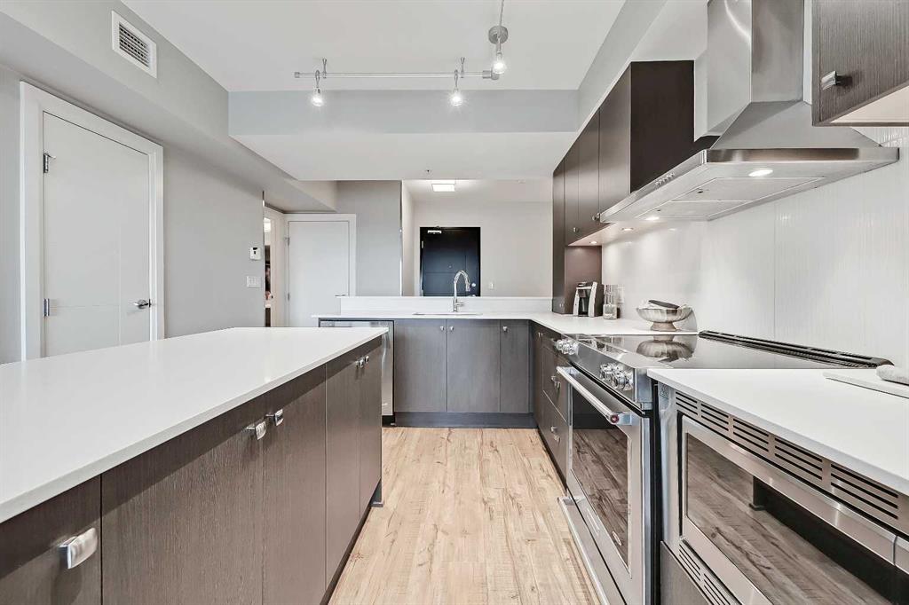 *VISIT MULTIMEDIA LINK FOR FULL DETAILS, INCLUDING IMMERSIVE 3D TOUR & FLOORPLANS!* This bright NORTH-facing 1-bed + den unit with stunning PANORAMIC RIVER VIEWS from the 24th floor in the upscale Vogue building is a must-see! There are only 4 upgraded floors in the Vogue building, which were specially customized for Bedouin Suites, and this is one of them! EXCLUSIVE BEDOUIN FEATURES include upgraded hallways and common areas, as well as INCREDIBLE UNIT UPGRADES like custom kitchen islands with bar seating, upgraded appliances & lighting including dimmers throughout, custom bedroom panelling including built-in side tables with convenience plugs, upgraded bathrooms with tile wainscoting and glass shower doors, built-in walnut entertainment units, a Smart Sensor energy management system for the eco-minded buyer and MORE! This customized ‘VARSITY’ floorplan also had a kitchen wall removed for improved flow and natural light, and WOW, does it look good! This condo presents modern living at its finest, including an open-concept layout filled with natural light through ample floor-to-ceiling windows, complemented by luxury vinyl plank flooring adorning the main living spaces. The modern kitchen boasts wood-grain cabinets with modern hardware and under-cabinet lighting, a specially designed central island with quartz counters, a tile backsplash, a dual-basin undermount sink, and upgraded stainless steel appliances, including a chimney-style hood fan. The open main living area features a built-in walnut entertainment unit with a wall-mount TV included and access to a large balcony with a gas line for a BBQ and panoramic views of the Bow River. The bedroom features custom wall panelling with built-in side tables, wall sconce lighting and a convenient receptacle with a USB port, plus an included wall-mounted TV. A large walkthrough closet with built-in organizers and a stacked laundry leads to the 4-pc bathroom complete with occupancy-sensored lights, quartz countertops, tile wainscoting, an undermount sink with modern faucet, tile backsplash, modern vanity with storage, tile floors, and a large tub/shower combo with full height tile and an upgraded glass door. Additionally, a sizable den makes the perfect home office or flexible space. VOGUE is a high-end building with a ton of amenities, including UNDERGROUND HEATED PARKING, central A/C, an elegant formal lobby, full-time concierge, gym, billiards, a large party room with a kitchen, a yoga studio, a Sky Lounge on the 36th floor, and multiple rooftop terraces. Surrounded by parks, transit, the LRT, shopping & more, & within walking distance to the downtown core & all Kensington shops & services – this location offers the best urban lifestyle in the Downtown Commercial Core.
