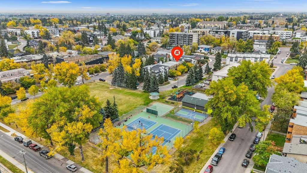 Prime townhome in a choice Bankview location across from a park, tennis courts and community center. Thoughtful architectural design boasts a spacious, 2 bedroom, 2.5 bathroom floor plan complete with gourmet kitchen, dining area, & great room. The main floor accommodates an open concept featuring quarter-sawn mahogany hardwood floor throughout. The central kitchen has a large cabinet style pantry, dark-stained full maple cabinets, and elegant quartz countertops complemented with stainless steel appliances. Each of the two bedrooms on the second floor is equipped with a private ensuite, presenting polished marble countertops, & expansive vanity mirrors. This townhome is nestled in the heart of the city in one of Calgary's oldest communities; a fantastic location that embodies both the charm of an established community and all the conveniences of urban living.
