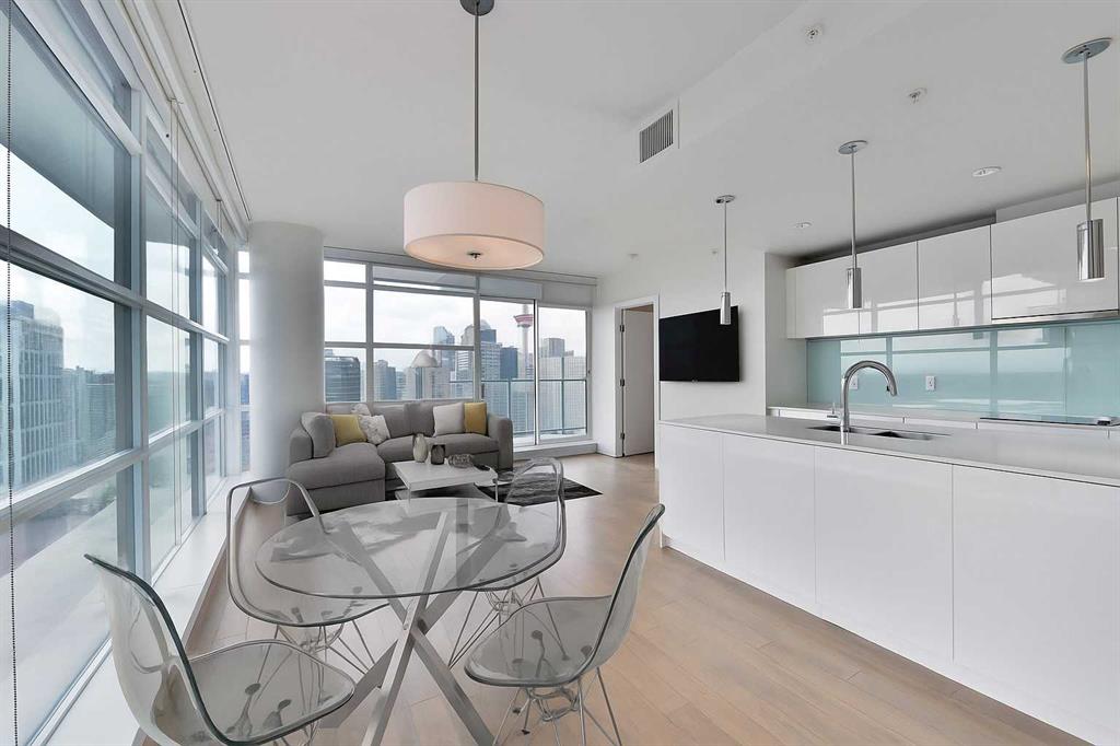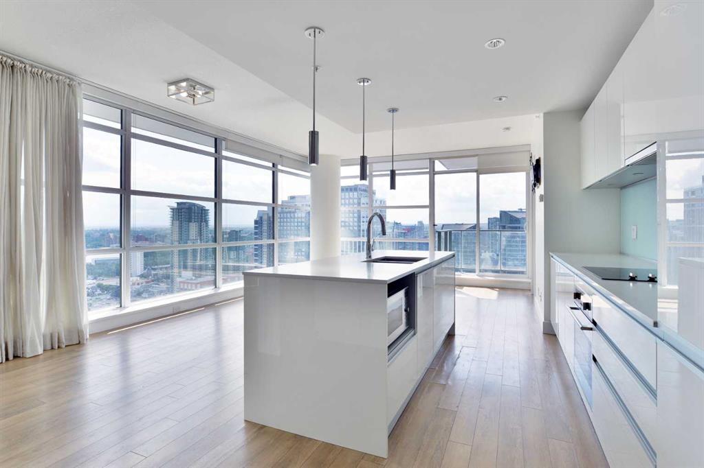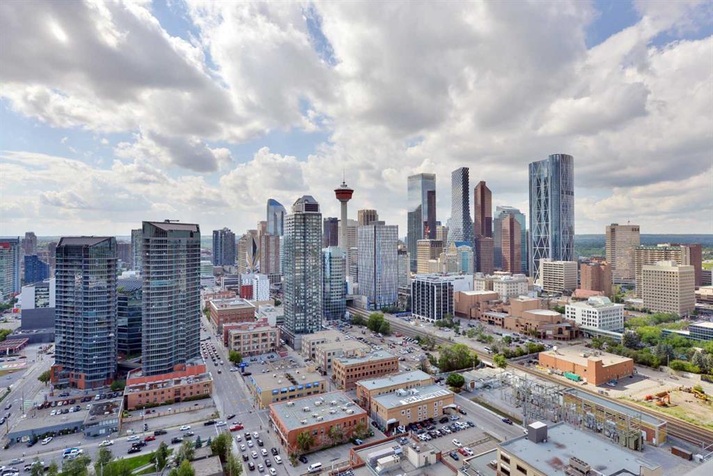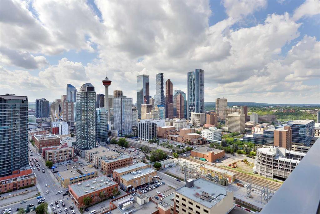 Welcome to this immaculate 2-bedroom, 2-bathroom southwest corner unit on the 29th floor, perfectly positioned in the heart of Calgary’s vibrant entertainment district. With breathtaking views of the downtown skyline and sweeping west to the mountains, this executive condo offers style, comfort, and an unbeatable location. Designed for modern living, this spacious home features light oak hardwood flooring and an open-concept layout that’s both functional and inviting. The European-inspired kitchen is a showstopper, showcasing sleek Italian cabinetry, quartz countertops, a contemporary glass backsplash, and stainless steel appliances. Whether you're cooking for one or entertaining a crowd, the generous counter space and smart storage are sure to impress. The living room is a peaceful retreat, ideal for relaxing and recharging, while the dining area provides a welcoming space to gather with friends and family. Floor-to-ceiling windows flood the home with natural light and capture stunning panoramic views from every angle. The private primary suite offers a cozy sanctuary, complete with a custom closet and a stylish 4-piece ensuite. The second bedroom is just as versatile—perfect for guests, a home office, or a roommate. A second full bathroom and in-suite laundry add to the everyday convenience, while the included tandem parking stall and additional storage provide even more value. Step out onto your large west-facing balcony to enjoy golden hour views and warm summer evenings, or take full advantage of everything The Guardian has to offer. This fully air-conditioned, professionally managed building includes daily concierge service and is just steps from the Bow River Pathway, East Village, Eau Claire, and the LRT. Trendy shops, restaurants, and cafés are right outside your door. This is downtown living at its best. Don’t miss your chance—book your showing today!