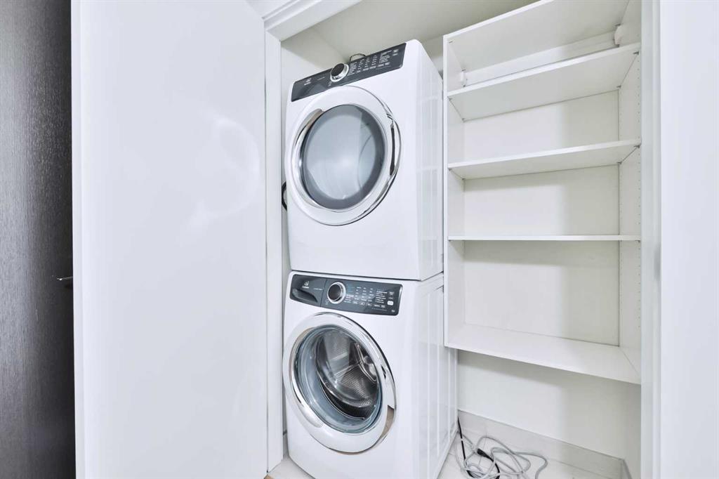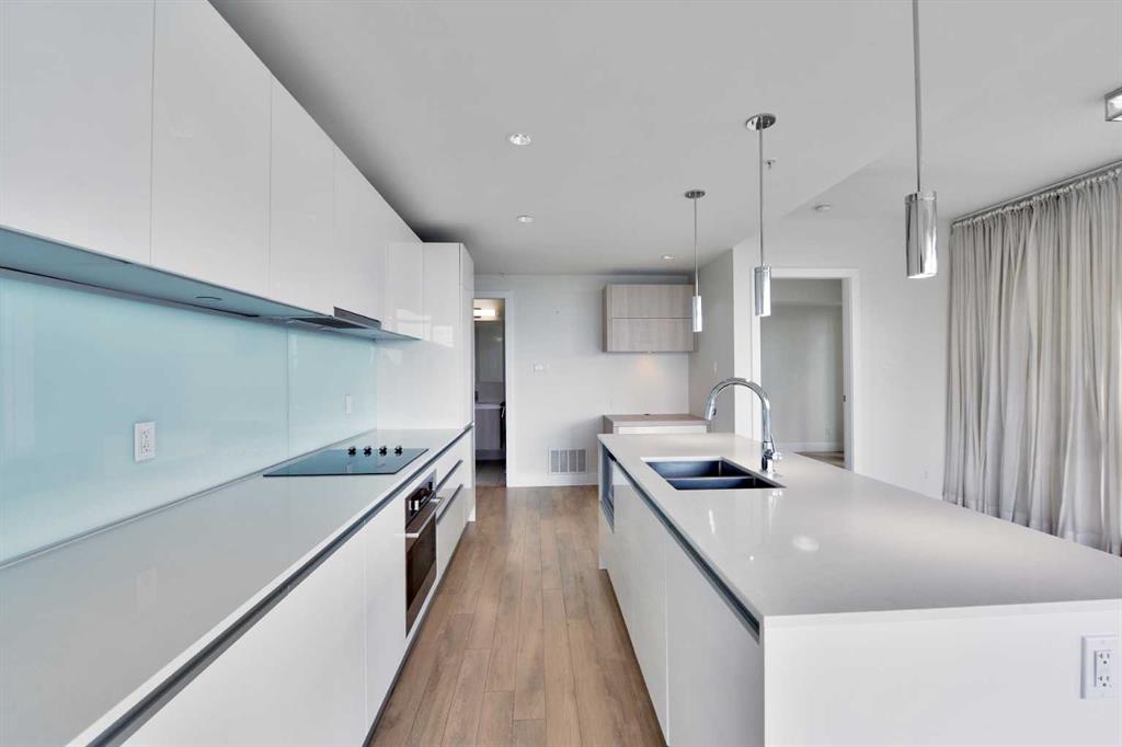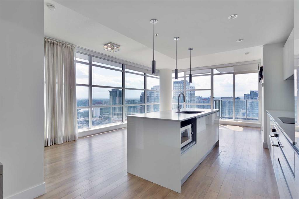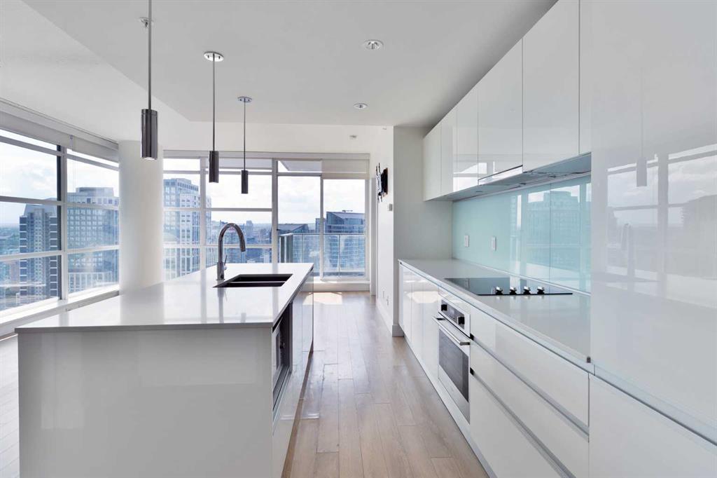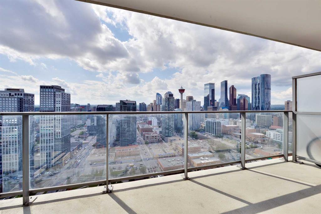 Welcome to this immaculate 2-bedroom, 2-bathroom southwest corner unit on the 29th floor, perfectly positioned in the heart of Calgary’s vibrant entertainment district. With breathtaking views of the downtown skyline and sweeping west to the mountains, this executive condo offers style, comfort, and an unbeatable location. Designed for modern living, this spacious home features light oak hardwood flooring and an open-concept layout that’s both functional and inviting. The European-inspired kitchen is a showstopper, showcasing sleek Italian cabinetry, quartz countertops, a contemporary glass backsplash, and stainless steel appliances. Whether you're cooking for one or entertaining a crowd, the generous counter space and smart storage are sure to impress. The living room is a peaceful retreat, ideal for relaxing and recharging, while the dining area provides a welcoming space to gather with friends and family. Floor-to-ceiling windows flood the home with natural light and capture stunning panoramic views from every angle. The private primary suite offers a cozy sanctuary, complete with a custom closet and a stylish 4-piece ensuite. The second bedroom is just as versatile—perfect for guests, a home office, or a roommate. A second full bathroom and in-suite laundry add to the everyday convenience, while the included tandem parking stall and additional storage provide even more value. Step out onto your large west-facing balcony to enjoy golden hour views and warm summer evenings, or take full advantage of everything The Guardian has to offer. This fully air-conditioned, professionally managed building includes daily concierge service and is just steps from the Bow River Pathway, East Village, Eau Claire, and the LRT. Trendy shops, restaurants, and cafés are right outside your door. This is downtown living at its best. Don’t miss your chance—book your showing today!