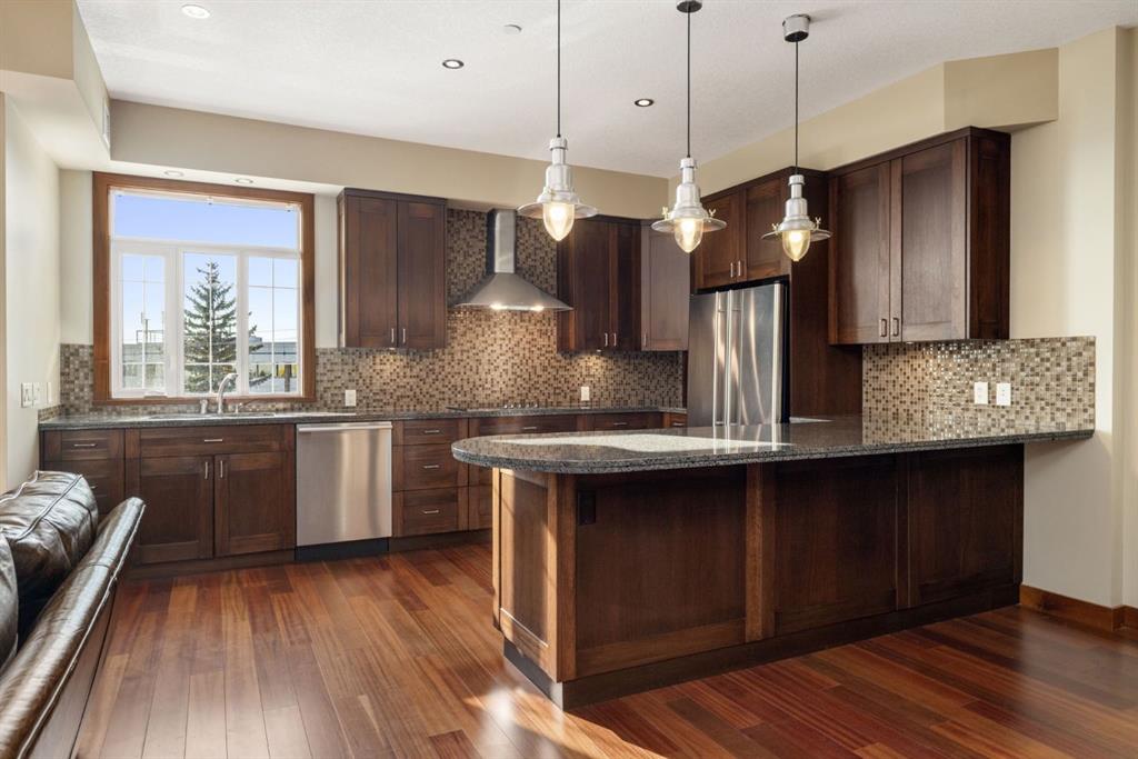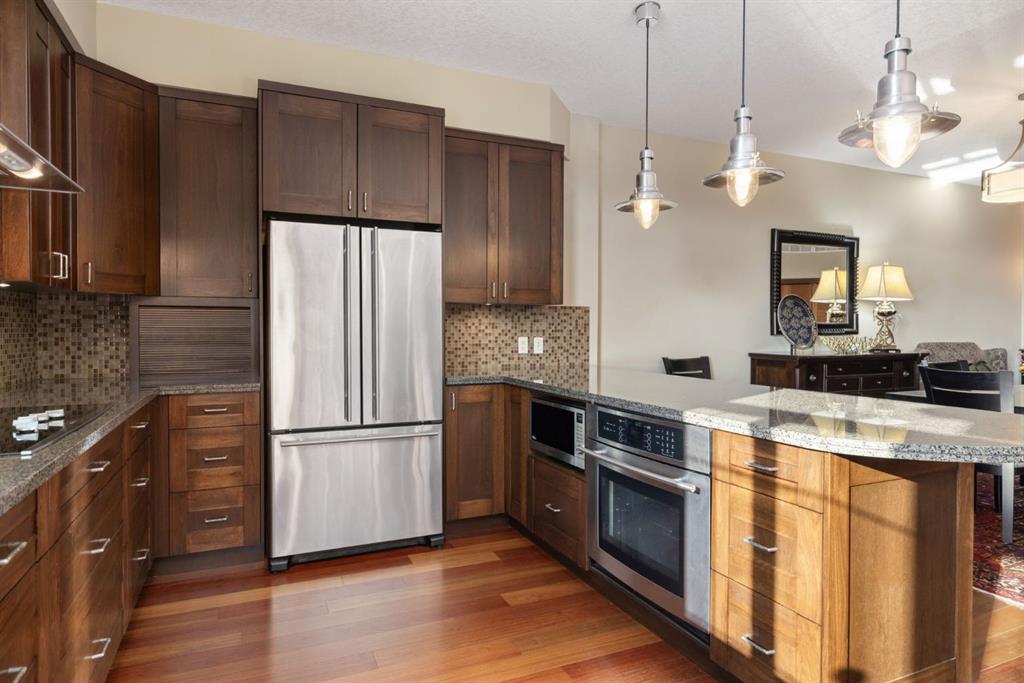 An exceptional opportunity to experience refined urban living in one of Calgary’s most thoughtfully designed residences. This elegant three bedroom, two full bathroom corner home offers breathtaking southwest city and mountain views, two private balconies, and two titled parking stalls in the heated underground parkade. Originally designed as the Havenworth show suite, this residence was meticulously crafted to showcase the very best the building has to offer. Premium upgrades, curated finishes, and a layout that balances beauty with everyday functionality set this home apart. Lovingly maintained by the original owners, pride of ownership reflects throughout. Soaring 9" ceilings, an open concept layout, and floor to ceiling windows create an immediate sense of space and light. Expansive sightlines frame the stunning views, while both the primary suite and adjacent second bedroom open directly onto spacious balconies, a rare feature offering seamless indoor outdoor living and peaceful retreats for morning coffees or evening sunsets.The chef inspired kitchen is both striking and functional, featuring exotic hardwood flooring, custom cabinetry crafted from Lyptus hardwood and African mahogany, high end Miele and Jenn Air appliances, granite countertops, generous prep space, and ample storage. The living and dining areas flow effortlessly together, anchored by a dramatic floor to ceiling fireplace that creates a warm and inviting atmosphere for entertaining or relaxing.