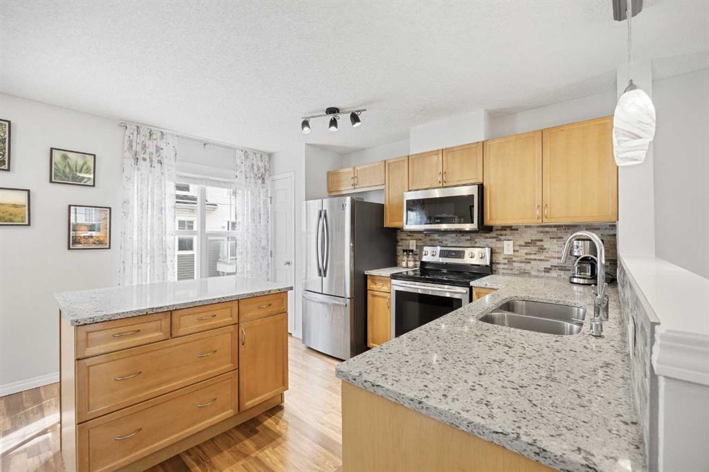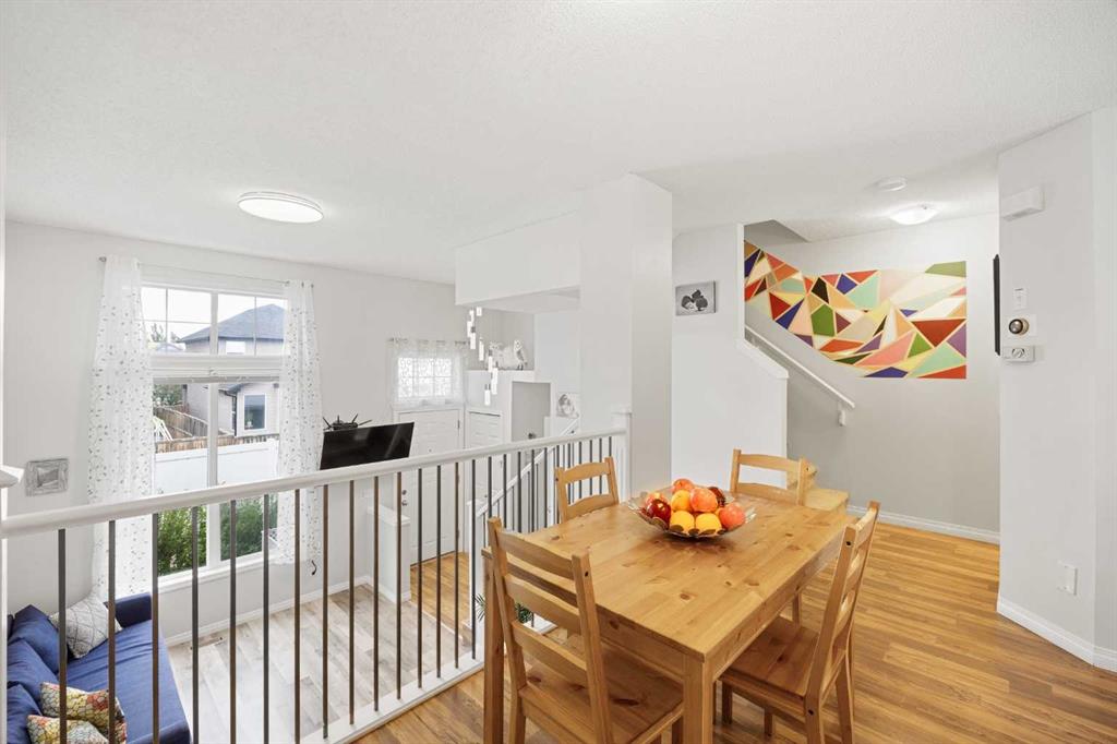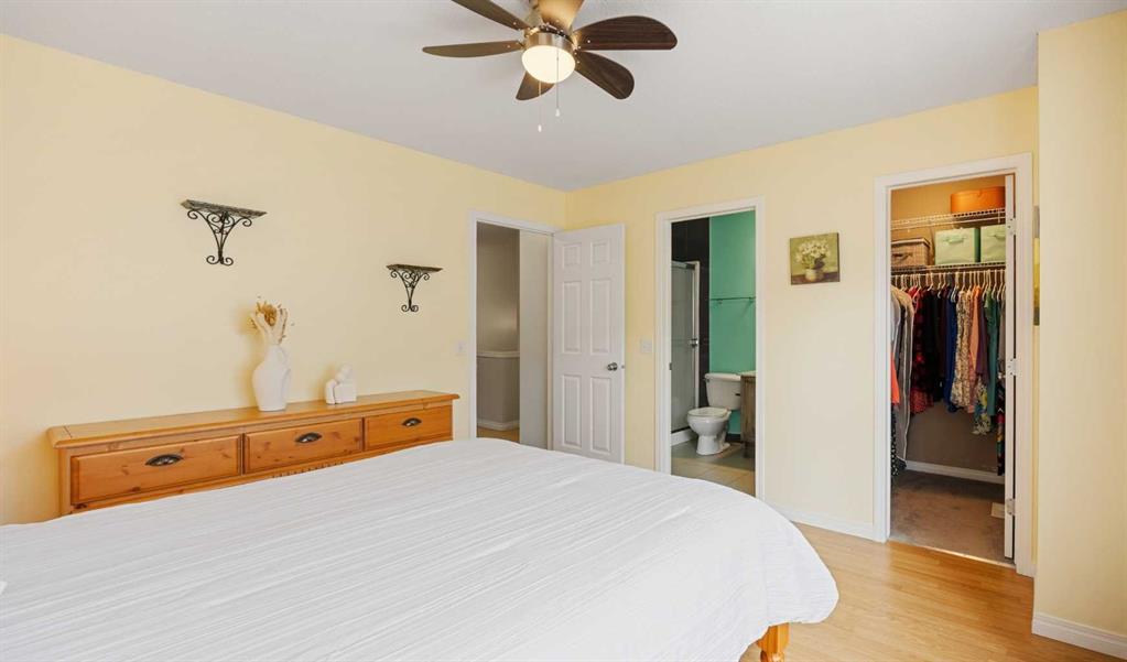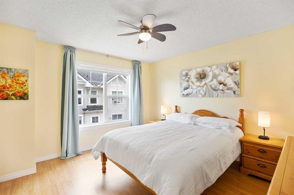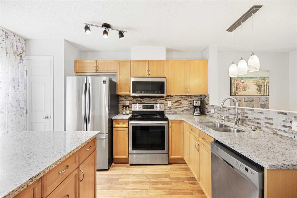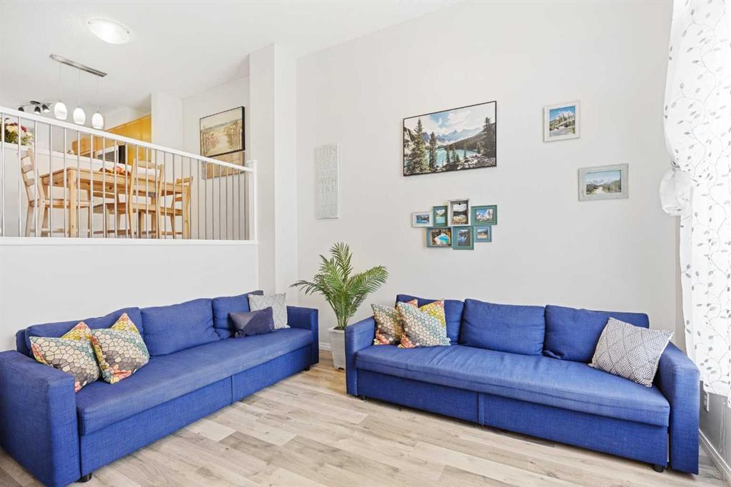 Health Campus Hospital and Calgary Transit bus routes to downtown, commuting is a breeze. Shopping and dining options are just around the corner, with McKenzie Towne and the Shopping Plaza on 130th Ave within easy reach. Upon entering, you'll be greeted by freshly painted walls and soaring 13 ft ceilings in the living room area. The spacious living room, filled with natural light from expansive windows, features dimmable LED lighting and an elegant chandelier, fostering a warm and inviting environment. The generous dining room is ideal for entertaining family and friends, while the bright eat-in kitchen boasts a movable island, stylish laminate flooring, stainless steel appliances, a granite countertop, and a RAW filter system. On the upper level, two master bedrooms await, each equipped with their own 3 & 4-piece ensuite bathrooms and walk-in closets, ensuring both privacy and comfort. Additional highlights include a two-car garage, sparing you the winter scraping hassle, and a condo board-approved air conditioning system. The lower level provides a convenient washer and dryer setup, along with ample space for a workout area, hobby room, or extra storage.