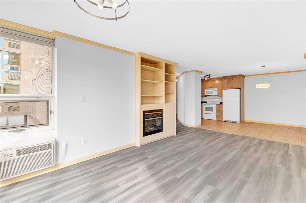 Large condo with A/C and Condo Fees that include everything (including electricity, hot tub, pool and steam room!) in the sought-after Varsity offers bright, south-facing views and a beautifully maintained open-concept layout. Recently painted and featuring brand-new flooring, this 2-bedroom, 1-bath home includes a spacious living room with a cozy fireplace and built-in window air conditioning, a welcoming dining area, and a well-appointed kitchen with a full appliance package.