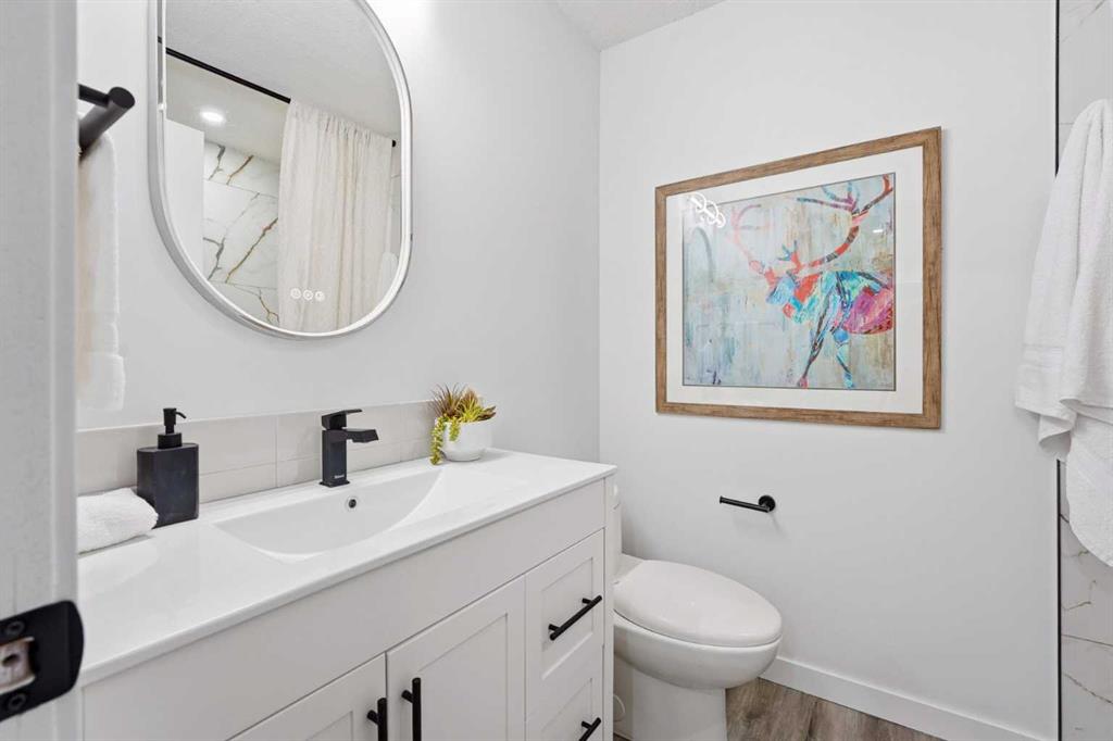 Retreat to your king-sized primary bedroom complete with a walk-through closet and a beautifully updated 3-piece ensuite. Both bathrooms have been extensively reimagined, featuring contemporary vanities with quartz counters, modern fixtures, upgraded lighting, and in the main bath — a mirror with makeup lighting and an electric anti-fog feature.