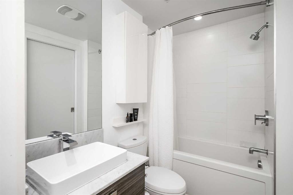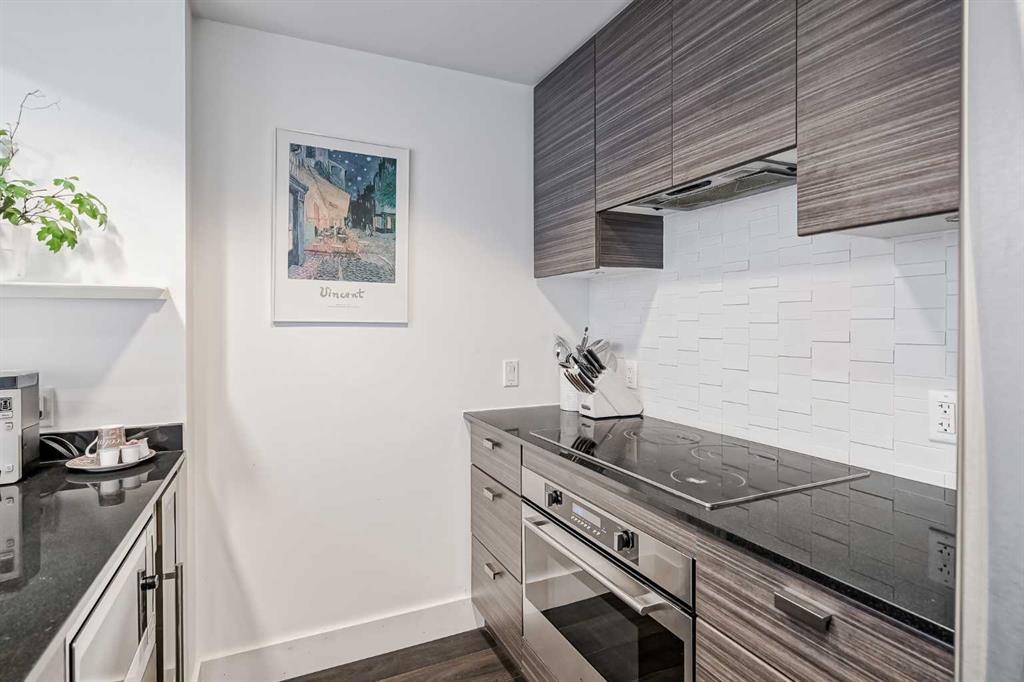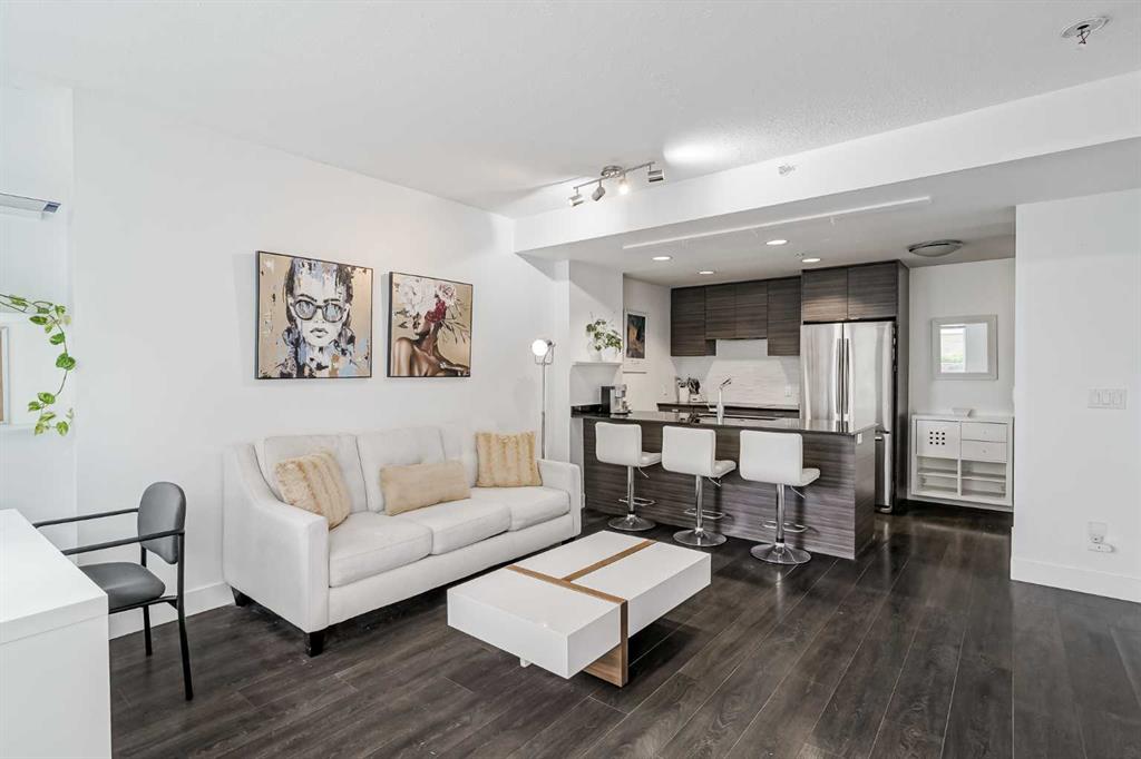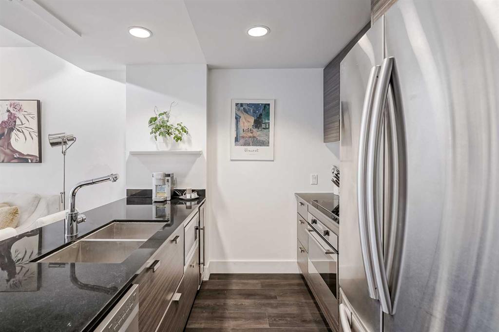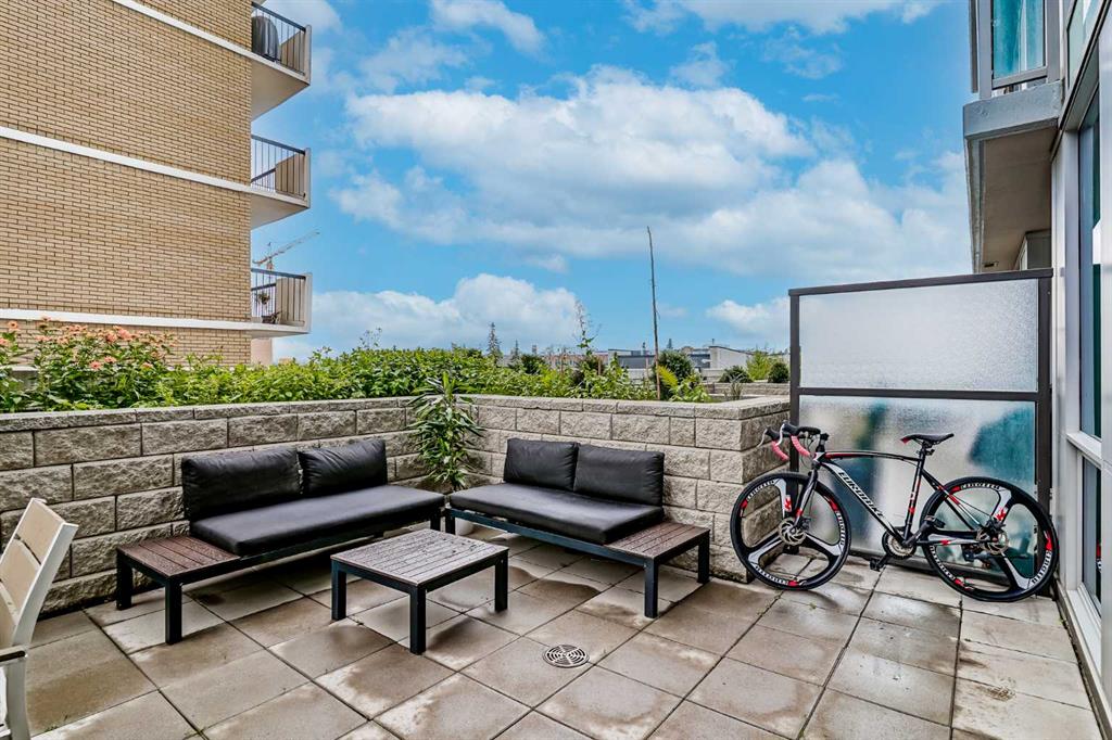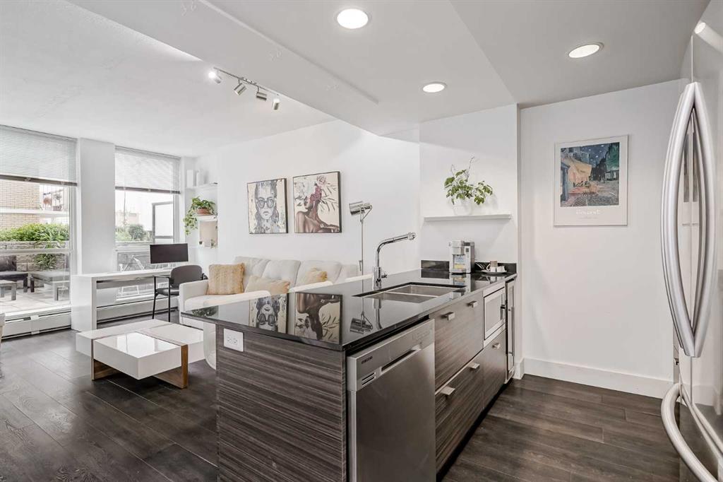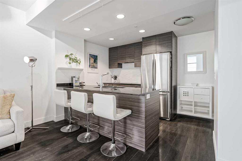 Welcome to this gorgeous 1 bedroom, 1 bathroom condo in one of Calgary's most desired buildings, The Drake. This home really does have it all with 492 square feet of living space and an ABSOLUTELY MASSIVE TERRACE. As you walk in you are greeted with beautiful dark wood floors throughout the home starting with your kitchen, equipped with stainless steel built-in appliances, glass cook-top, granite counter tops, and a eat up bar area. Your kitchen flows into your living room making for a perfect entertaining space and is wrapped with floor to ceiling windows overlooking your expansive terrace. Your bedroom is large enough for all of your bedroom furniture and has a pocket door for direct access to your full bathroom. The terrace of this unit is ONE OF THE LARGEST IN THE BUILDING and is really what makes this unit special as there are only a few units that offer such a large outdoor space. This space is great for entertaining, BBQ'ing with friends and family, gardening, morning coffee or just basking in the sun. Truly a unique offering. The home comes with titled underground parking and a titled storage unit. The Drake is one of the most sought after buildings in Calgary being steps away from 17th avenue shops, restaurants, parks, pathways and not far from the river. There are great schools in the area and access to transit to get wherever you need to go in the city. Do not miss out on this opportunity to own this great home with huge outdoor space in a wonderful building.