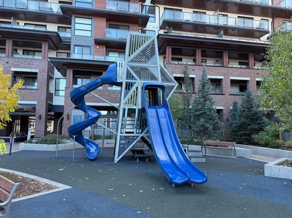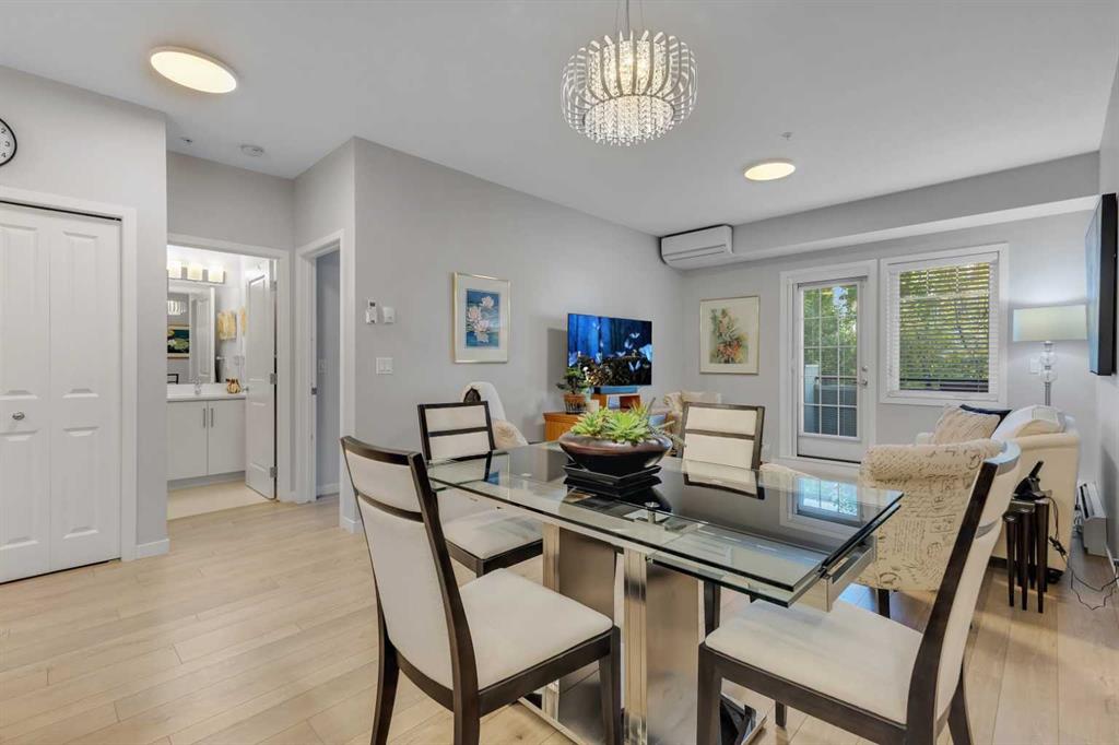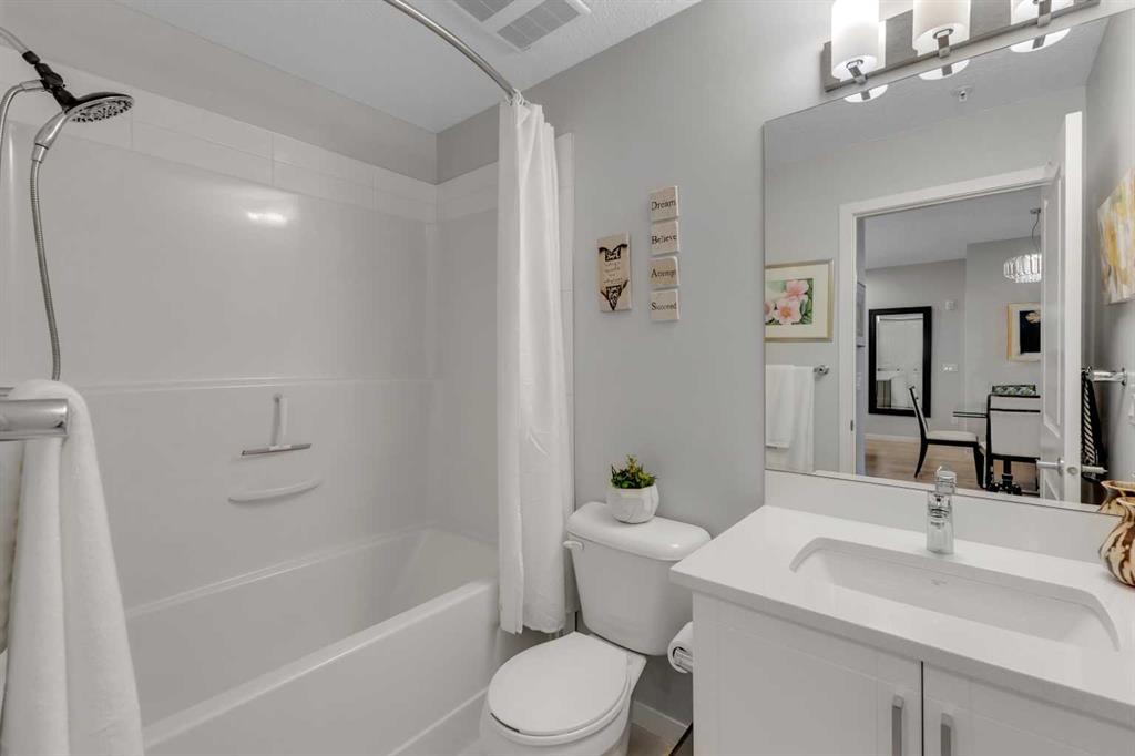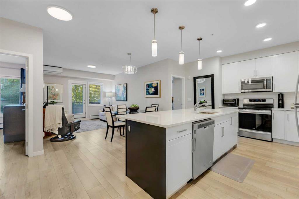 **Watch Virtual Tour** Across the street from Westman Village! Enjoy all the perks of living in this central location at an affordable price! One of the largest floorplans for a two-bedroom , two-bathroom condo. Private Patio on the quiet side with stunning trees. Inside, you'll find a spacious kitchen outfitted with sleek white raised cabinets, elegant quartz countertops, an oversized island with ample seating opportunities, stainless steel appliances including induction stove, and a garburator for added convenience. The kitchen opens into a thoughtfully laid-out living area that separates the two bedrooms—offering privacy and flexibility whether you're hosting guests, working from home, or sharing the space. The primary bedroom features a walk-through closet that leads into a private three-piece ensuite complete with a glass shower. The second bedroom is located adjacent to a full four-piece bathroom, perfect for guests or family. Luxury vinyl plank flooring runs throughout the main living spaces, and a dedicated laundry room with built-in pantry-style storage adds to the overall functionality. For year-round comfort, the unit includes air conditioning. Step outside to a large, north-facing covered balcony surrounded by mature trees, providing natural privacy and a peaceful place to relax. The balcony is equipped with a gas line for your BBQ, and the patio door features blinds encased in glass as well as a retractable screen—combining practicality with comfort. A titled underground parking stall is also included for added convenience. Located just a short walk from grocery stores, shops, cafes, and restaurants, this home offers unbeatable access to everyday essentials. And beyond your front door, Mahogany’s incredible amenities await—including 22 kilometers of scenic pathways, two private beaches, expansive parks, playgrounds, off-leash areas, and beautifully maintained green spaces. As a resident of Sandgate, you'll also enjoy access to a fitness studio, a lending library, guest suite, and pet-friendly policies—all in a building designed with character, quality, and livability in mind. This isn’t just a home—it’s a lifestyle. Don’t miss your opportunity to own in one of Calgary’s most desirable lake communities.
