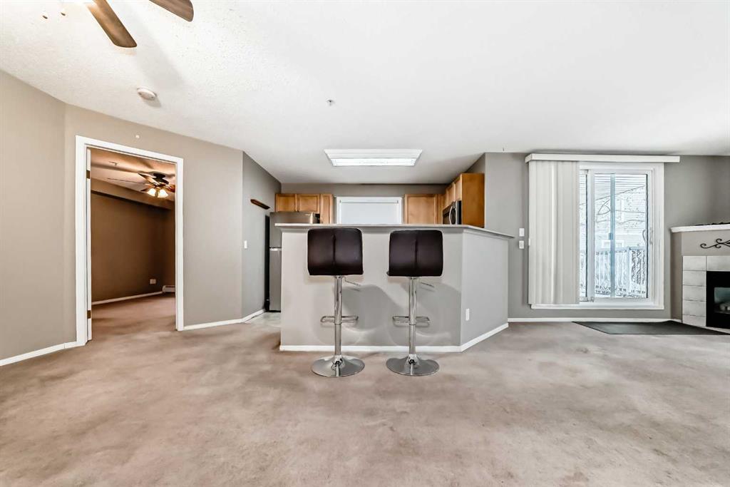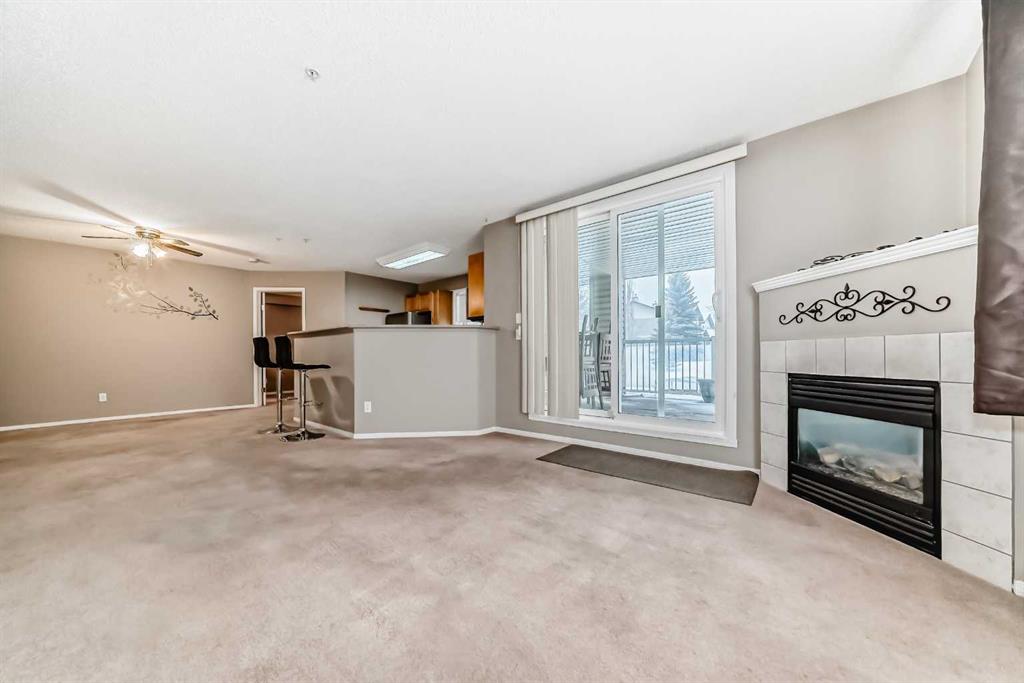 The open-concept main living area features a practical kitchen breakfast bar, a cozy gas fireplace, plus direct access to your south-facing, fenced patio—perfect for morning coffee or simply enjoying extra privacy. The carpet has just been replaced too, offering a fresh start!