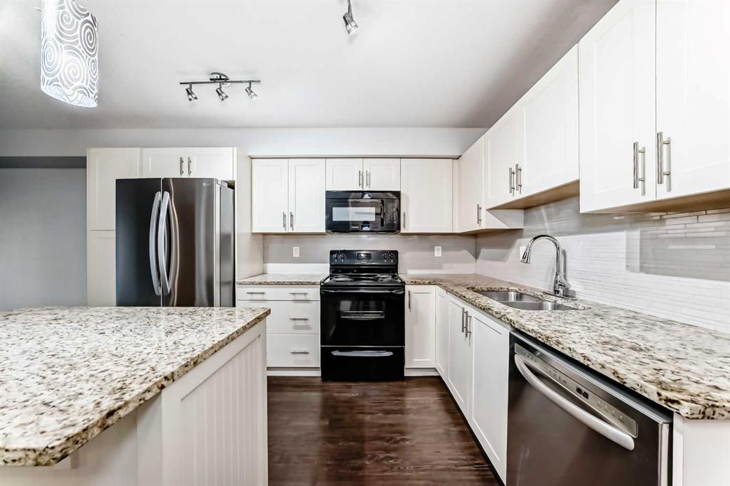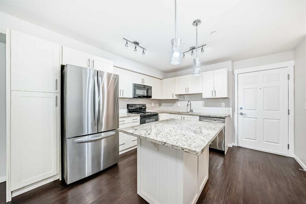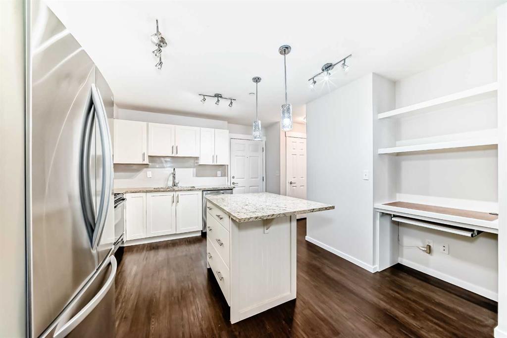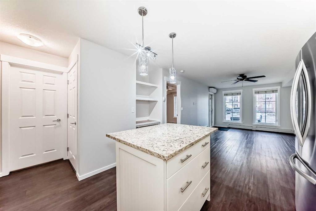 Welcome to this meticulously maintained ground floor unit! This one has it all! Fresh paint throughout, upgraded lights, granite countertops, kitchen island with room for 3 stools, upgraded fridge and dishwasher, plenty of cabinet and counter space as well as tiled backsplash and a pantry closet! As you make your way into the living areas you have a huge living room with an access door out to the private patio area that has a gas hook up for your BBQ and there is also a desk area next to the kitchen that's perfect for a work from home professional! The bedroom is a good size and has a walk through closet with built ins that connects to the full bathroom. If that wasn't enough there is a doggie "potty station", fire pit for the residents, TITLED parking, Central A/C, separate storage down in the parkade area and this unit is close to all of the areas amenities, parks, playgrounds, major roadways, 130th shopping centre, The South Health Campus, the YMCA, off leash dog parks and so much more! This one is priced to sell and just awaiting a new owner to love it!