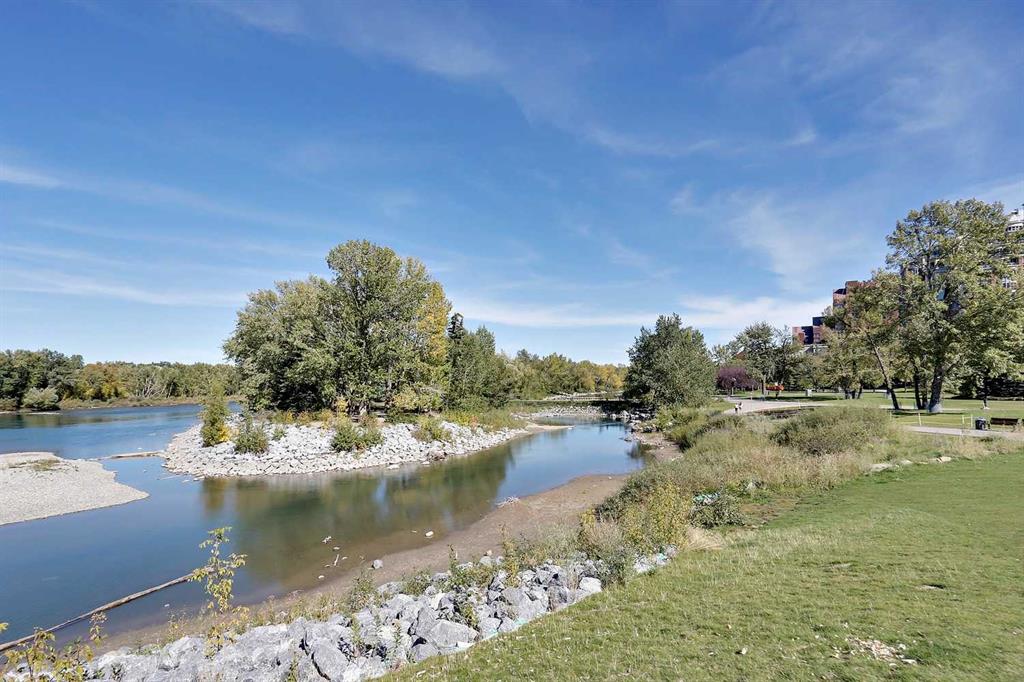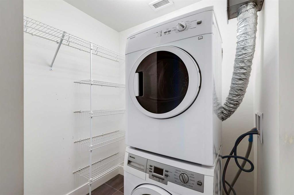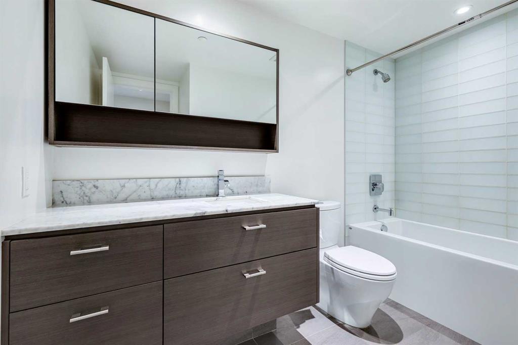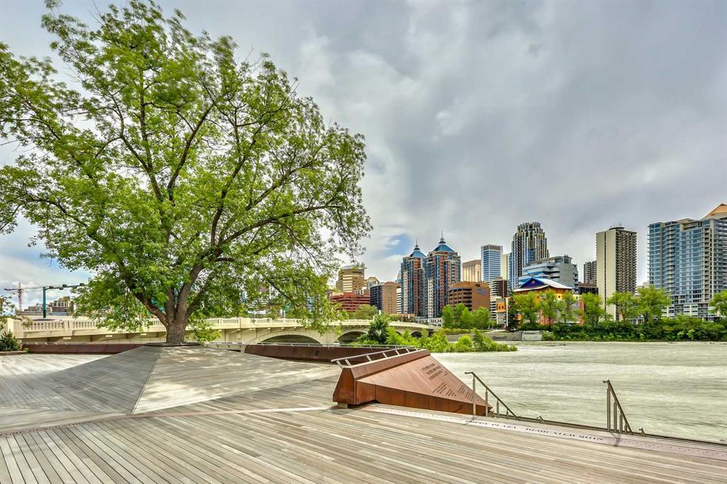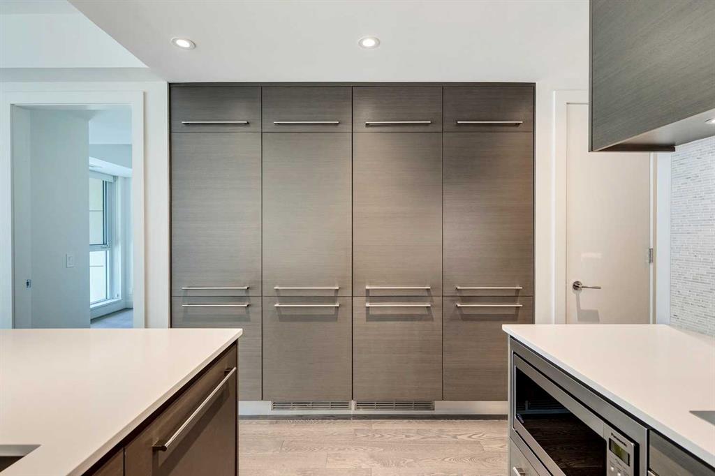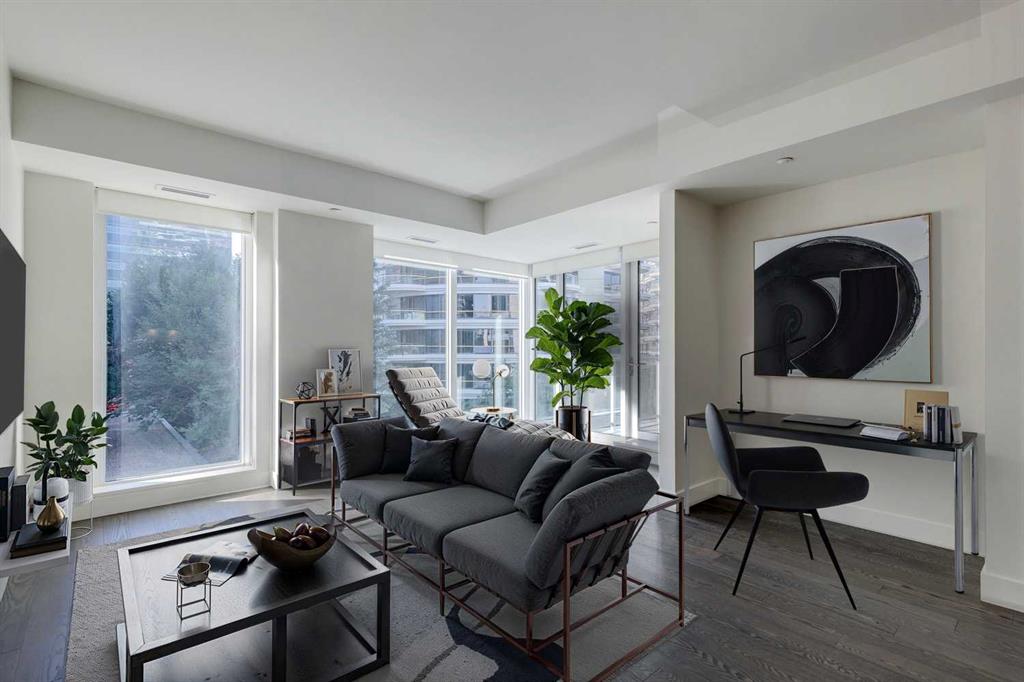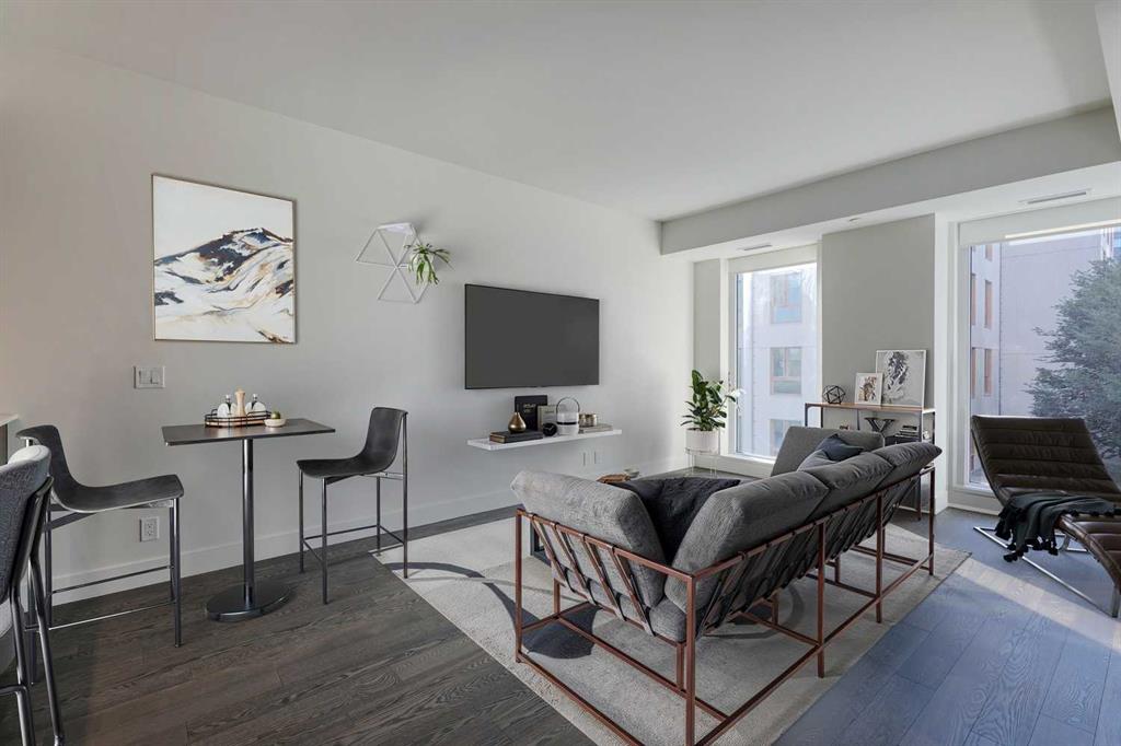 Within the modern, luxurious, & stylish Avenue condo complex that is situated in the heart of the Downtown West End, this spacious South facing 707 sq ft, 1 bedroom unit is sure to impress with its smartly designed floorplan & high-end finishes. As you step in, the open concept layout emphasizes great flow & privacy as soon as you enter with an accommodating entry area greeting you before turning the corner to access the rest of the unit. The sleek premium Cressey kitchen welcomes you with plenty of ceiling height ash grained cabinetry, chef’s pantry wall, full size high-end appliances (integrated fridge & dishwasher, 5-burner gas cooktop, & built-in oven), stone countertops (also in the bathroom), & a built-in full length breakfast bar with wine rack that is ready for any occasion. Nearby, the inviting general living area is ideal for entertaining & relaxing while offering dedicated spaces for dining & a workstation with options to reconfigure depending on your needs. Feel comfortable & rejuvenated having tall ceilings complimented by the natural light from the South exposure as the floor-to-ceiling windows & covered balcony allow you to soak in the urban environment. When you are ready to wind down for the evening, the lovely master bedroom beckons, while a serene full 4-piece bathroom (w/ built-in medicine cabinetry & in-floor heating), & dedicated laundry closet (w/ extra storage space) are all close by to complete the package. Important features include; hardwood & tiled flooring throughout main living areas & bathroom, central AC, titled heated underground parking spot, titled separate storage locker, & all blinds/drapes already done. Beyond the home, the building offers a fitness room, 24 hr concierge/security service, dog wash station, bike storage, & visitors parking while the many shops, eateries/cafes, amenities, & LRT station that the West End & trendy Kensington has to offer are all a short walk away. Being steps to the Bow River, the picturesque pathways of Prince’s Island Park, & Downtown make this location the perfect blend for work & play. Ideal for a diverse range of buyers or those looking to add a solid piece to their investment portfolio; come view this well-rounded condo today!