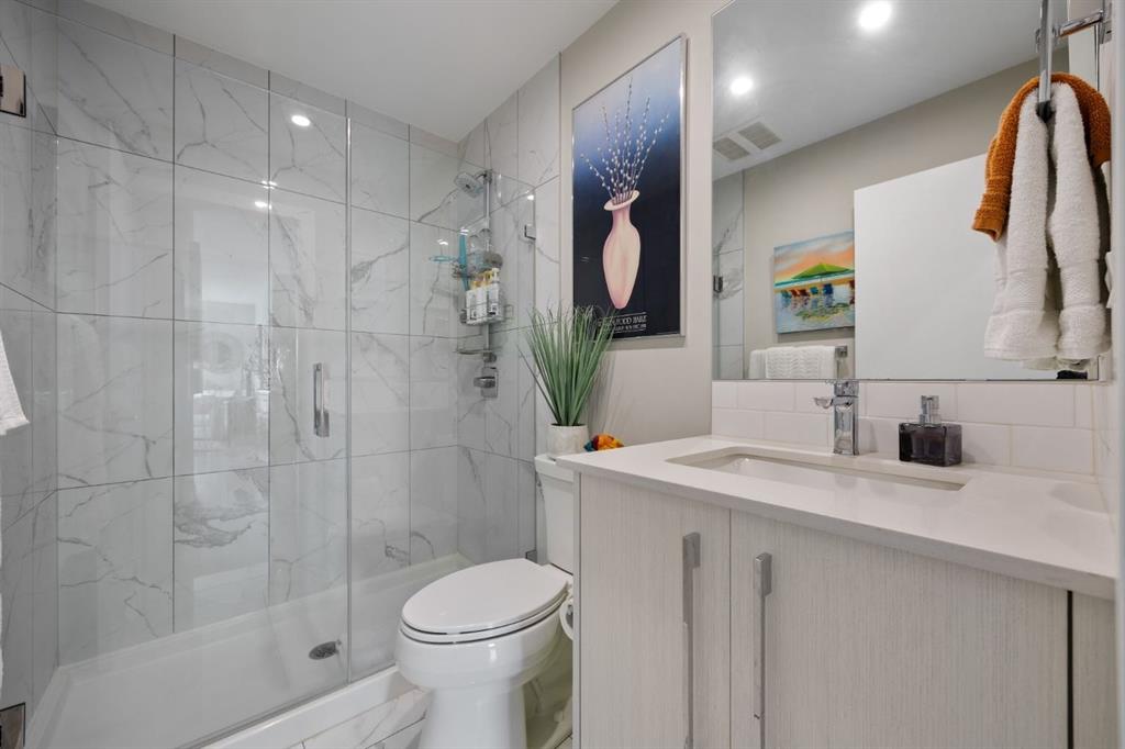 Enjoy maintenance-free living in this beautiful corner unit in the sought-after +55 Maple building, ideally located in Calgary’s vibrant University District. Built by Truman Homes, Maple offers a secure, comfortable, and social community surrounded by every amenity you could need—perfect for those ready to simplify life without sacrificing lifestyle. Life in the University District feels like living in a small town within the city. Everything is steps away—Save-On-Foods, Shoppers Drug Mart, banks, cafés, restaurants, and shops along lively Main Street. Load up your shopping caddy and enjoy running errands without ever needing your car. Designed with pedestrians in mind, the University District features wide sidewalks, curb ramps, benches, and scenic walking routes, making it easy and enjoyable to get around. With new shops and services opening all the time, this area continues to grow as one of Calgary’s most vibrant, walkable communities. The Maple building itself has been thoughtfully designed for “aging in place”, with wide hallways and entrances, barrier-free showers, and common areas that encourage connection. Residents enjoy heated underground parking, storage lockers, bike storage, and beautifully landscaped courtyard with inviting seating areas. Immediately adjacent to Maple is Cambridge Manor – a residence providing independent and supportive living services. Maple owners receive priority placement at Cambridge when additional care or services are needed, providing peace of mind for the future. Cambridge Manor also features a Bistro café, fitness centre, exercise classes, and an entertainment stage, which Maple residents can enjoy at their leisure. Inside Unit 315, you’ll find a bright, spacious, and functional layout that feels instantly like home. Perfect for downsizers, this 810 sqft condo is one of the largest in the building. With its coveted corner location, the unit also features a spacious covered balcony further extending the indoor/outdoor space. Inside the unit you will find two bedrooms, positioned at opposite ends of the condo for privacy, two full bathrooms, 9-foot ceilings, and large windows that fill the space with natural light. The modern kitchen includes quartz countertops, stylish cabinetry, and energy-efficient SS appliances. The extended island with a built-in dining table is perfect for entertaining or cozy meals at home. The primary suite comfortably fits a king-sized bed and includes a walk-through closet and spa-inspired five-piece ensuite with double sinks and a spacious, barrier-free shower. The second bedroom makes an excellent guest room, hobby space, or home office—offering versatility to suit your lifestyle. A fantastic layout and ample space for all you need to live simply and elegantly with minimal cleaning and upkeep in one of Calgary’s best communities. Whether you’re seeking a secure home base while you travel or a vibrant, connected community to enjoy year-round, Unit 315 at Maple offers the best of both worlds.