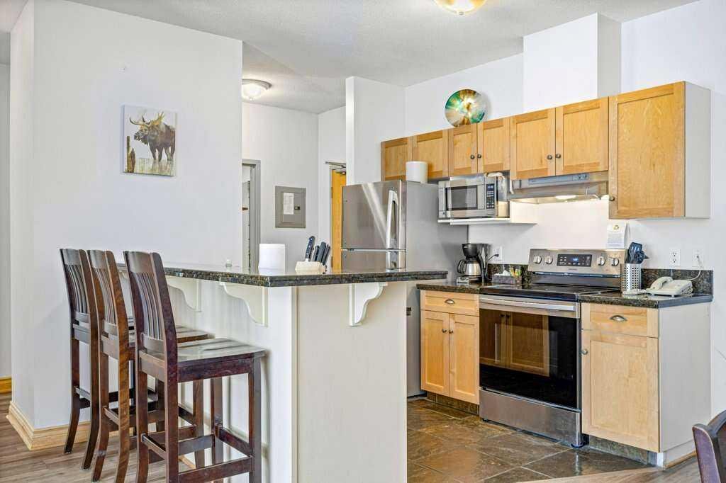 Experience luxury living in this beautifully furnished 2-bedroom, 2-bathroom suite. Located just minutes from downtown's vibrant shops and restaurants, it boasts one of the best locations in town. High-end finishes include granite countertops, brand-new stainless steel kitchen appliances, custom solid wood furniture, and new flat-screen TVs. This mountain retreat also offers in-suite laundry, a balcony with stunning Rocky Mountain views, and a BBQ area. As part of the existing management agreement, the property includes access to a complimentary games room, a full-service spa, an outdoor BBQ area with premium Napoleon grills, and a cozy gas fire pit. Owners enjoy the flexibility to occupy their suite, exchange it through Interval International for access to over 3,500 properties worldwide, or participate in the established rental program. Don’t miss out on this exceptional opportunity to own a piece of paradise!