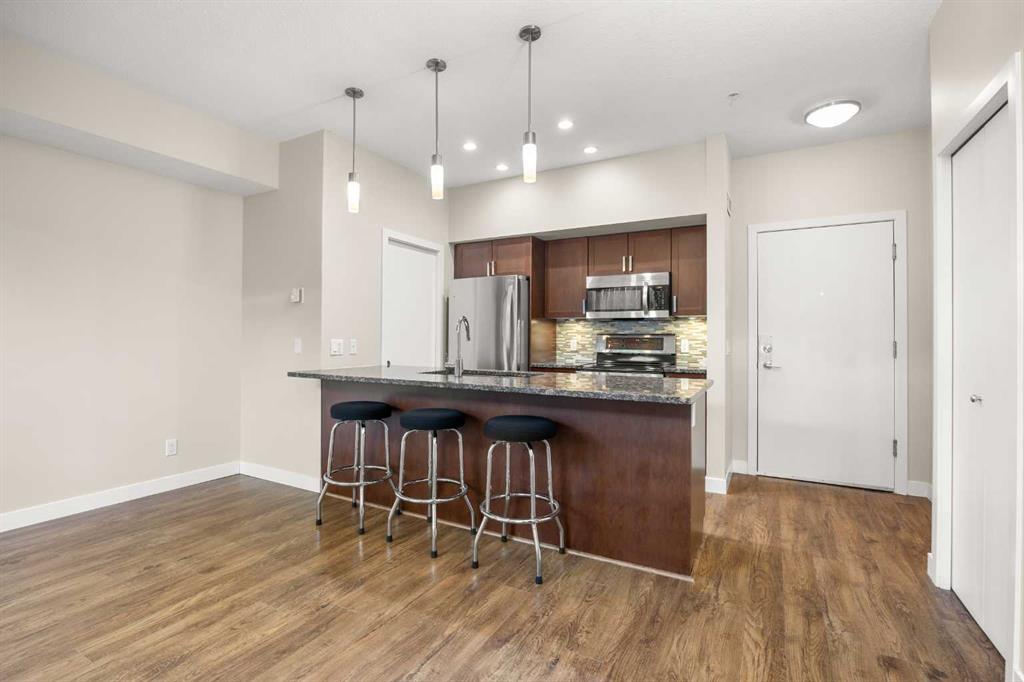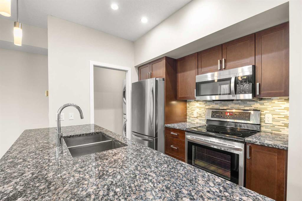 Welcome to this stylish 1 Bedroom Apartment in the established Highland Park community! The unit entrance faces east, with a big window overlooking the park, creating a bright and welcoming corridor as you walk in. Inside, the open-concept layout features 8'10" ceilings and a modern Kitchen with granite countertops, a large Breakfast Bar, and Stainless Steel Appliances, flowing seamlessly into a spacious Living and Dining Area. The Dining Room opens to a Patio with gas hookup—perfect for summer BBQs and relaxing outdoors. The Primary Bedroom offers a Walk-In Closet and a cheater door to the 4-Piece Bathroom with granite countertops. In-Suite Laundry with additional storage next to the Kitchen, plus 1 assigned underground Parking Stall, and one storage unit, complete this practical and comfortable home.