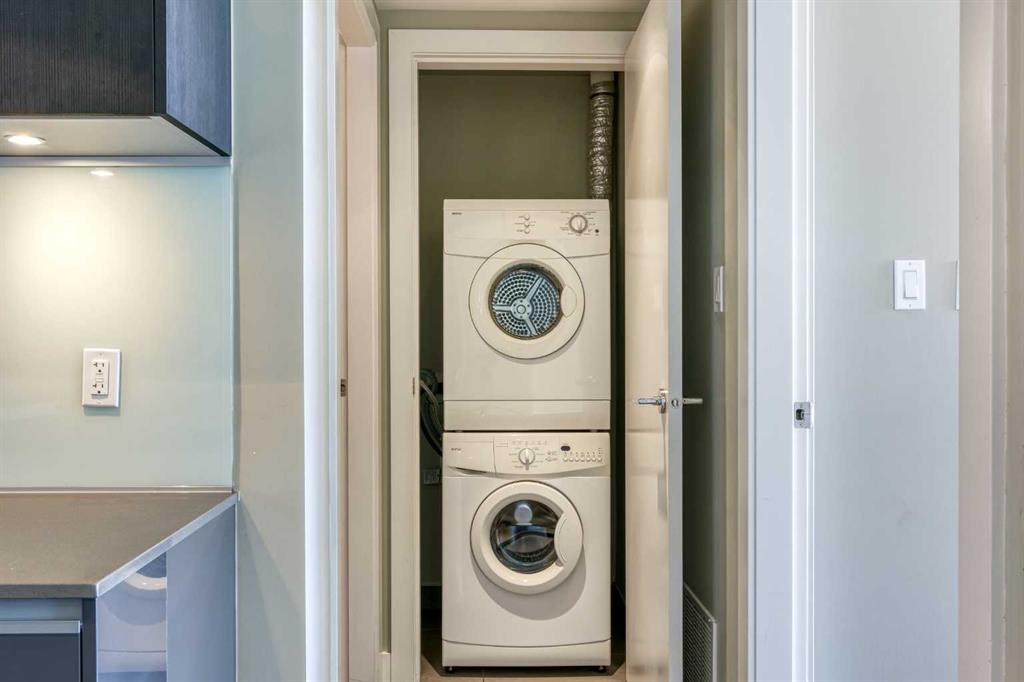 The spacious Bedroom enjoys panoramic views and includes a built-in closet organizer. Additional highlights include a 4-piece Bath, in-suite Laundry, air conditioning, Titled underground parking, and an assigned storage locker.