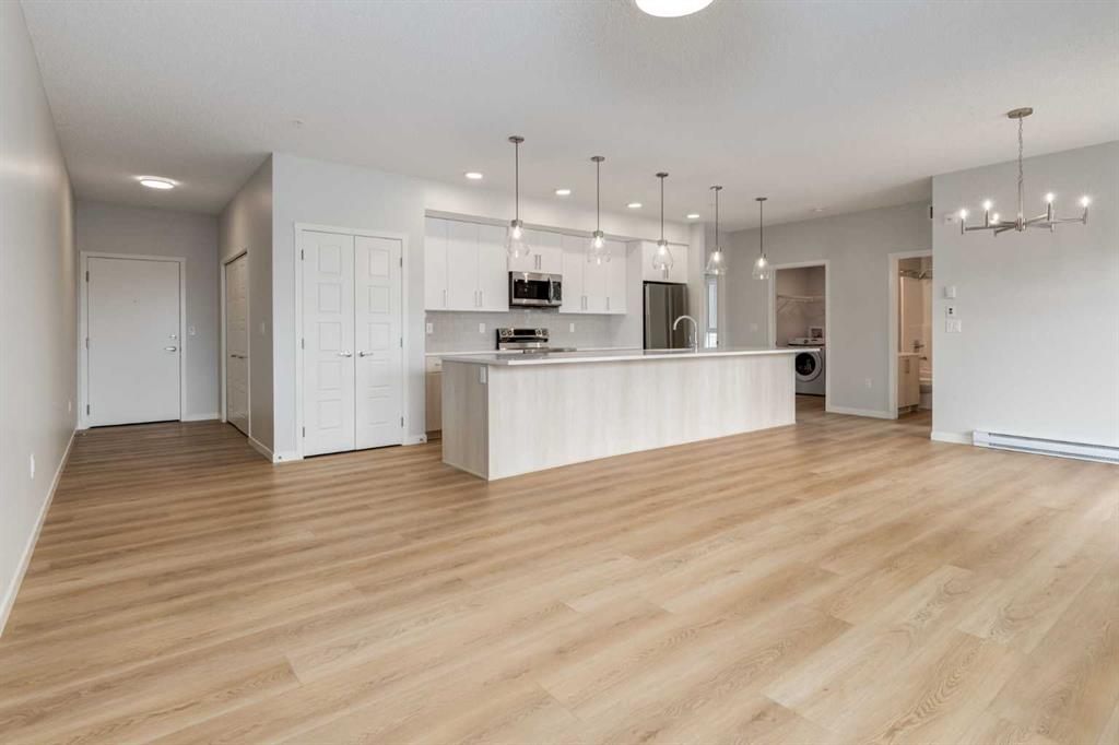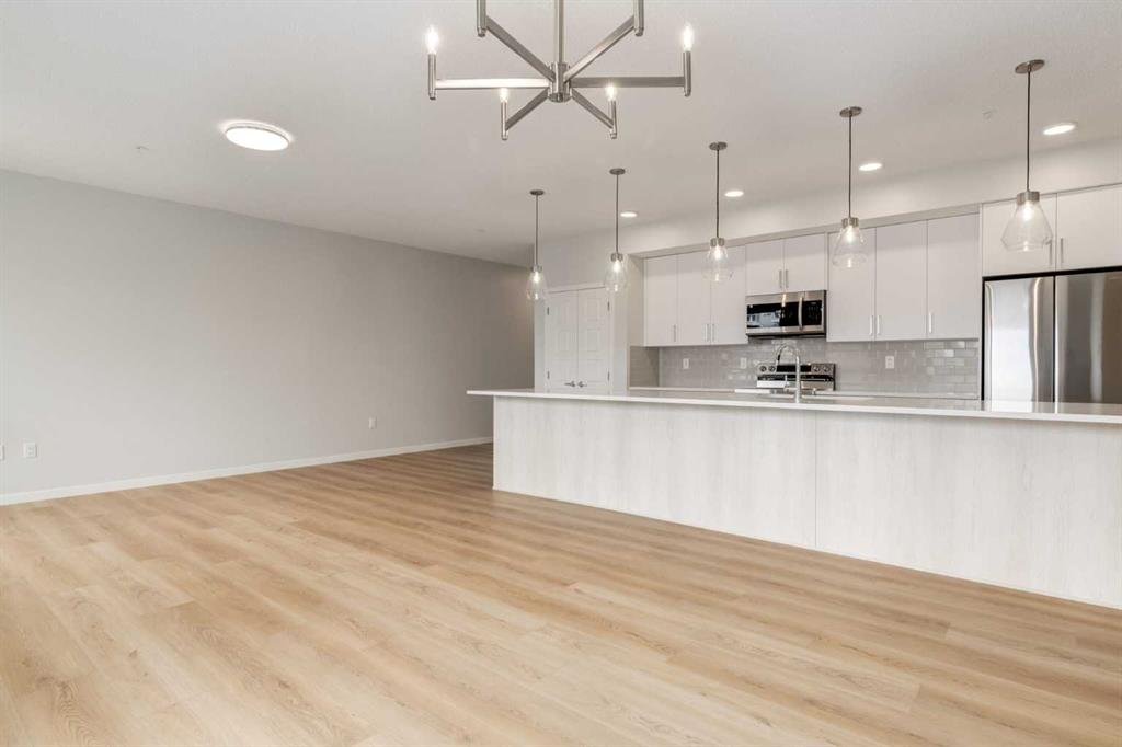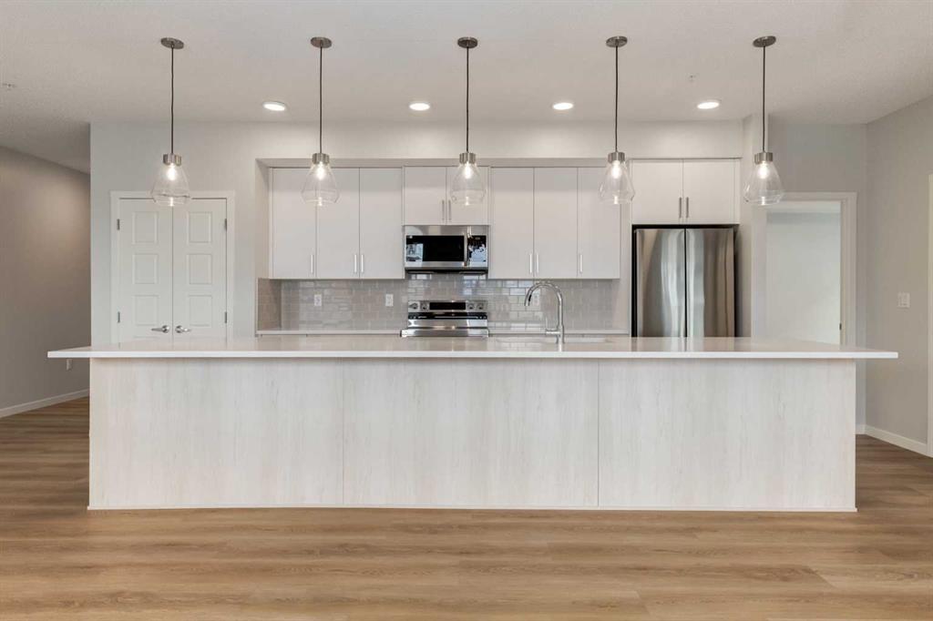 Introducing BELMONT PLAZA, a highly sought-after development in BELMONT, Calgary. BUILT BY CEDARGLEN LIVING, WINNER OF THE CustomerInsight BUILDER OF CHOICE AWARD, 5 YEARS RUNNING! BRAND NEW CORNER UNIT, "L4" floor plan with high-spec features. You will feel right at home in this well thought-out 1092.8 RMS sq.ft. (1165 sq.ft. builder size) 2 bed, 2 bath home with open plan, 9' ceilings, LVP flooring through-out (upgraded, no carpet), Low E triple glazed windows, electric baseboard heating, BBQ gas line on the patio, A/C Rough in, and Fresh Air System (ERV). The kitchen is spectacular with full height TWO TONE cabinets, extended island upgrade, quartz counters, undermount sink, S/S appliances and pantry. The extended island is stunning and transitions into the spacious living & dining area, perfect for entertaining. The spacious primary bedroom has a large bright window, sizeable walk-in closet and 4 pc ensuite with extra bank of drawers & full height tile upgrade. 1 additional bedroom located across the unit for noise reduction/privacy and 4pc bathroom (also with upgraded full height tile) located nearby. Laundry & storage closet is thoughtfully planned, definitely a must see (washer/dryer included). Highlights include: upgraded lighting package, sound reducing membrane to reduce sound transmission between floors, clear glass railing to balconies and 1 titled underground parking stall included. Steps away from shopping, restaurants and so much more. Belmont offers a vibrant neighbourhood that’s extremely well-connected through Calgary’s major arteries. Community living with inspired design. PET & RENTAL FRIENDLY COMPLEX.
