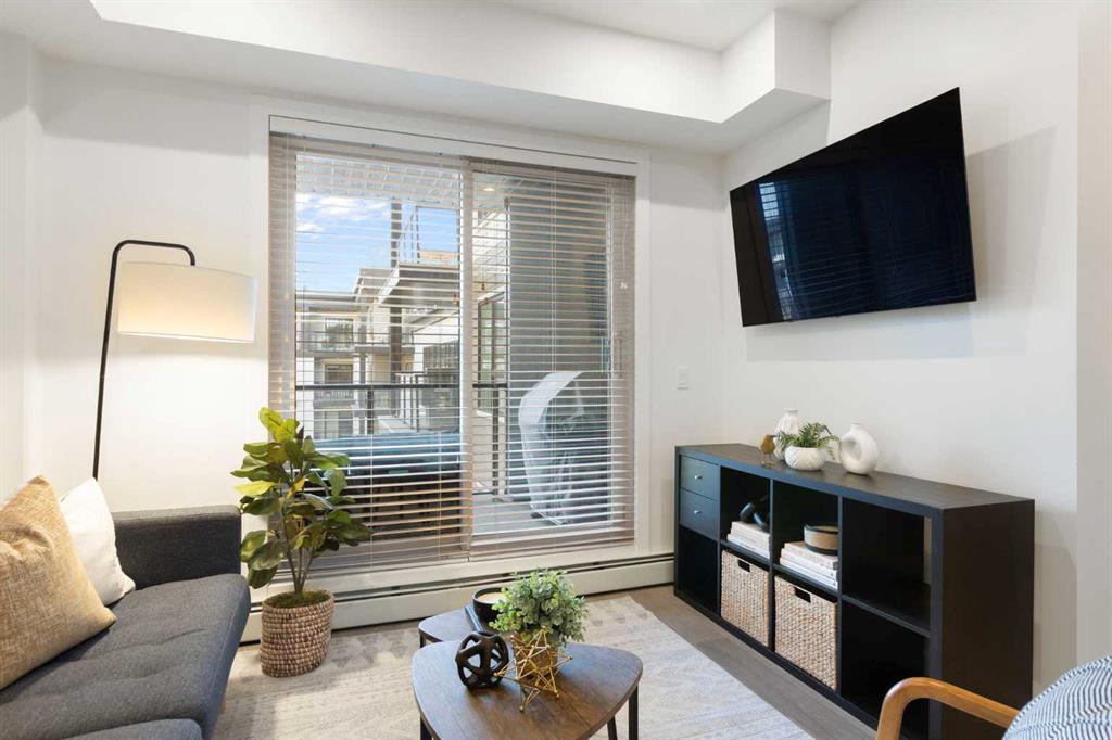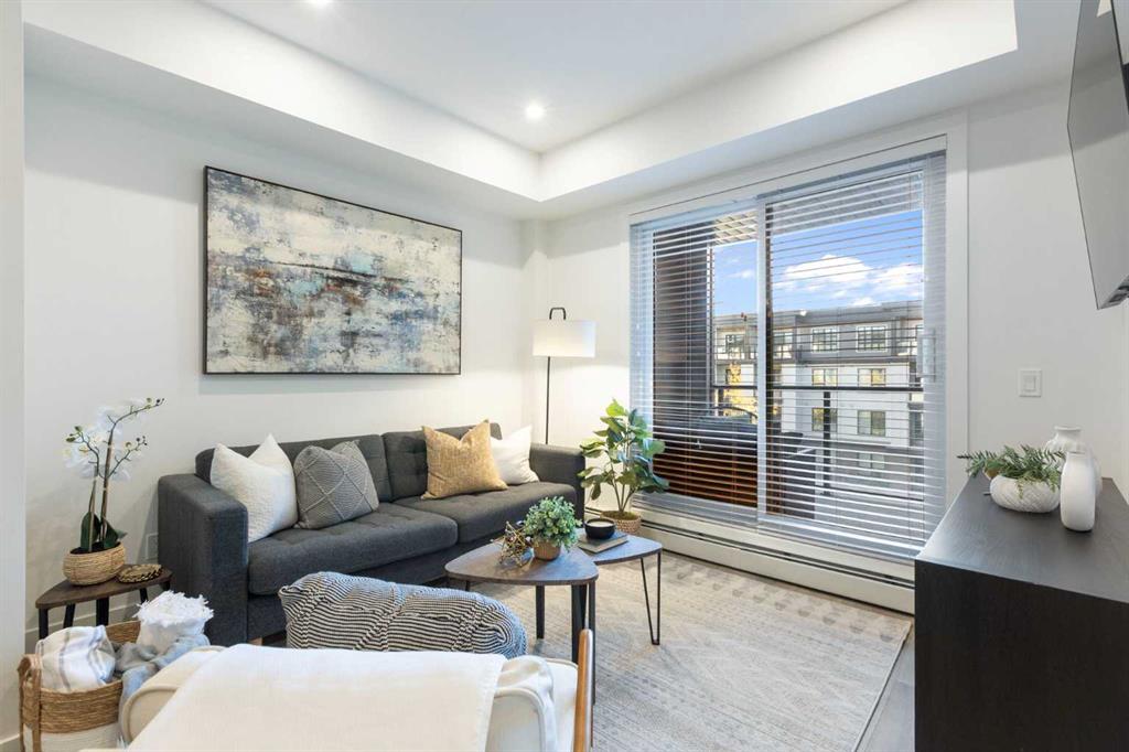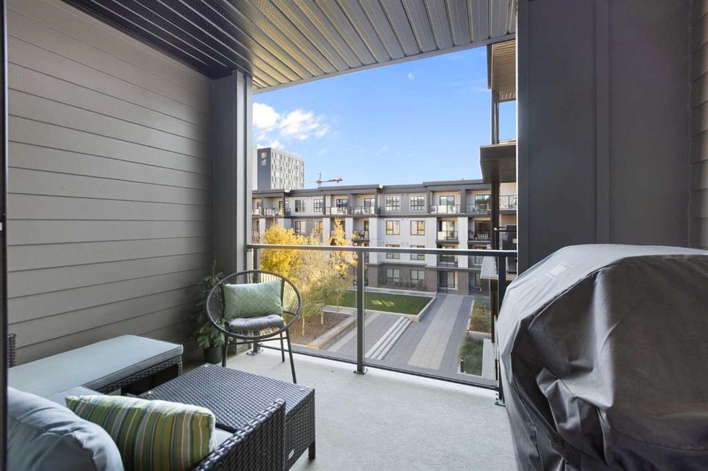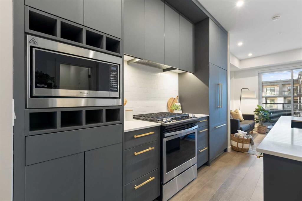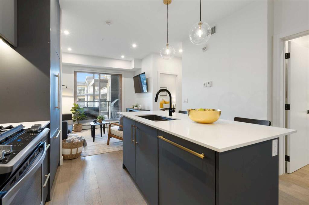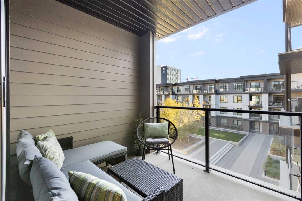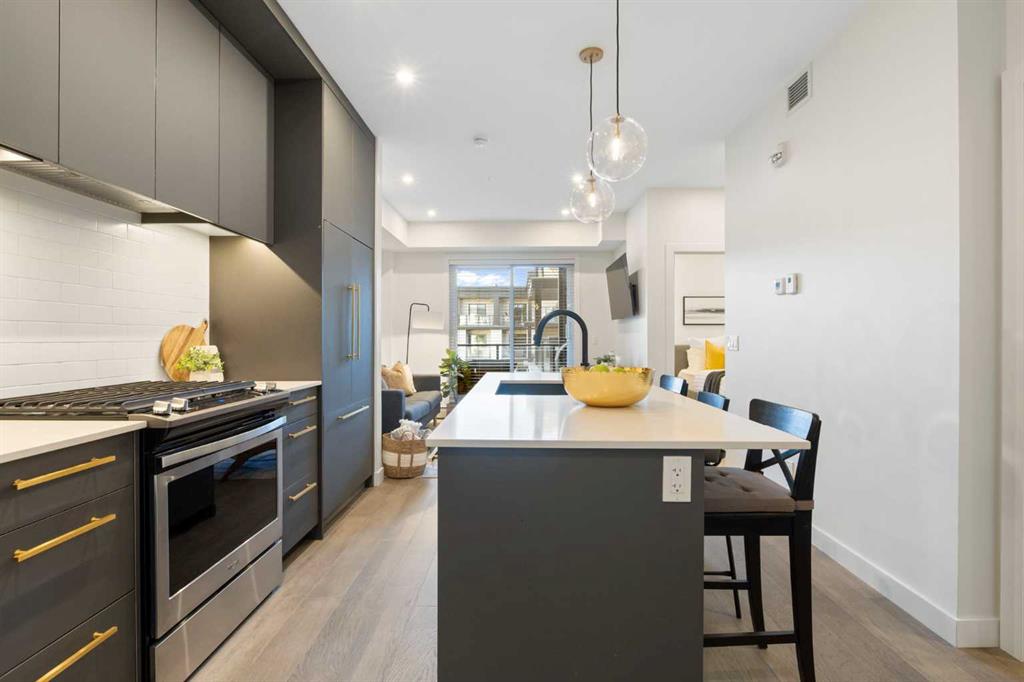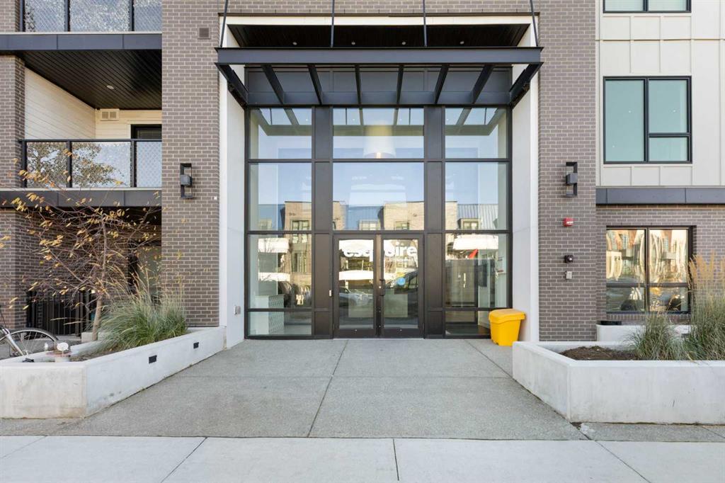 Elevate your lifestyle at Esquire’s Unit 325—where design, comfort, and connection define luxury in Calgary’s University District. DESIGN - Built by award-winning Truman Homes, Calgary’s builder of choice, this light-filled third-level unit offers 640 sq. ft. of open-concept living. Every element reflects modern sophistication, from the 9-foot ceilings and oak hardwood flooring to the premium fixtures and warm brass accents. The kitchen blends luxury and function with sleek charcoal cabinetry, soft-close drawers, an integrated wine rack, and elegant glass pendant lighting, while the white subway tile backsplash and under-cabinet lighting showcase the stainless steel microwave and gas range, and panelled appliances. Anchoring the heart of the home is the large white quartz island with seating for three, ideal for staying engaged for casual meals or hosting guests. COMFORT - Sun-drenched and airy floor plan with south-facing windows flows seamlessly to a covered balcony overlooking serene courtyard views. With 2 bedrooms, a stylish 4-piece bathroom, in-suite laundry, and LEED Platinum certification, this home offers a polished, comfortable experience. CONNECTION - Living up to its “Live Better” slogan, residents enjoy exclusive on-site amenities: 24-hour gym, workshop, pet spa, and bike room. Unique to this unit are titled heated underground parking and same-floor storage (no parkade trips), plus visitor parking in this pet-friendly building. Unmatched access to shop, sip, or get social at your favourite local cafes, shops, grocers, and restaurants, with an off-leash park and transit nearby. Quick drive to downtown and the mountains, and just a short walk to Alberta Children’s Hospital, Foothills Medical Centre, and University of Calgary, this home offers tremendous value in one of Calgary’s most desirable neighbourhoods. Perfect for first-time buyers, investors, downsizers, students, or healthcare professionals seeking unmatched convenience and community. Check out the online virtual tour, schedule your private showing today, and don’t miss the chance to own this exquisite Esquire condo Unit 325 in University District!