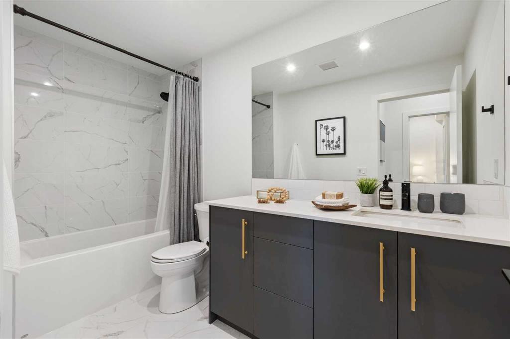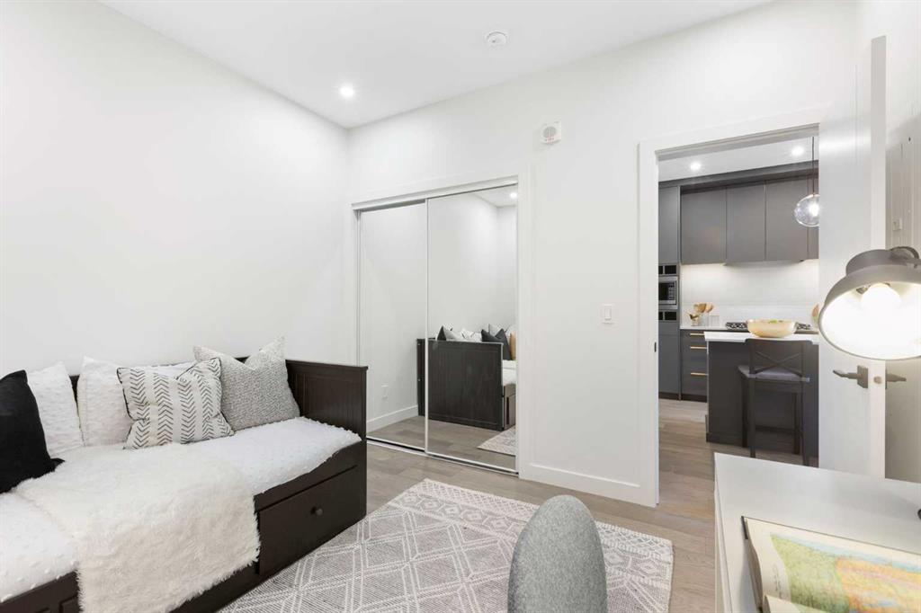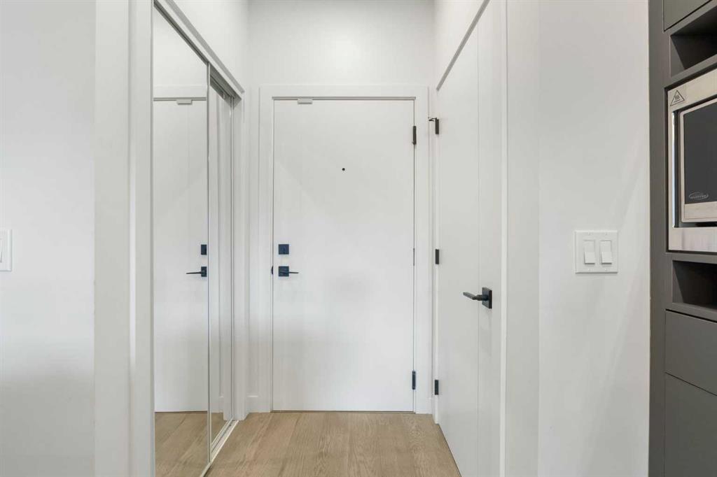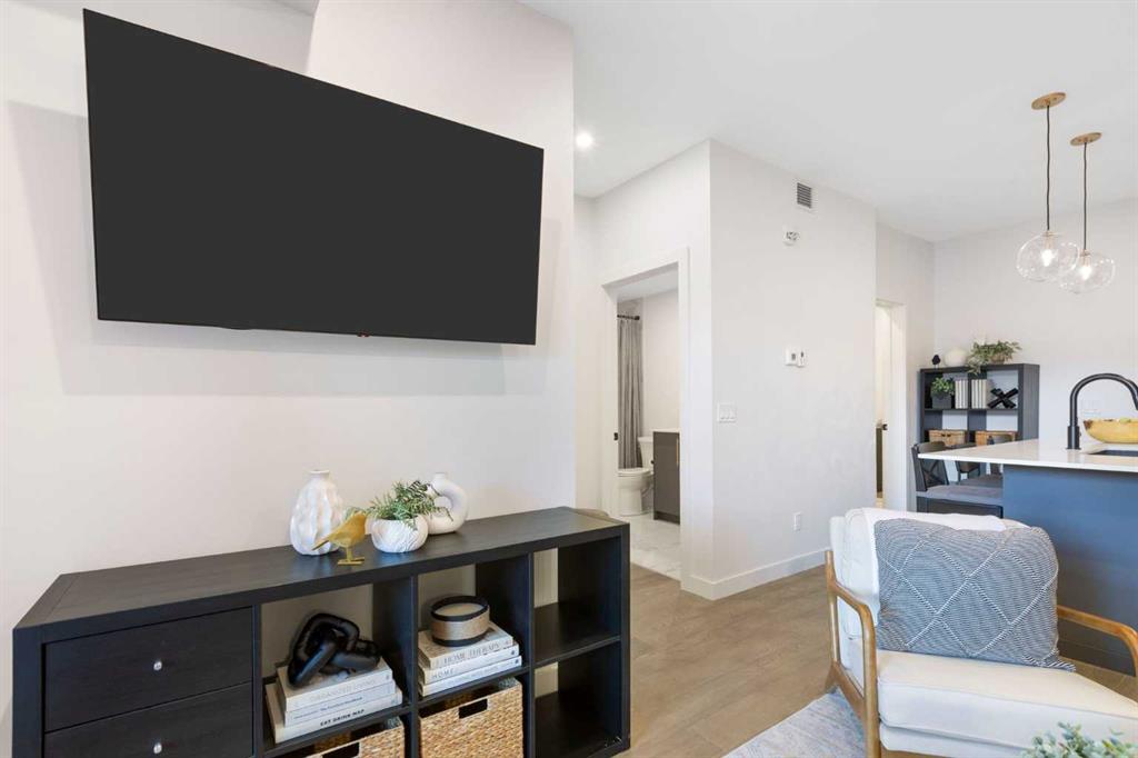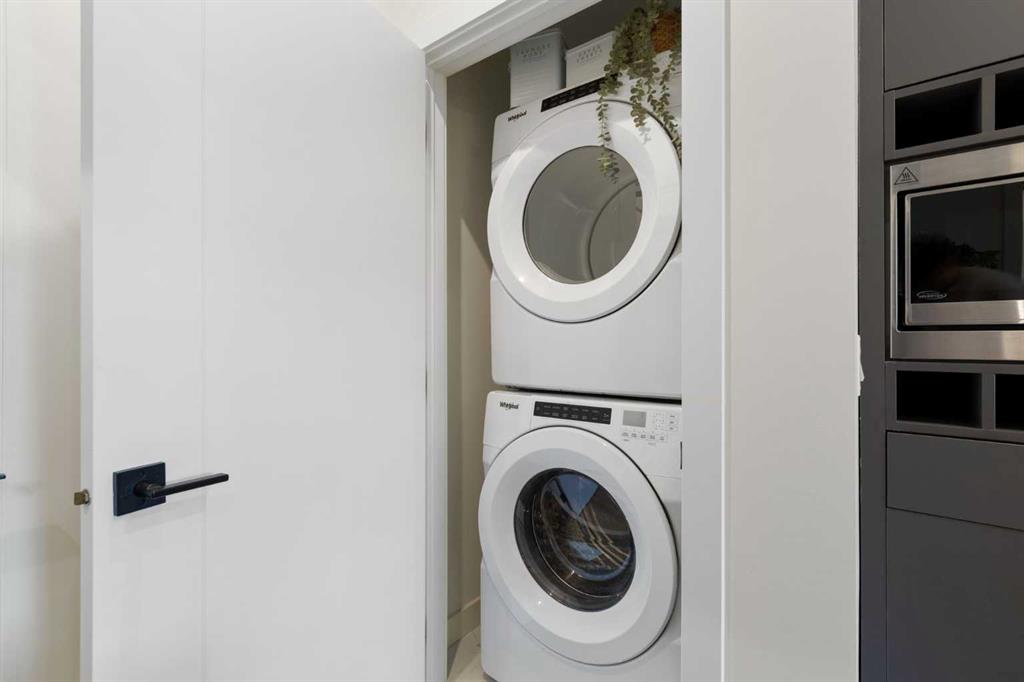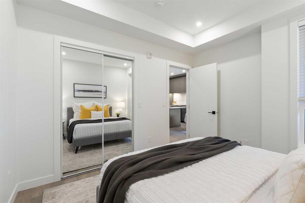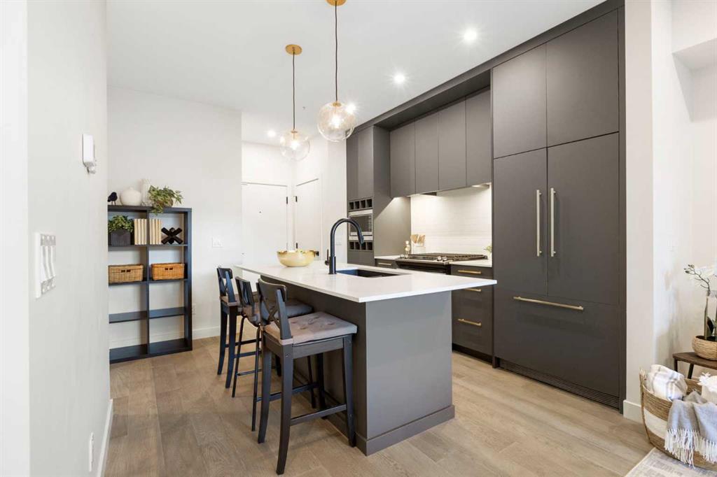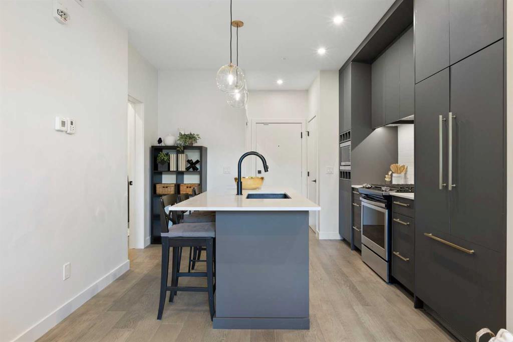 Elevate your lifestyle at Esquire’s Unit 325—where design, comfort, and connection define luxury in Calgary’s University District. DESIGN - Built by award-winning Truman Homes, Calgary’s builder of choice, this light-filled third-level unit offers 640 sq. ft. of open-concept living. Every element reflects modern sophistication, from the 9-foot ceilings and oak hardwood flooring to the premium fixtures and warm brass accents. The kitchen blends luxury and function with sleek charcoal cabinetry, soft-close drawers, an integrated wine rack, and elegant glass pendant lighting, while the white subway tile backsplash and under-cabinet lighting showcase the stainless steel microwave and gas range, and panelled appliances. Anchoring the heart of the home is the large white quartz island with seating for three, ideal for staying engaged for casual meals or hosting guests. COMFORT - Sun-drenched and airy floor plan with south-facing windows flows seamlessly to a covered balcony overlooking serene courtyard views. With 2 bedrooms, a stylish 4-piece bathroom, in-suite laundry, and LEED Platinum certification, this home offers a polished, comfortable experience. CONNECTION - Living up to its “Live Better” slogan, residents enjoy exclusive on-site amenities: 24-hour gym, workshop, pet spa, and bike room. Unique to this unit are titled heated underground parking and same-floor storage (no parkade trips), plus visitor parking in this pet-friendly building. Unmatched access to shop, sip, or get social at your favourite local cafes, shops, grocers, and restaurants, with an off-leash park and transit nearby. Quick drive to downtown and the mountains, and just a short walk to Alberta Children’s Hospital, Foothills Medical Centre, and University of Calgary, this home offers tremendous value in one of Calgary’s most desirable neighbourhoods. Perfect for first-time buyers, investors, downsizers, students, or healthcare professionals seeking unmatched convenience and community. Check out the online virtual tour, schedule your private showing today, and don’t miss the chance to own this exquisite Esquire condo Unit 325 in University District!