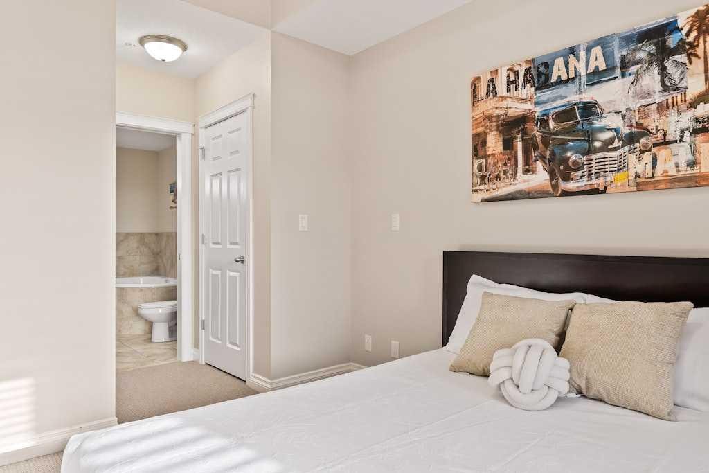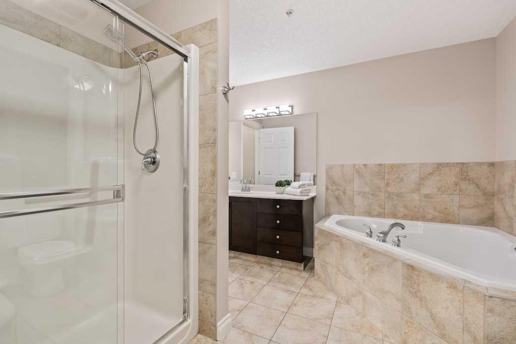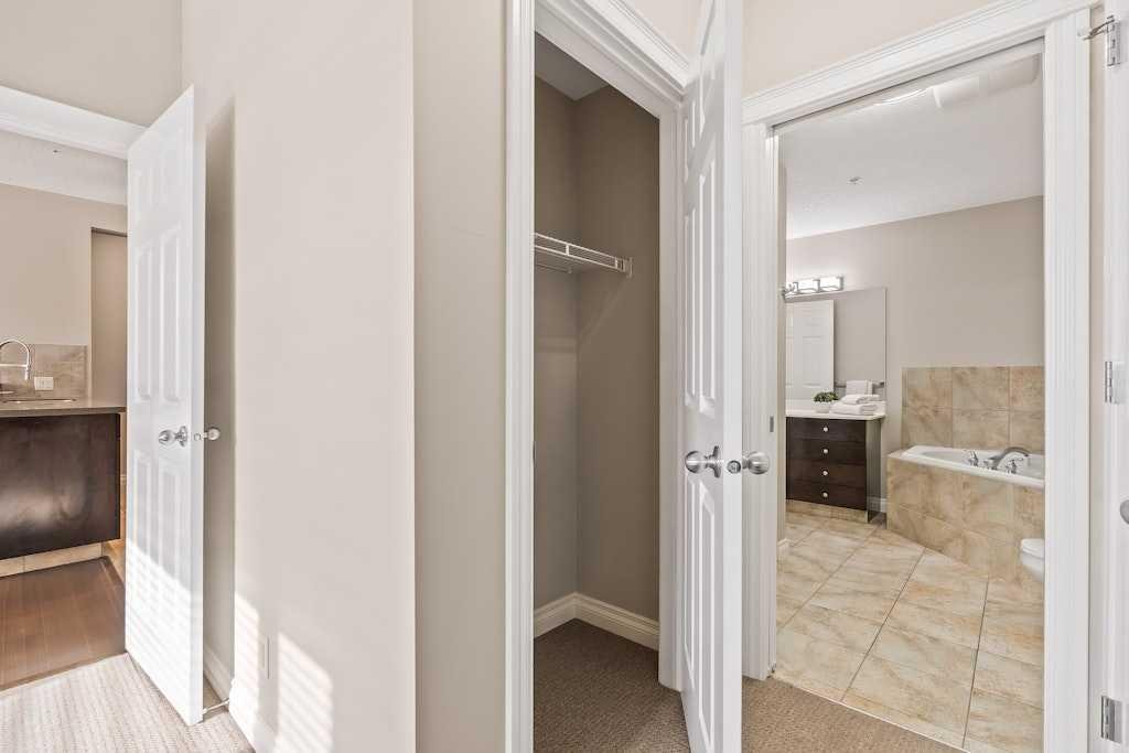 The primary bedroom is generously sized with two closets, space for a king-sized bed, side tables, and a dresser, plus a lovely window that fills the room with welcoming morning light. The oversized bathroom features IN-FLOOR HEAT, a separate soaker tub and shower, a generous vanity with excellent counter and mirror space, and an upgraded modern faucet.