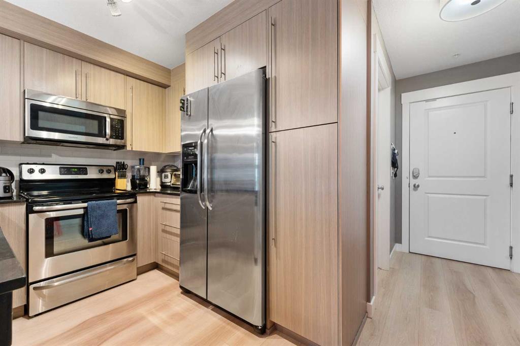 Welcome to your next home in Mahogany—one of Calgary’s most sought-after lake communities, where convenience, comfort, and year-round recreation come together. Located in the well-designed 51 Oak complex, this third-floor condo offers a wonderful blend of modern style and effortless living. Almost new and built around a beautifully landscaped central courtyard, the development features three thoughtfully arranged buildings that create a quiet, welcoming atmosphere from the moment you arrive. Inside, 2 bed home is bright, spacious, and impressively functional. Fresh new flooring installed in 2024 adds a clean, updated feel throughout. The open kitchen is designed for everyday ease—complete with sparkling stainless steel appliances (including a fridge with water and ice), granite countertops, a deep double sink with a bistro-style faucet, tall cabinetry, and a stylish subway tile backsplash. A convenient breakfast bar connects the kitchen to the main living area, creating an inviting space for both relaxing and entertaining. Large windows fill the home with natural light and offer a lovely view of the quiet courtyard below. The bathroom features a modern vessel sink and a deep soaker tub—ideal for unwinding at the end of the day. You’ll also enjoy the practicality of an in-suite stackable front-load washer and dryer. Step outside onto the spacious balcony, perfectly sized for enjoying a morning coffee, an evening beverage, or a bit of fresh air any time of day. Parking and storage are easy with your titled underground stall and attached storage locker—keeping your gear, tools, and seasonal items secure and out of the way. Living in Mahogany means having access to an incredible list of amenities: lake access for swimming, skating and fishing, beautifully maintained beaches, tennis courts, scenic ponds, endless walking trails, and vibrant community events. Shops, restaurants, groceries, and services are just minutes away, making day-to-day life simple and enjoyable. If you’ve been searching for a well-maintained, move-in-ready condo in a community that offers more than just a place to live, this home at 51 Oak delivers the lifestyle you’ve been waiting for.