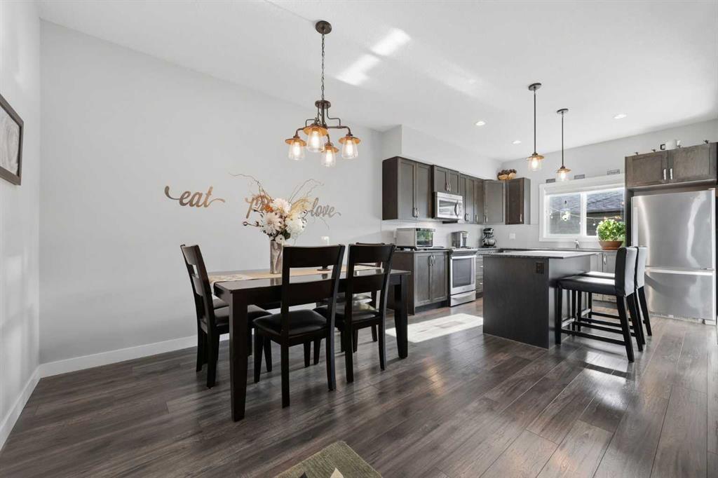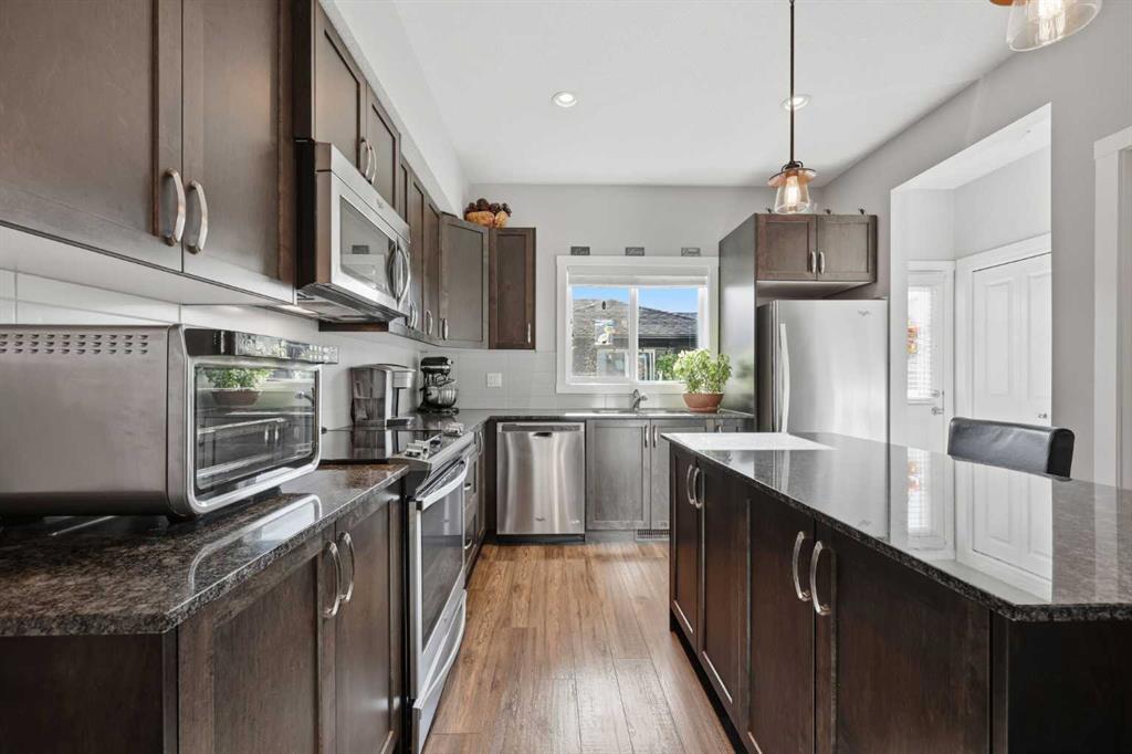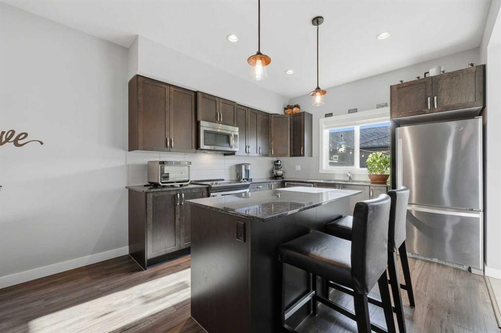 Gorgeous, one-owner home in absolute move-in condition! Step inside and fall in love with this exceptional property. An end unit with no condo fees, it offers both privacy and value. Beautifully landscaped with artificial grass, the sunny south-facing backyard is a true retreat; fully fenced, and perfect for enjoying your own private outdoor oasis. The main floor of this 2-storey townhouse features a bright, open layout highlighted by 9' ceilings and attractive, easy-care laminate flooring. The impressive kitchen showcases dark-stained cabinetry, upgraded stainless steel appliances, a large centre island, elegant quartz countertops and a spacious walk-in pantry. Additional features include an upper-floor laundry, a generous walk-in closet in the primary bedroom, knockdown ceilings, upgraded light fixtures, additional cabinets in bathrooms, and a charming balcony off the front bedroom. With 3 bedrooms, 2.5 bathrooms, an unspoiled basement with rough-in plumbing, and an insulated, drywalled, double garage this home truly checks all the boxes.
