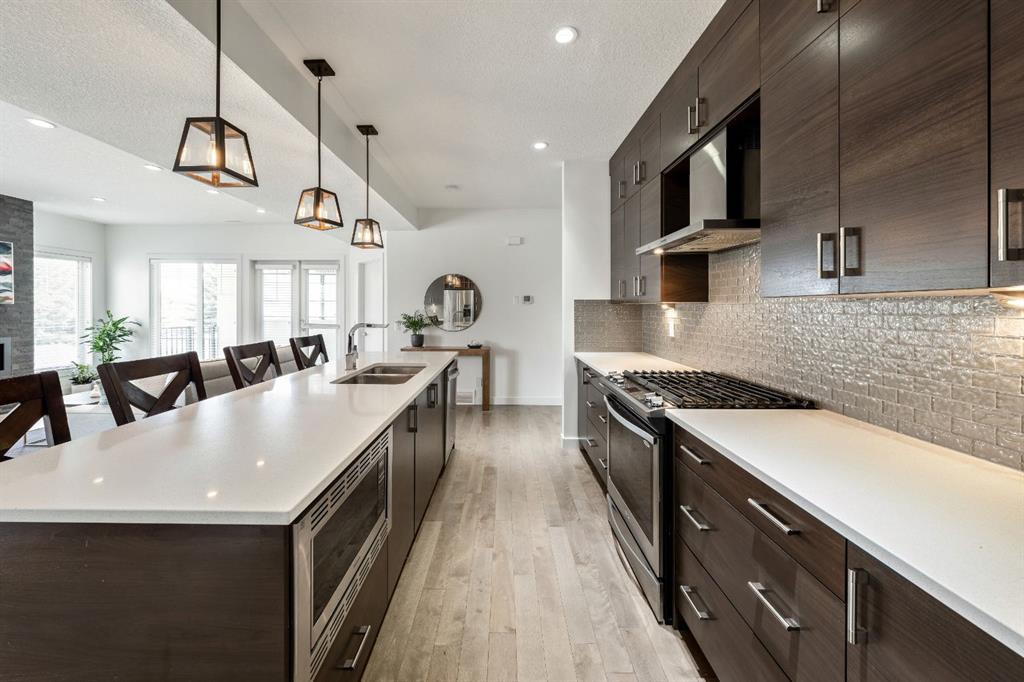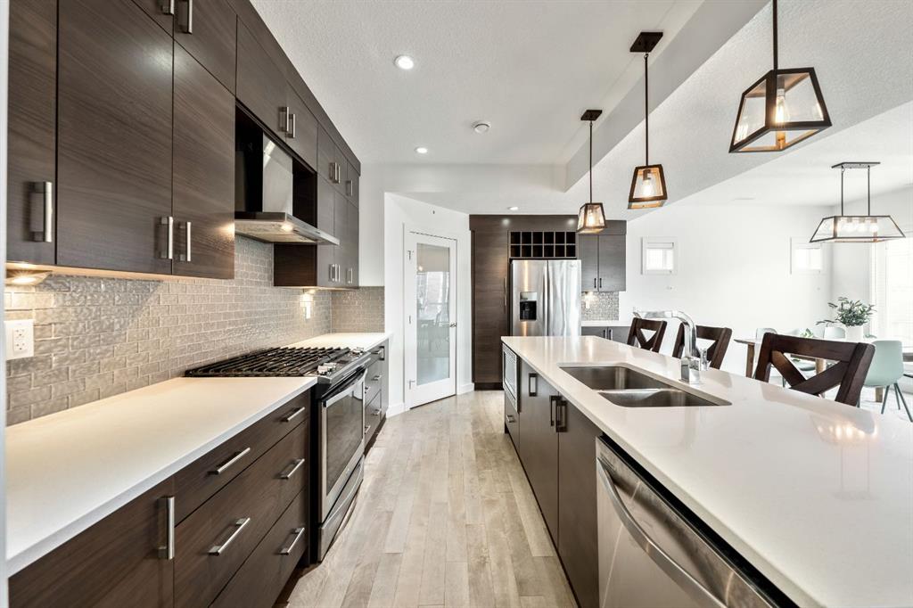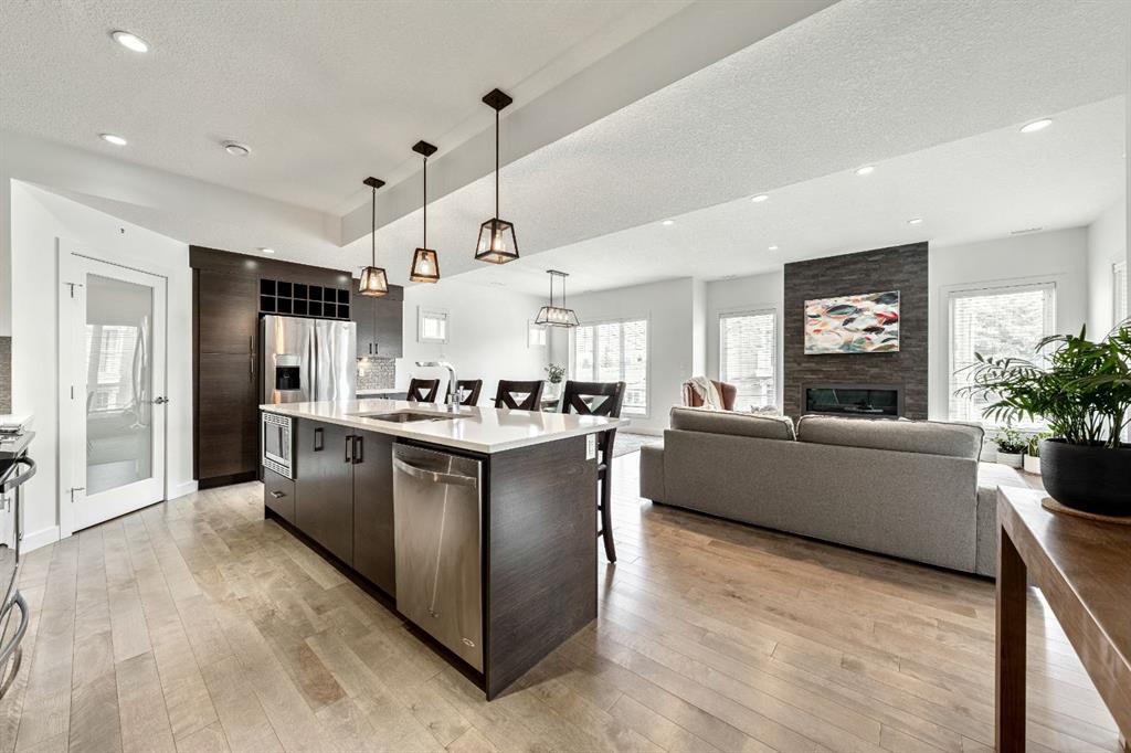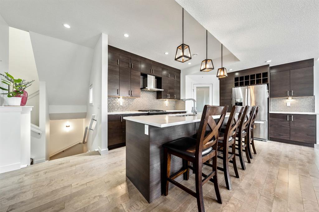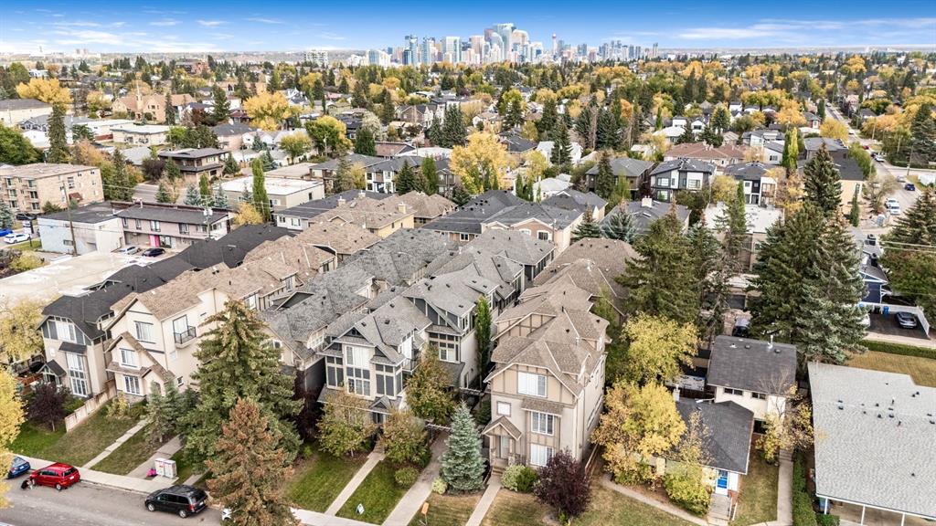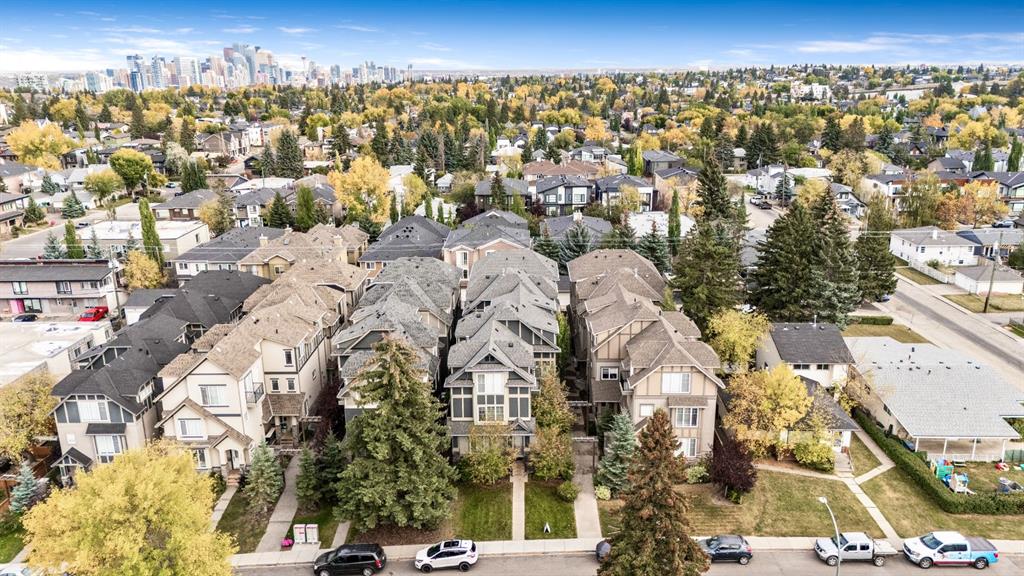 A rare opportunity to live in a luxurious end unit townhome on a quiet street offering over 2000 sq ft in the One of Calgary’s most desirable inner-city neighborhoods Killarney. This immaculate home has plenty of upgrades; 9’ knockdown ceilings, gleaming hardwood floors, upgraded plumbing fixtures, Hunter Douglas blinds, stone counters, custom closets, fresh paint, the comforts of air conditioning and a concrete wall separating you and the one neighbor. Head down the courtyard to unit 4 where you are greeted by a large front foyer and convenient direct access to the heated garage. This space was intentionally designed to be on its own separate level as a drop zone and to keep the mud and mess down and away. Upstairs is flooded with natural light. The massive chef inspired kitchen is a focal point with slow close cabinets that reach to the ceiling, built in wine rack, undercabinet lights, premium SS appliances (including a gas range) and chimney hood fan, an expansive 10-foot island with gorgeous quartz counters, timeless tile backsplash and a large corner pantry for additional storage. Perfect for entertaining the kitchen looks onto the spacious dining room and inviting living room showcasing a gas fireplace with stone detail. Off the living room is a large, covered patio and office perfect for those who work from home, or as a playroom. The powder room is tucked away on its on separate level for privacy and includes side by side laundry with cabinets to keep you organized. On the upper level are two well sized bedrooms one with downtown VIEWS, a 4pc main bath and the primary retreat. This generous sized primary is a true sanctuary with its own private patio a massive walk-in closet and a spa inspired ensuite Including dual sinks, a large soaker tub, and fully tiled shower with 10 mm glass. Beyond Home you will love the lifestyle. Only minutes away from downtown, close to parks, shops, restaurants, schools, the rec center, bow river path system, shaganappi golf course and ctrain! Providing endless opportunities for work and play. If you have been searching for a home that balances luxury with livability in an unbeatable location schedule your private tour today!
