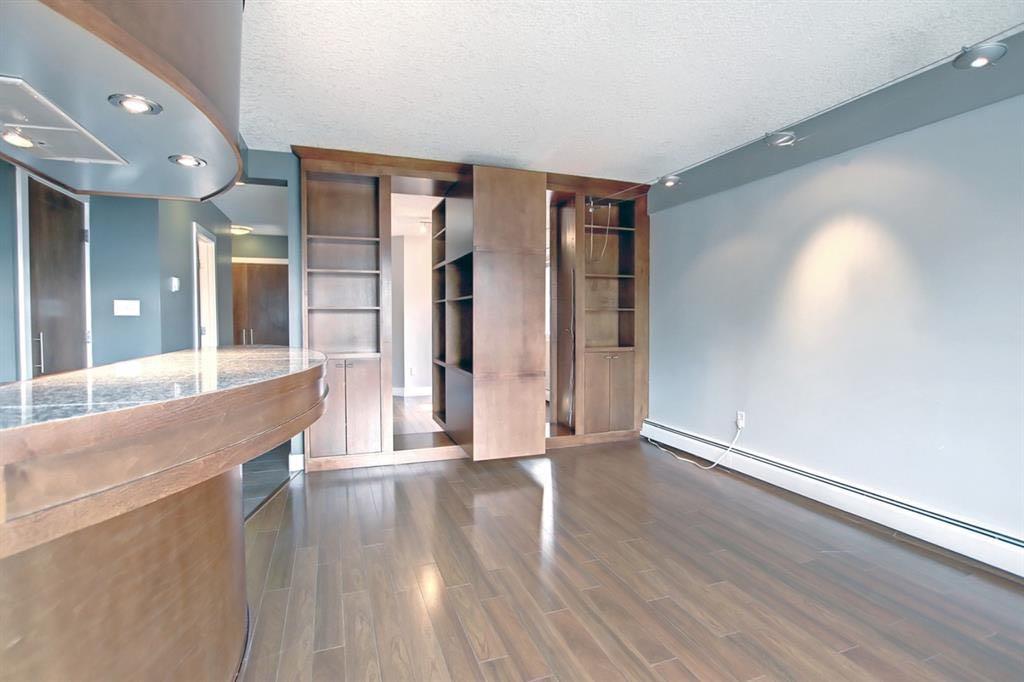 Welcome to this stylish and thoughtfully designed, top-floor 1-bedroom, 1-bathroom condo in the heart of Lower Mount Royal offers unbeatable location and charm just steps from 17th Avenue. Featuring custom woodwork throughout, including built-in bookshelves and a unique revolving media center that allows for a 60" TV viewable from both the living room and bedroom, this open-concept suite is filled with character and function. The bright west-facing layout includes oversized patio doors leading to a large balcony—perfect for entertaining with great views, sunshine, and space for a BBQ and patio set. The kitchen boasts a granite breakfast bar, ample cabinetry, a built-in wine rack, and tile flooring, while in-suite laundry adds everyday convenience. With assigned parking, extra storage, and stunning curb appeal in a well-maintained building, this condo is ideal for first-time buyers, professionals, or investors looking to enjoy one of Calgary’s most desirable inner-city neighborhoods.