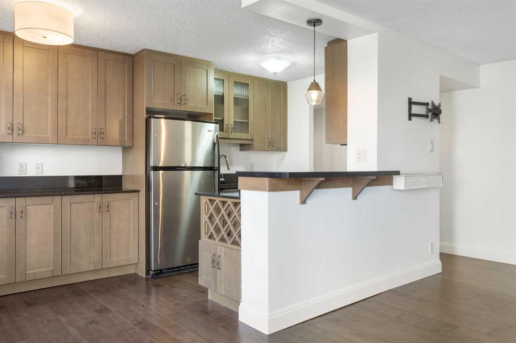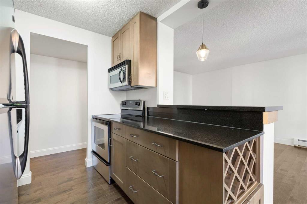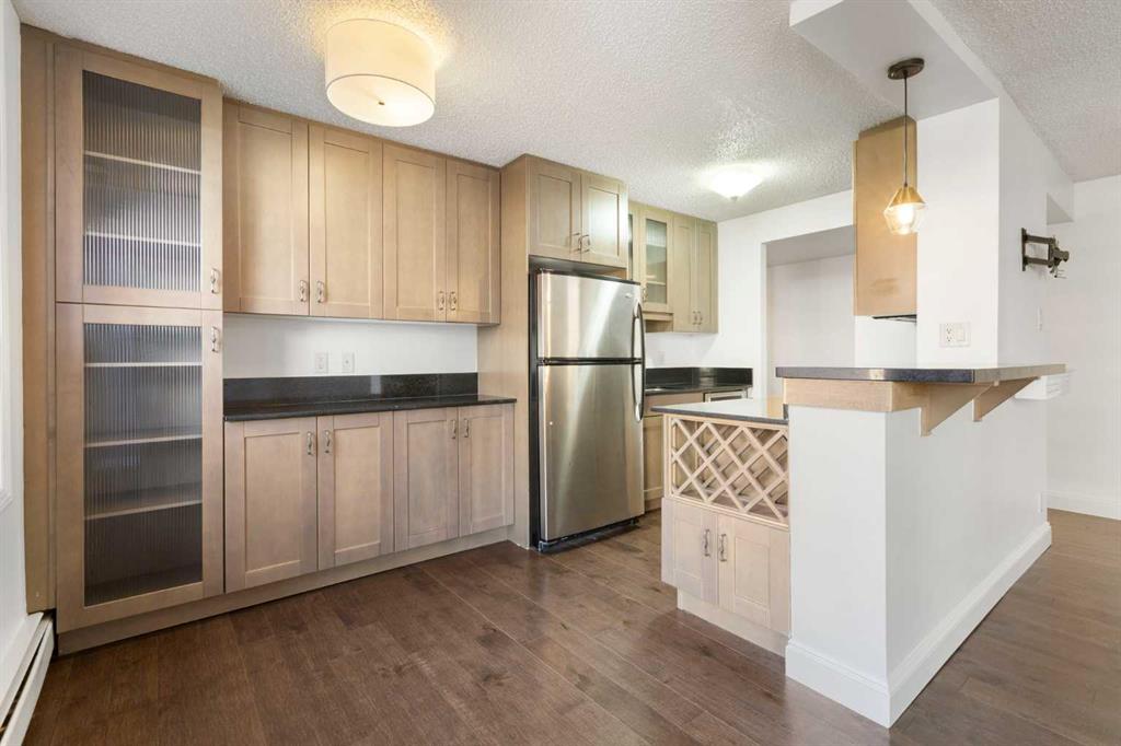 ELECTRICITY INCLUDED | STORAGE UNIT | GYM AND PARTY ROOM | WALK TO 17TH AVE | Centro 733 is a perfect location to enjoy the many nearby green spaces, walk to the bow river or pop over to trendy and vibrant 17th Ave for great food and entertainment. This 2-bedroom, 1 bathroom home offers an open floor plan featuring modern finishes such as hardwood floors, contemporary trim package, granite counter tops and stainless-steel appliances. In the kitchen you will enjoy stylish cabinetry with glass doors, an eat up bar and loads of storage for all your kitchen gadgets. The dining area allows for a dining table big enough for all your family gatherings. Both bedrooms are large enough for a queen bed. The bathroom boasts a large vanity, great for storage, a modern glass sink, tile surround in the shower with glass shower doors. This fabulous unit also comes with in suite laundry, a parking stall, gym, party room and the condo fees include electricity.