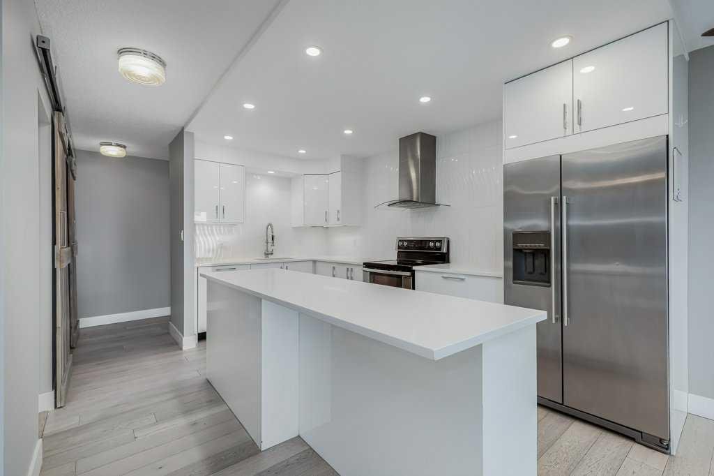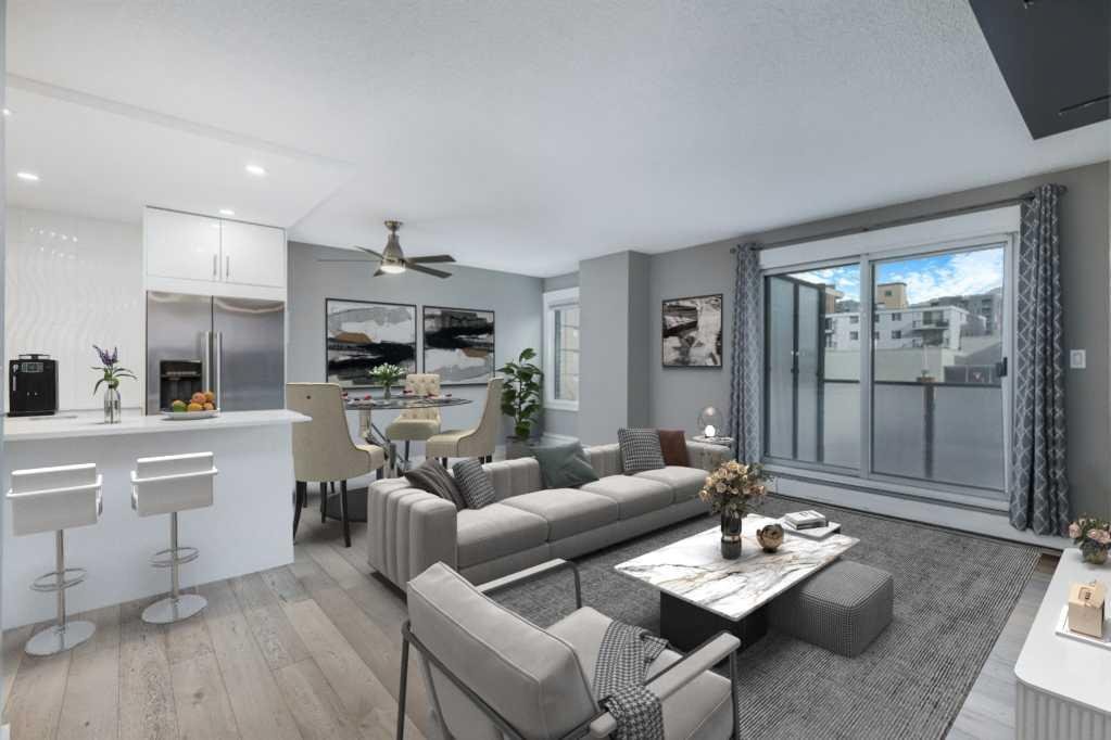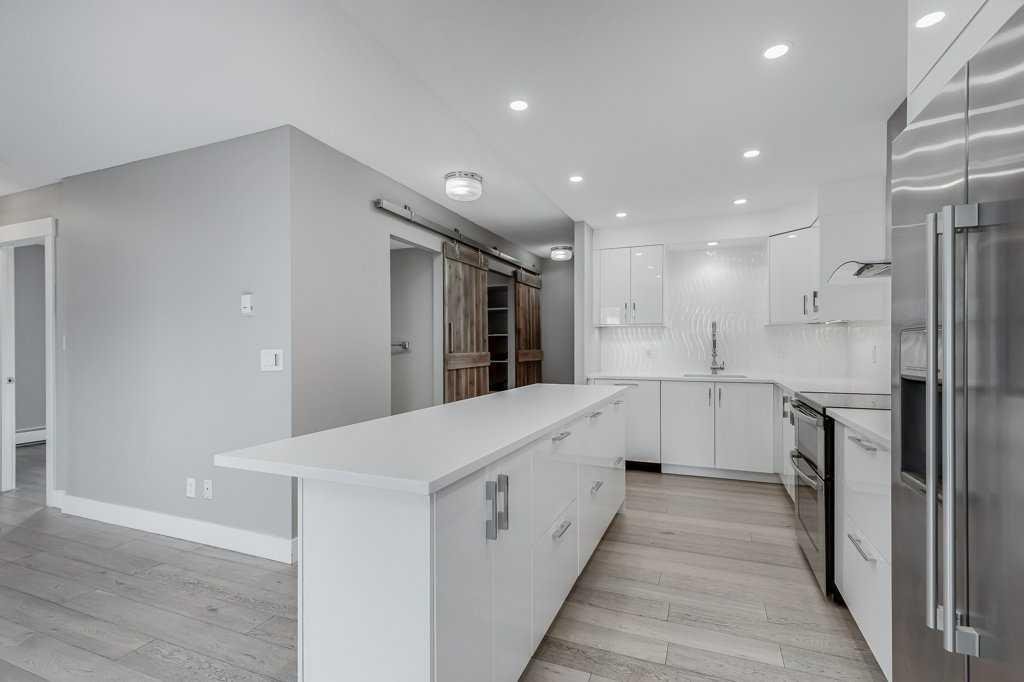 Modernly updated 2 bedroom unit with outstanding city views. Phenomenally located kitty-corner from Connaught Park and off-leash area (perfect since the building is pet-friendly upon board approval), mere steps to the infinite amenities on 14th Street and the vibrancy of 17th Ave! The perfect inner-city lifestyle awaits with nightlife, dining, pubs, cafes, diverse shops and much more just moments away then come home to a quiet treelined street. Inside this beautifully updated unit are gleaming hardwood floors, a neutral colour pallet, trendy barn sliding doors, designer finishes and cleverly incorporated storage solutions. The open floor plan is bright and spacious with clear sightlines amongst all the principal rooms encouraging unobstructed conversations. Culinary adventures are inspired in the stunning kitchen featuring full-height sleek cabinetry, stainless steel appliances, quartz countertops and a large island with casual breakfast bar seating. A dedicated dining area easily hosts larger gatherings, while the adjacent living room invites you to sit back and relax. The expansive “L” shaped, covered balcony entices warm weather barbecues, peaceful morning coffees and unlimited people watching with the city lights as the enchanting backdrop. Both bedrooms are generously sized with large closets and easy access to the stylish 4-piece bathroom. In-suite laundry too for ultimate convenience. Assigned underground parking adds to your comfort, allowing you to leave your vehicle at home while you explore Calgary’s premier entertainment district. Everything is close at hand plus just a quick bike ride to the river, downtown and beyond! Truly an outstanding location for this move-in ready home.
