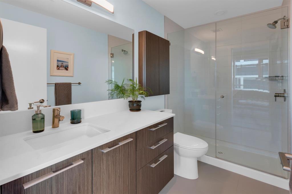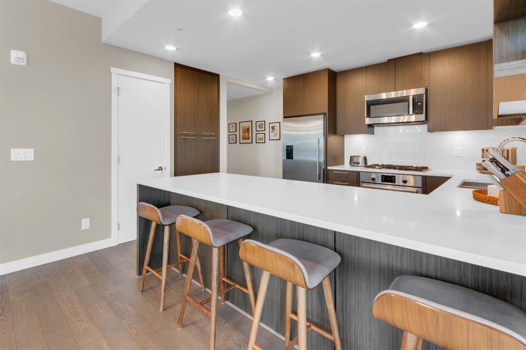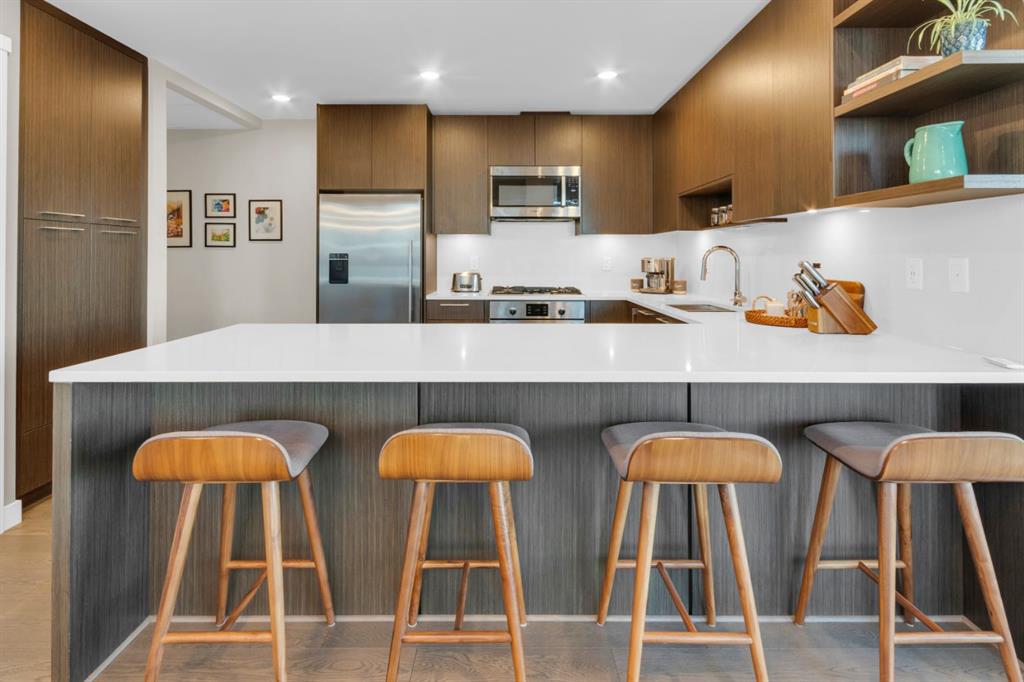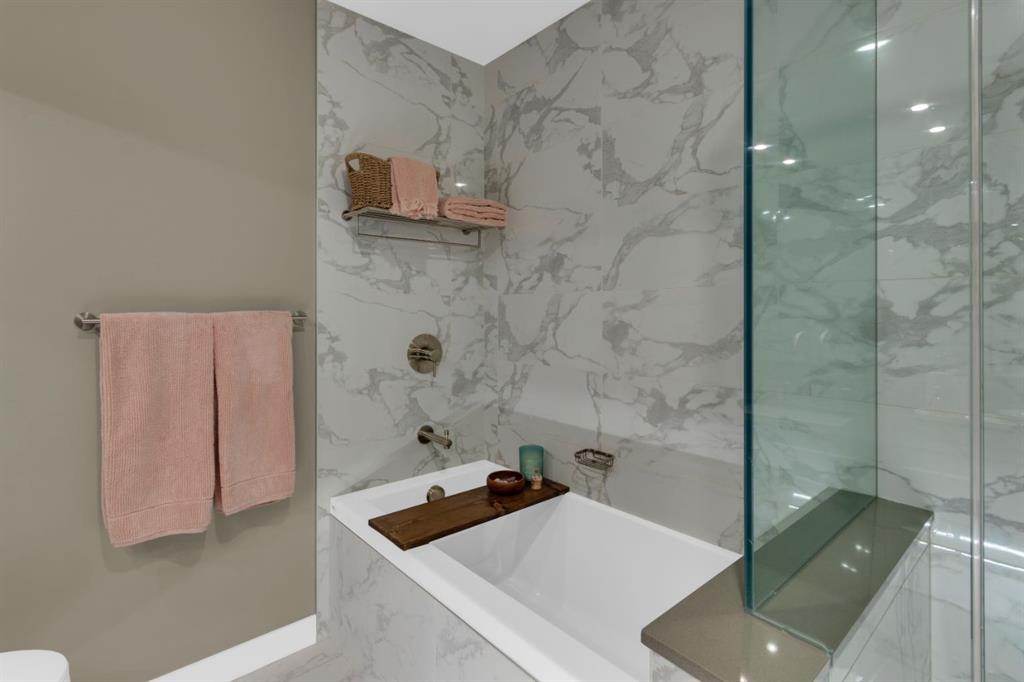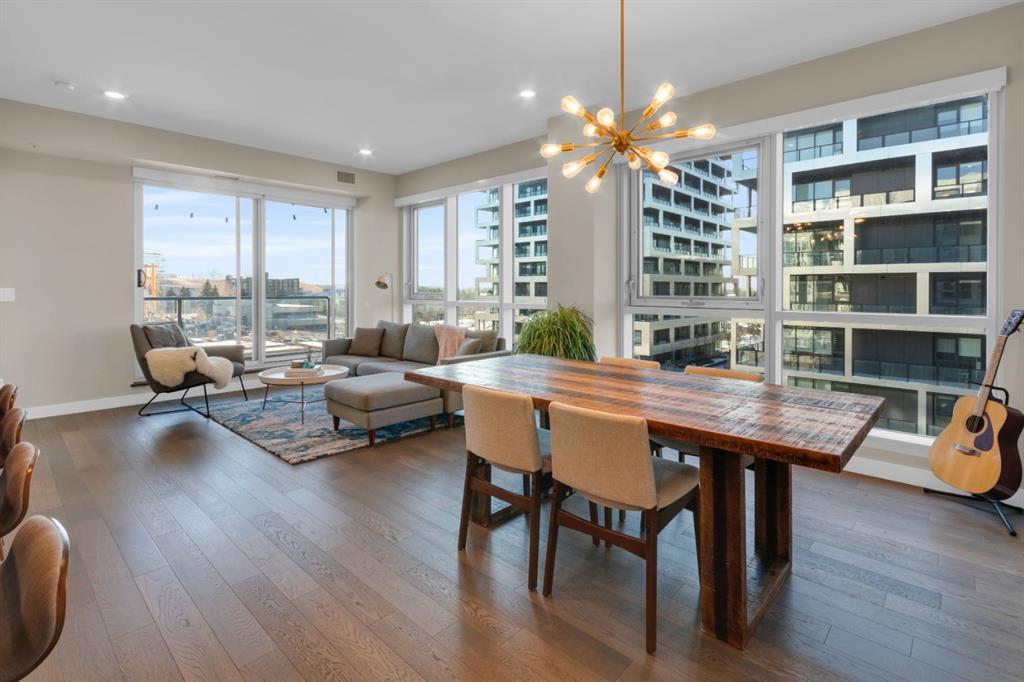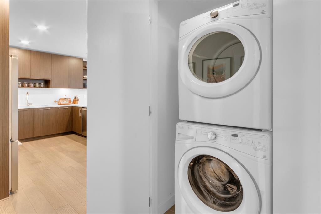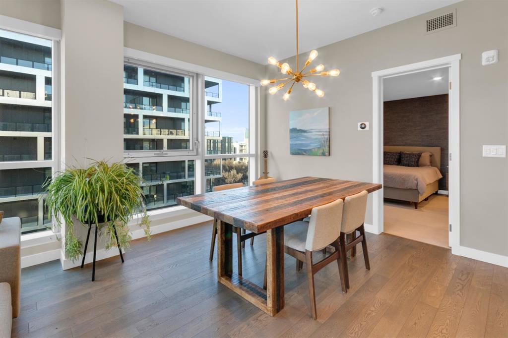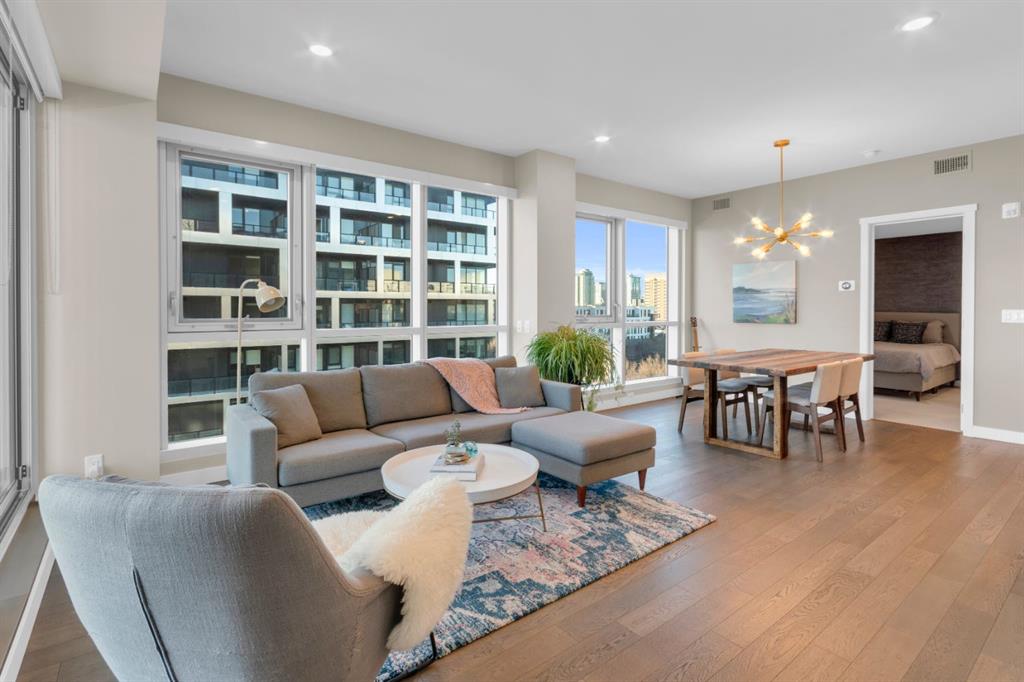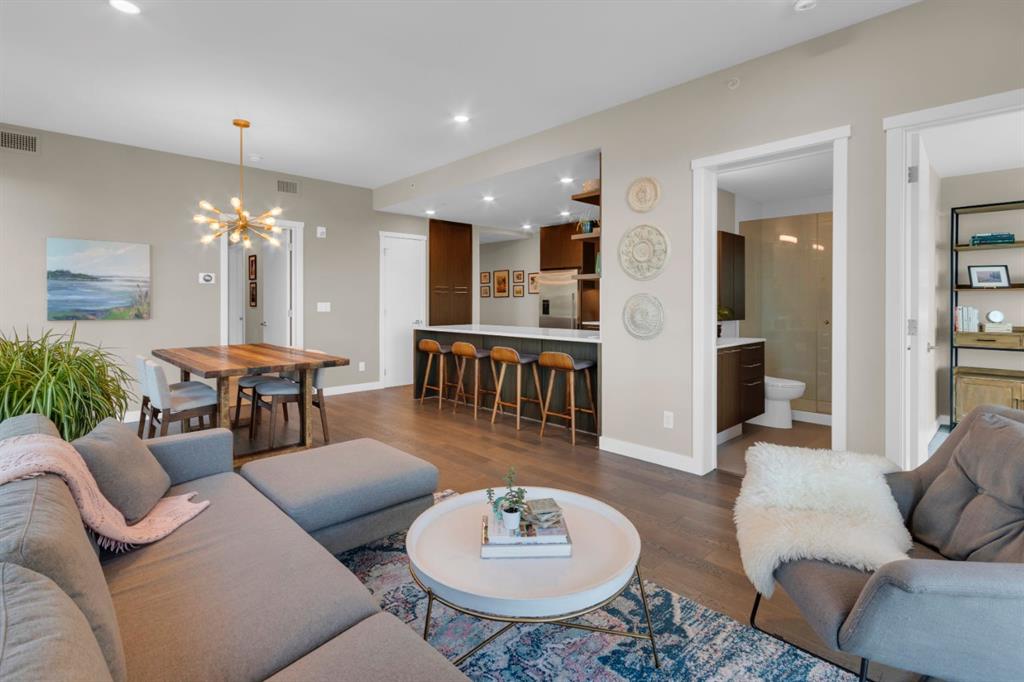 Located in Bridgeland’s award-winning Radius building by Bucci developments, this 2-bedroom, 2-bathroom unit offers refined urban living, with an emphasis on wellness and walkability. The home features a well-considered layout anchored by a modern, streamlined kitchen equipped with integrated Bosch appliances, quartz counters, a gas cooktop, under-cabinet lighting, and full-height cabinetry. Adjacent to the kitchen, the dining area comfortably accommodates a full-sized table, making the space suitable for both daily living and entertaining. The open-concept living room enjoys natural light from expansive windows and direct access to a large, south-facing balcony—ideal for enjoying views, and maximizing indoor-outdoor living. The primary suite includes a spacious walk-through closet and a 5-piece ensuite with dual sinks, soaker tub, and separate glass-enclosed shower, while the second bedroom is served by a nearby 3-piece bath. Additional features include in-suite laundry, smart thermostats, a custom storage solution at the front entrance, underground titled parking stall, and a secure storage locker (conveniently located on the same level as this unit). Radius is a LEED Platinum-certified concrete building offering concierge service, a rooftop terrace with fireplace and seating area offering downtown views, two fitness centres, a yoga studio, a spin room, pet wash, car wash, bike/ski tuning station, and secure bike storage. Located across from Murdoch Park and the Bridgeland Riverside Community Centre, and steps to local cafés, top-tier restaurants, organic markets, schools, and the C-Train, with downtown accessible in under 10 minutes.