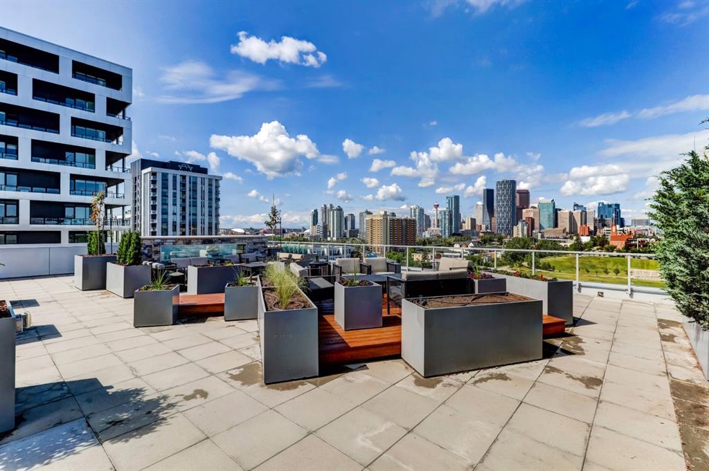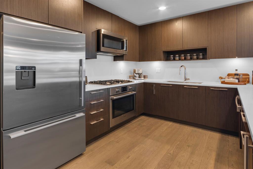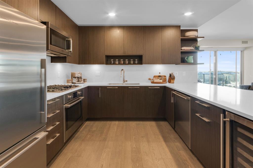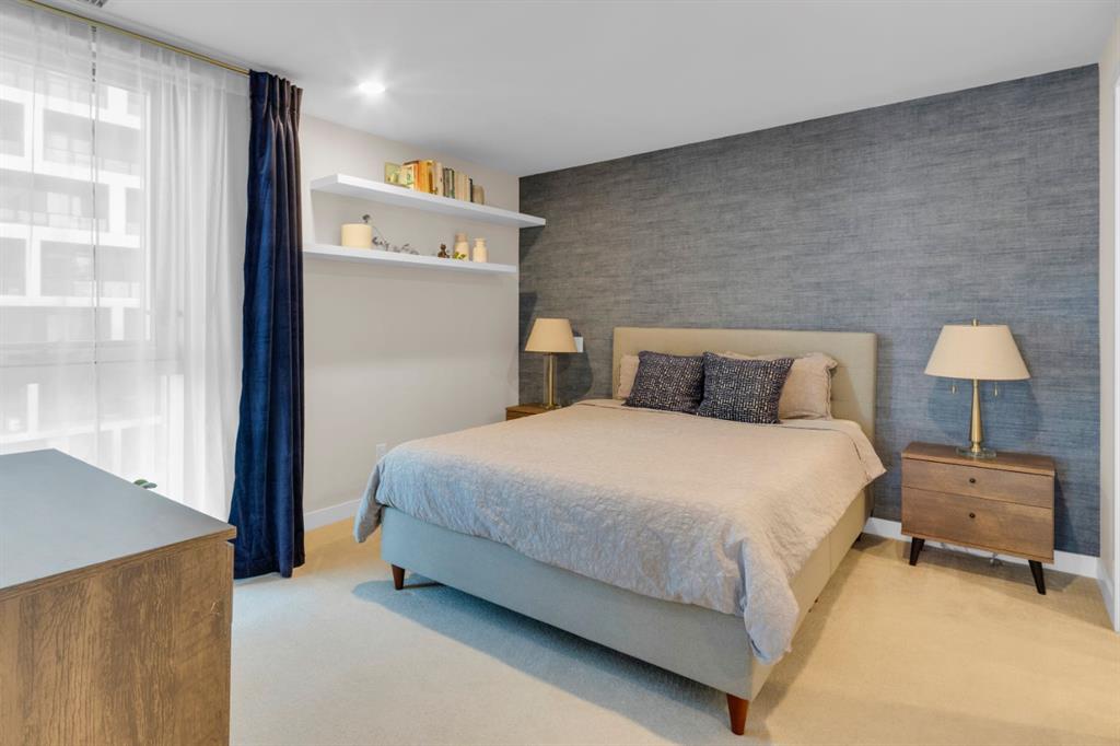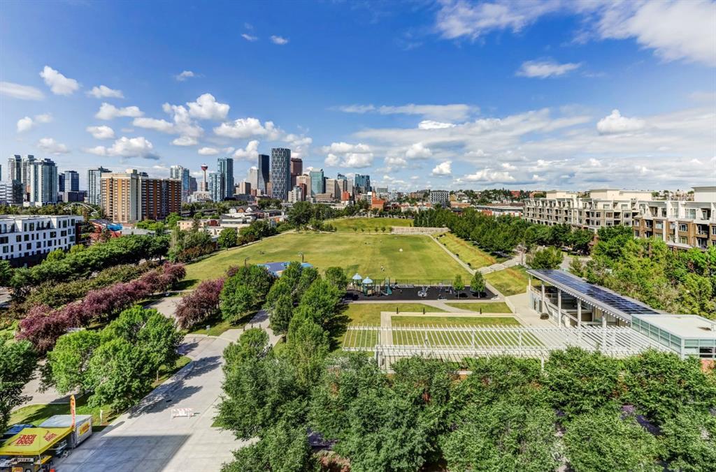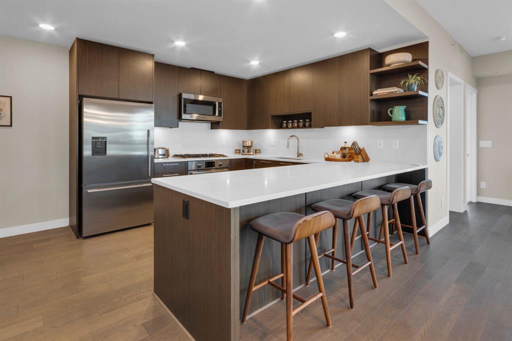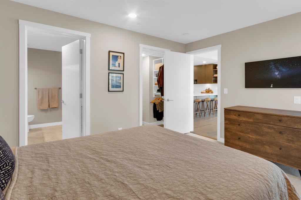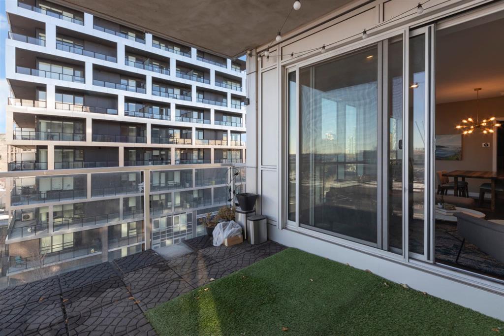 Located in Bridgeland’s award-winning Radius building by Bucci developments, this 2-bedroom, 2-bathroom unit offers refined urban living, with an emphasis on wellness and walkability. The home features a well-considered layout anchored by a modern, streamlined kitchen equipped with integrated Bosch appliances, quartz counters, a gas cooktop, under-cabinet lighting, and full-height cabinetry. Adjacent to the kitchen, the dining area comfortably accommodates a full-sized table, making the space suitable for both daily living and entertaining. The open-concept living room enjoys natural light from expansive windows and direct access to a large, south-facing balcony—ideal for enjoying views, and maximizing indoor-outdoor living. The primary suite includes a spacious walk-through closet and a 5-piece ensuite with dual sinks, soaker tub, and separate glass-enclosed shower, while the second bedroom is served by a nearby 3-piece bath. Additional features include in-suite laundry, smart thermostats, a custom storage solution at the front entrance, underground titled parking stall, and a secure storage locker (conveniently located on the same level as this unit). Radius is a LEED Platinum-certified concrete building offering concierge service, a rooftop terrace with fireplace and seating area offering downtown views, two fitness centres, a yoga studio, a spin room, pet wash, car wash, bike/ski tuning station, and secure bike storage. Located across from Murdoch Park and the Bridgeland Riverside Community Centre, and steps to local cafés, top-tier restaurants, organic markets, schools, and the C-Train, with downtown accessible in under 10 minutes.