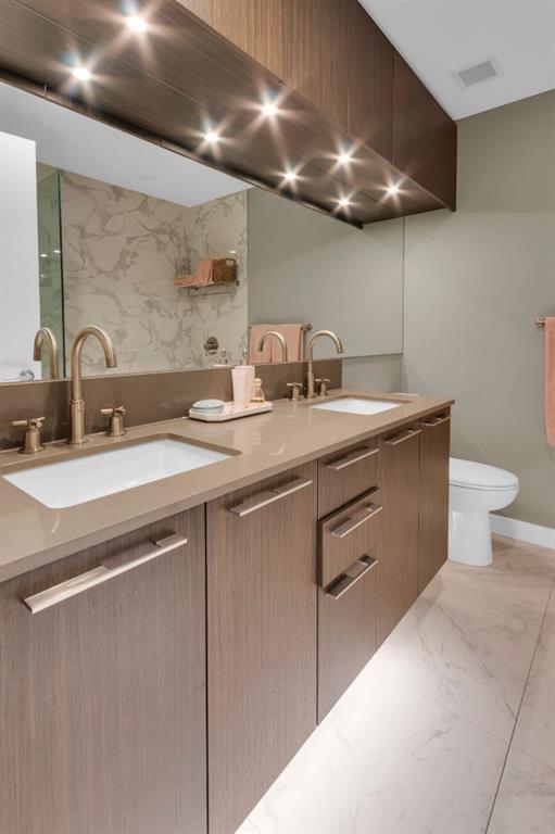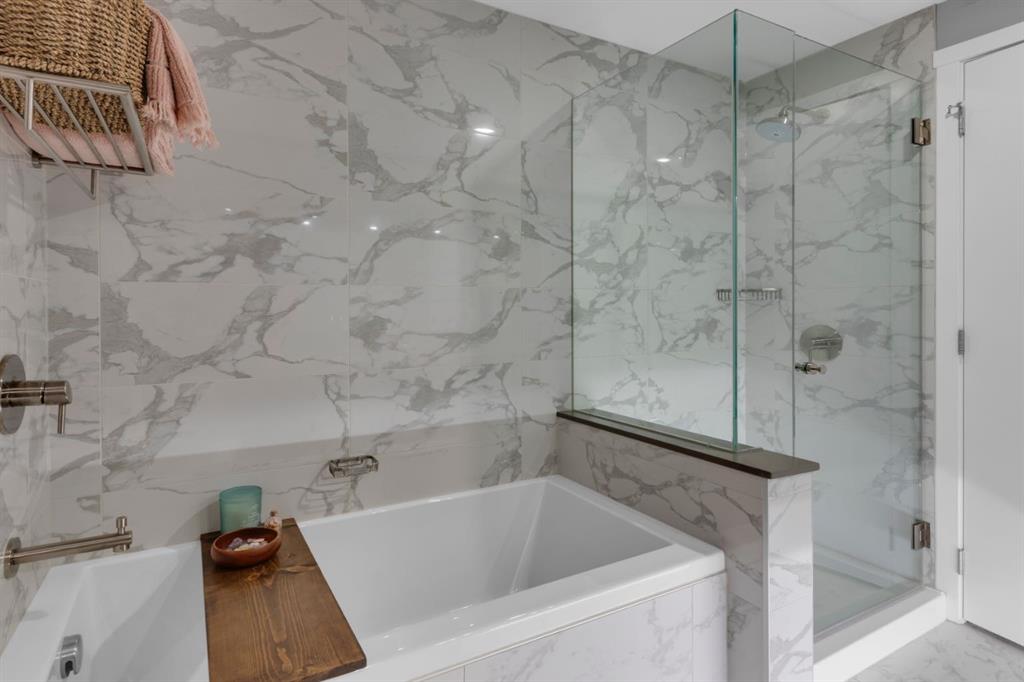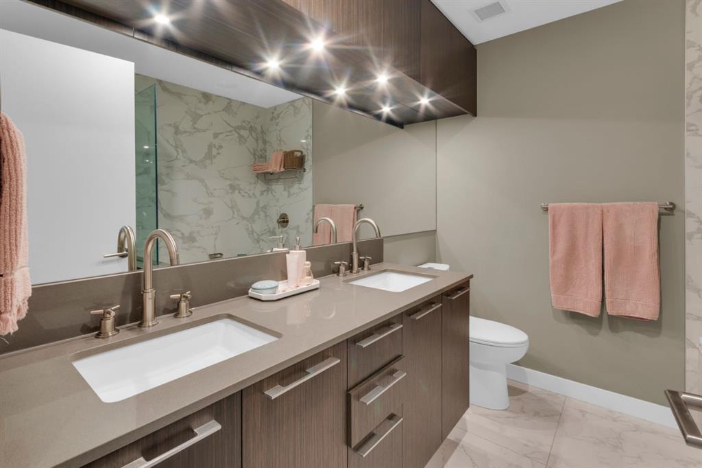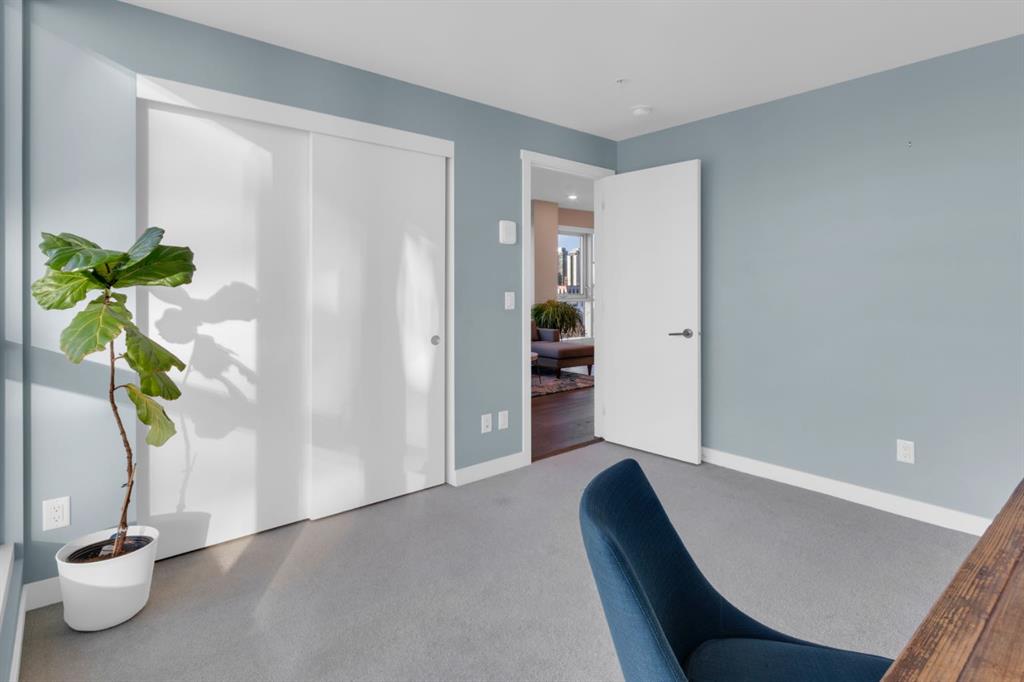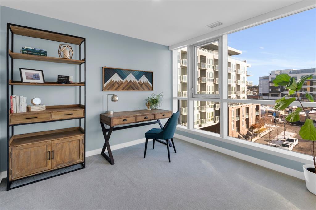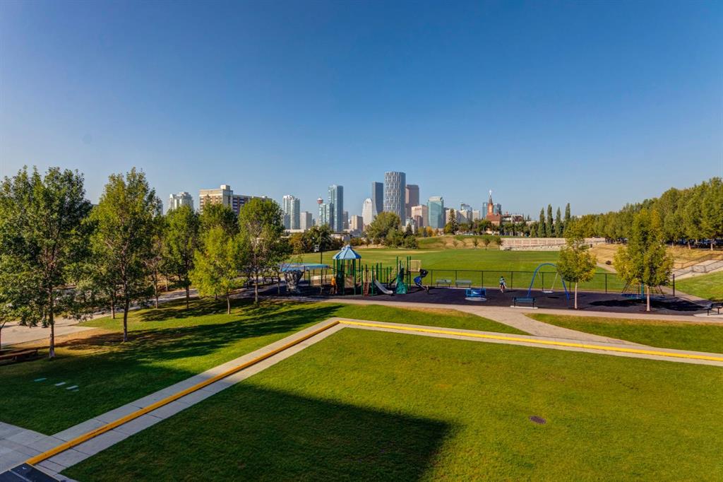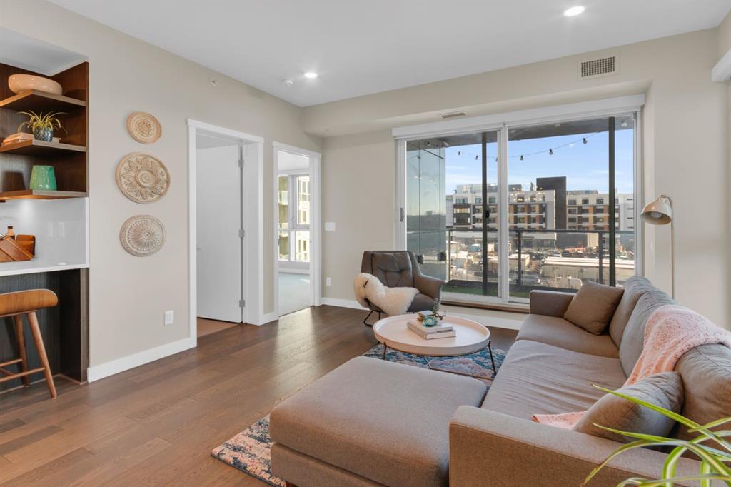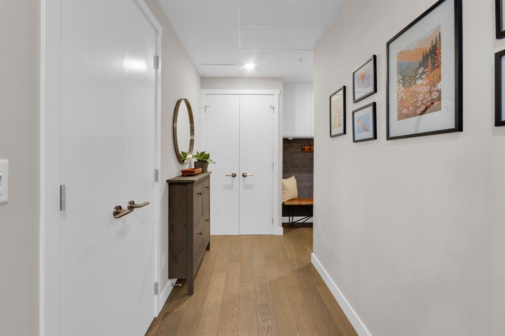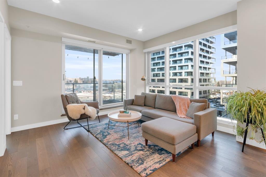 Located in Bridgeland’s award-winning Radius building by Bucci developments, this 2-bedroom, 2-bathroom unit offers refined urban living, with an emphasis on wellness and walkability. The home features a well-considered layout anchored by a modern, streamlined kitchen equipped with integrated Bosch appliances, quartz counters, a gas cooktop, under-cabinet lighting, and full-height cabinetry. Adjacent to the kitchen, the dining area comfortably accommodates a full-sized table, making the space suitable for both daily living and entertaining. The open-concept living room enjoys natural light from expansive windows and direct access to a large, south-facing balcony—ideal for enjoying views, and maximizing indoor-outdoor living. The primary suite includes a spacious walk-through closet and a 5-piece ensuite with dual sinks, soaker tub, and separate glass-enclosed shower, while the second bedroom is served by a nearby 3-piece bath. Additional features include in-suite laundry, smart thermostats, a custom storage solution at the front entrance, underground titled parking stall, and a secure storage locker (conveniently located on the same level as this unit). Radius is a LEED Platinum-certified concrete building offering concierge service, a rooftop terrace with fireplace and seating area offering downtown views, two fitness centres, a yoga studio, a spin room, pet wash, car wash, bike/ski tuning station, and secure bike storage. Located across from Murdoch Park and the Bridgeland Riverside Community Centre, and steps to local cafés, top-tier restaurants, organic markets, schools, and the C-Train, with downtown accessible in under 10 minutes.